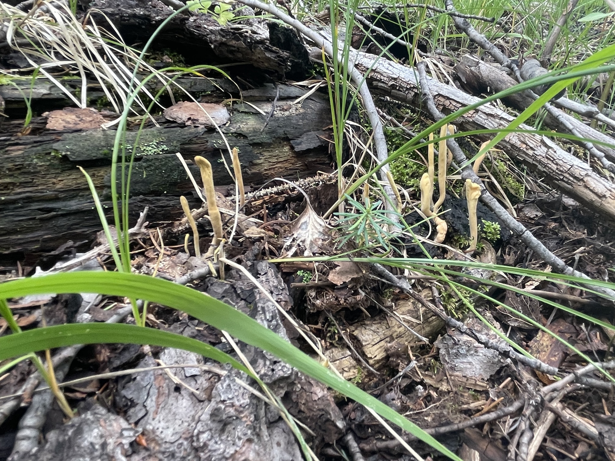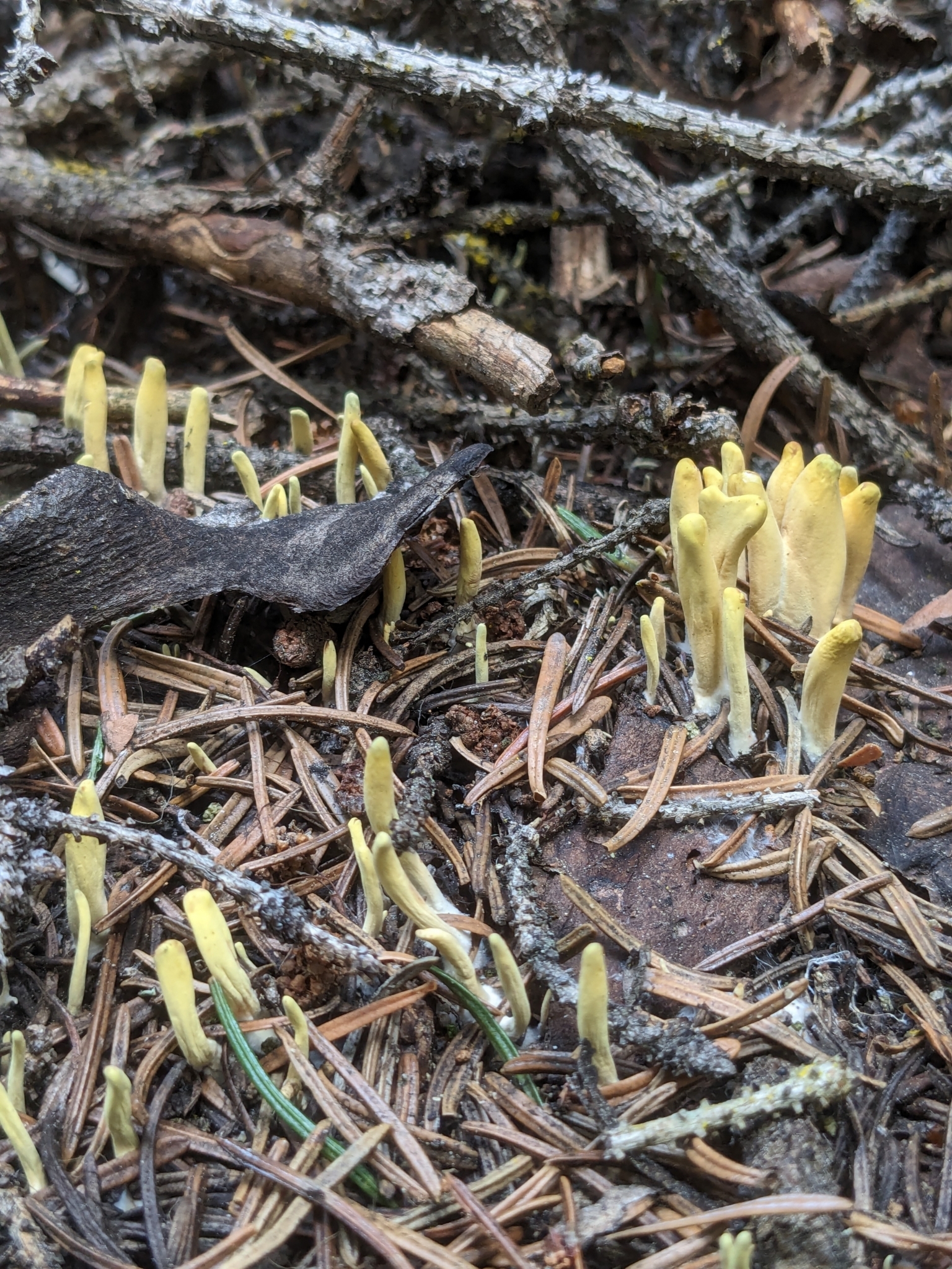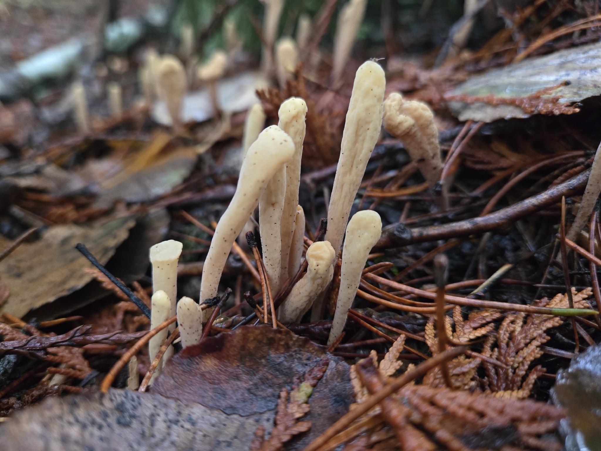 Die Sporokarpe sind 20–70 mm hoch und 1–4 mm im Durchmesser an der Basis, nach oben hin auf 3–18 mm im Durchmesser erweitert. Sie sind einfach, anfangs zylindrisch bis subzylindrisch, später schmal keulenförmig bis keulenförmig (clavate). Die Oberfläche ist behaart bis filzig (pubescent to tomentose), anfangs gelb-weiß bis orange-weiß, später grau-orange und schließlich blassbraun.Sporentragendes Gewebe: