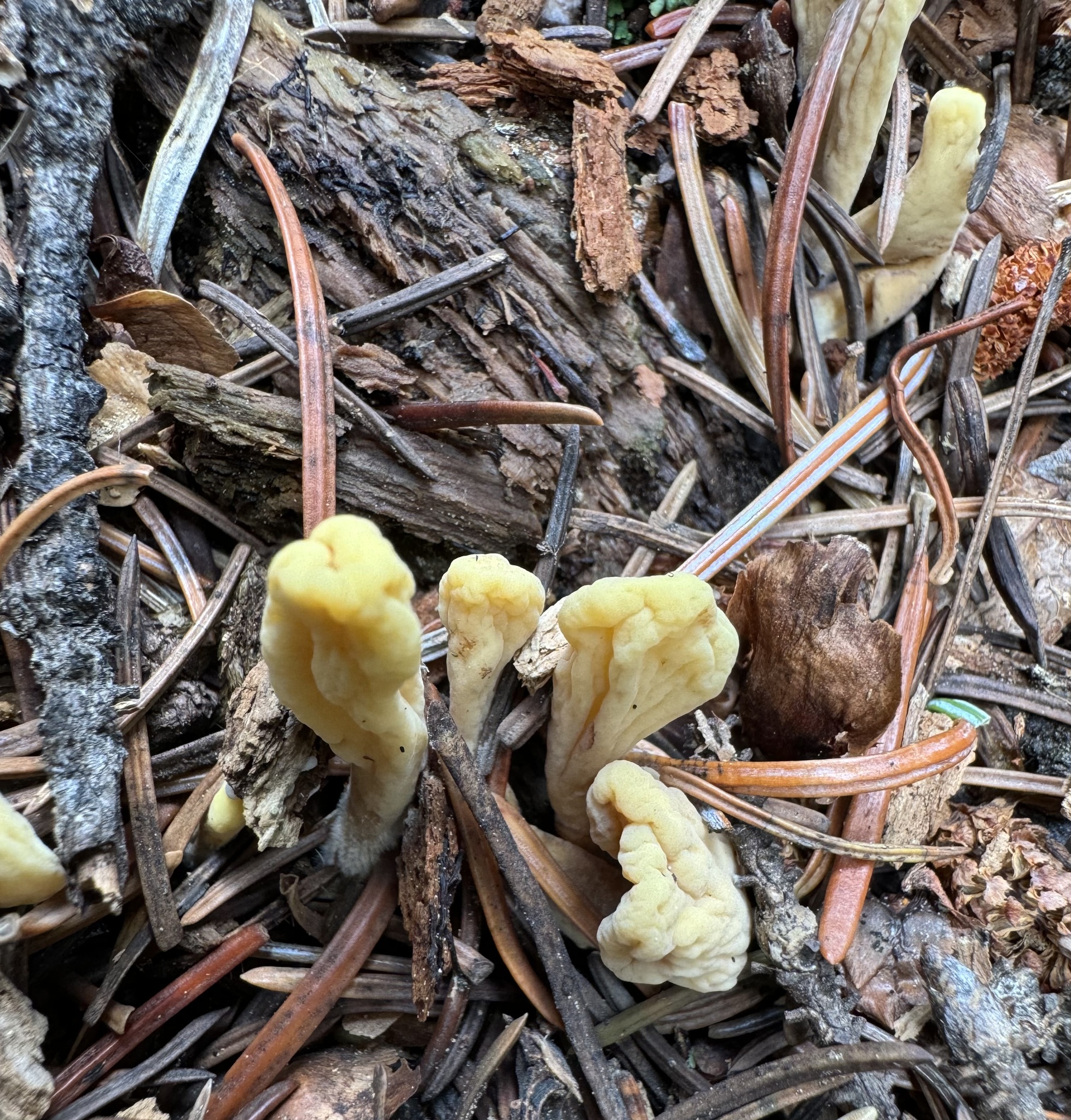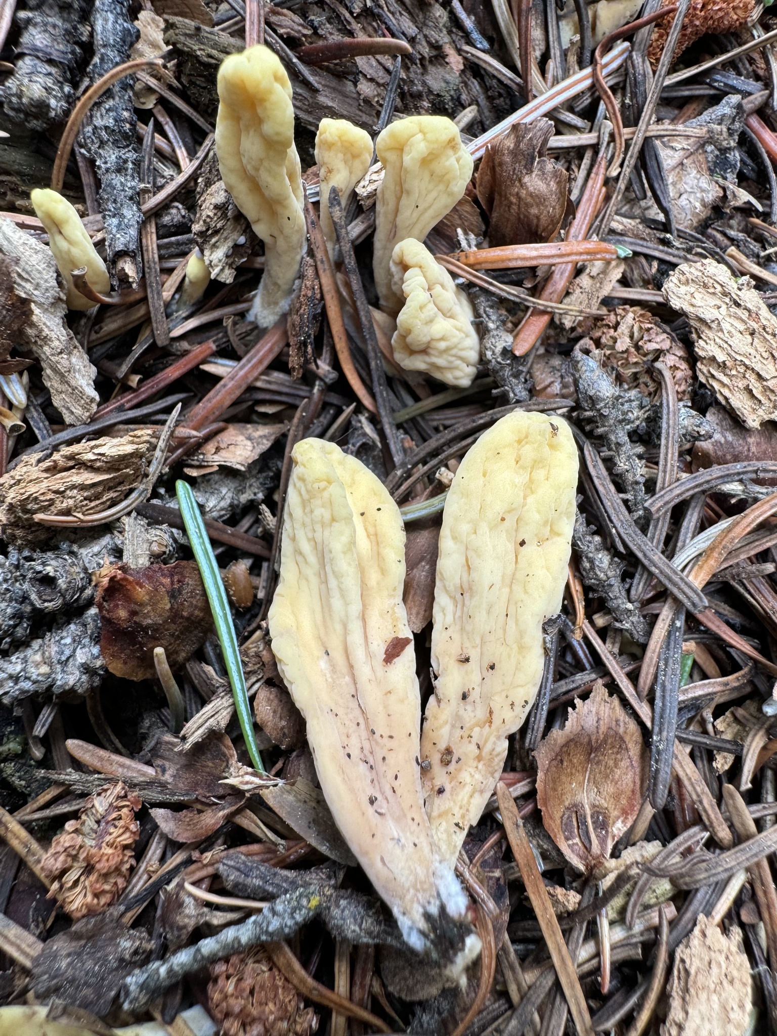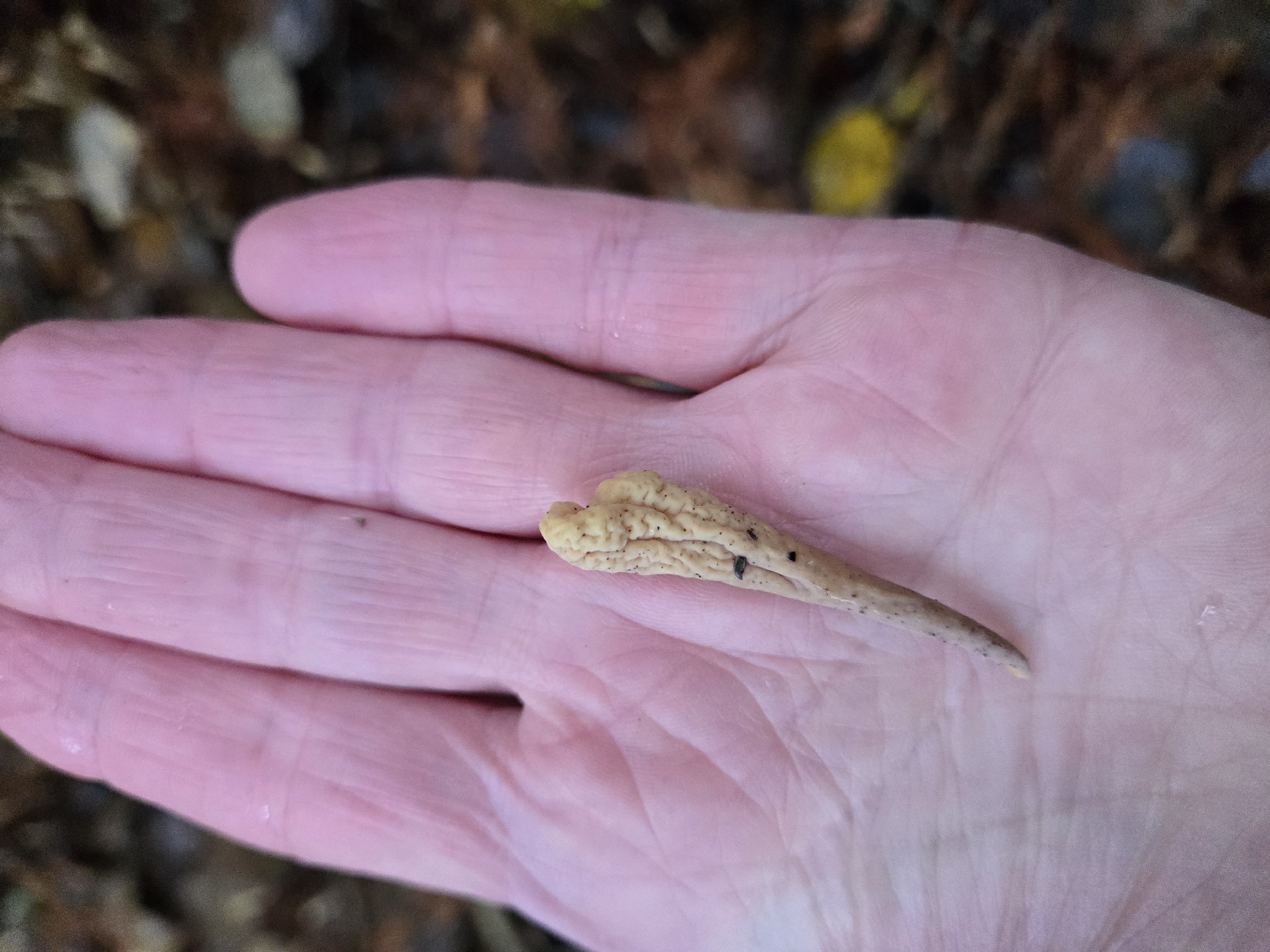 Das Gewebe ist anfangs glatt, wird dann längs runzelig (rugose to rugulose). Der Apex ist subakut, stumpf oder breit abgerundet, manchmal gegabelt oder gelappt bei Reife. Einige Sporokarpe sind fast turbanförmig (turbinate). Nach Frost färbt sich das Gewebe waldgrün bis dunkelgrün, während es bei Verletzungen unregelmäßig braun oder dunkelbraun wird, besonders auffällig in der Nähe der Basis.Kontext: