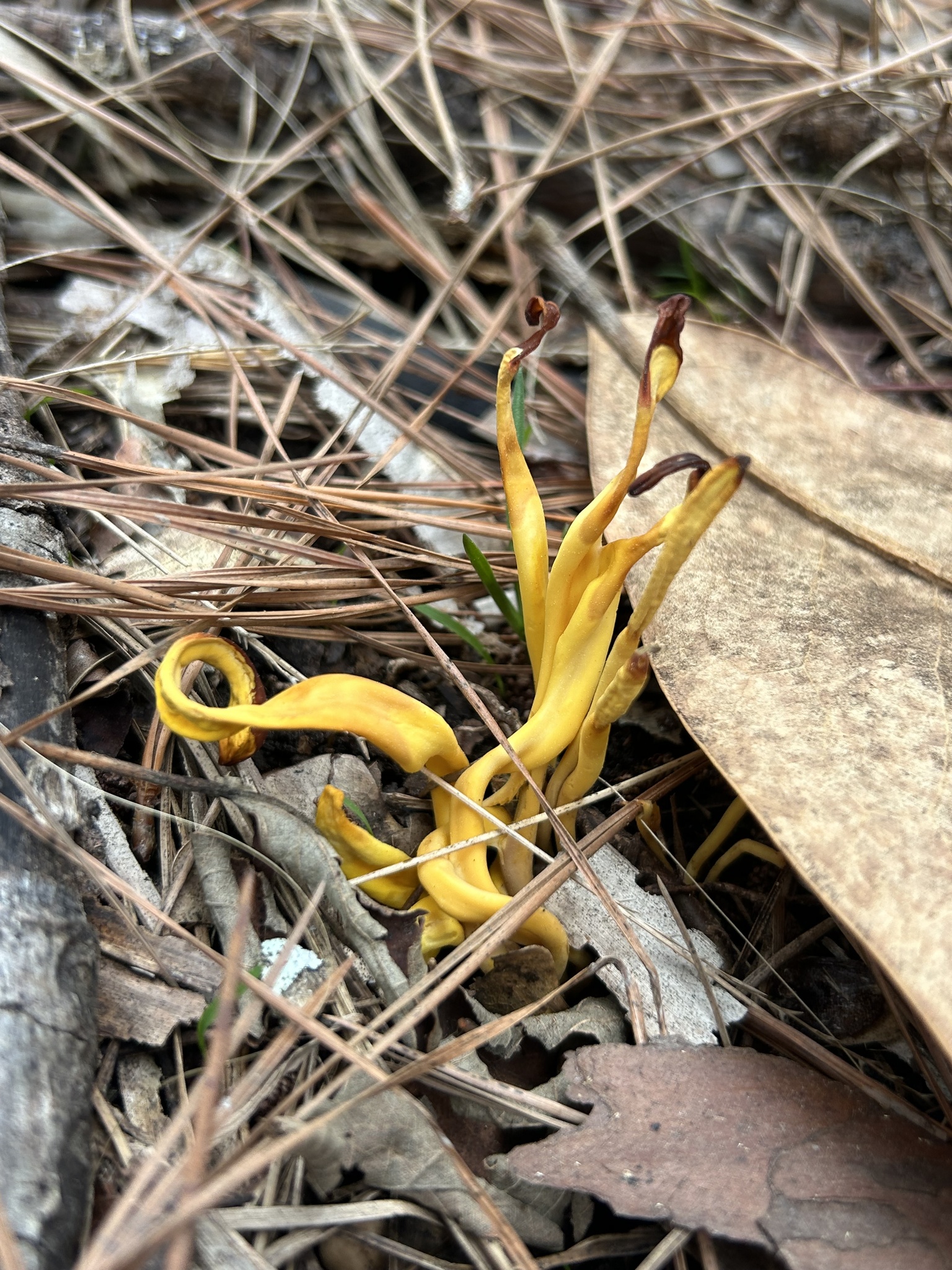 Fruchtkörper: Fruchtkörper rasenweise verbunden, ziemlich fest, gelb, bald hohl, bis 8 cm hoch. Keule fast spindelförmig, einfach und gezähnt, glatt, nach unten verschmälert, gleichartig, an der Spitze etwas dunkler.