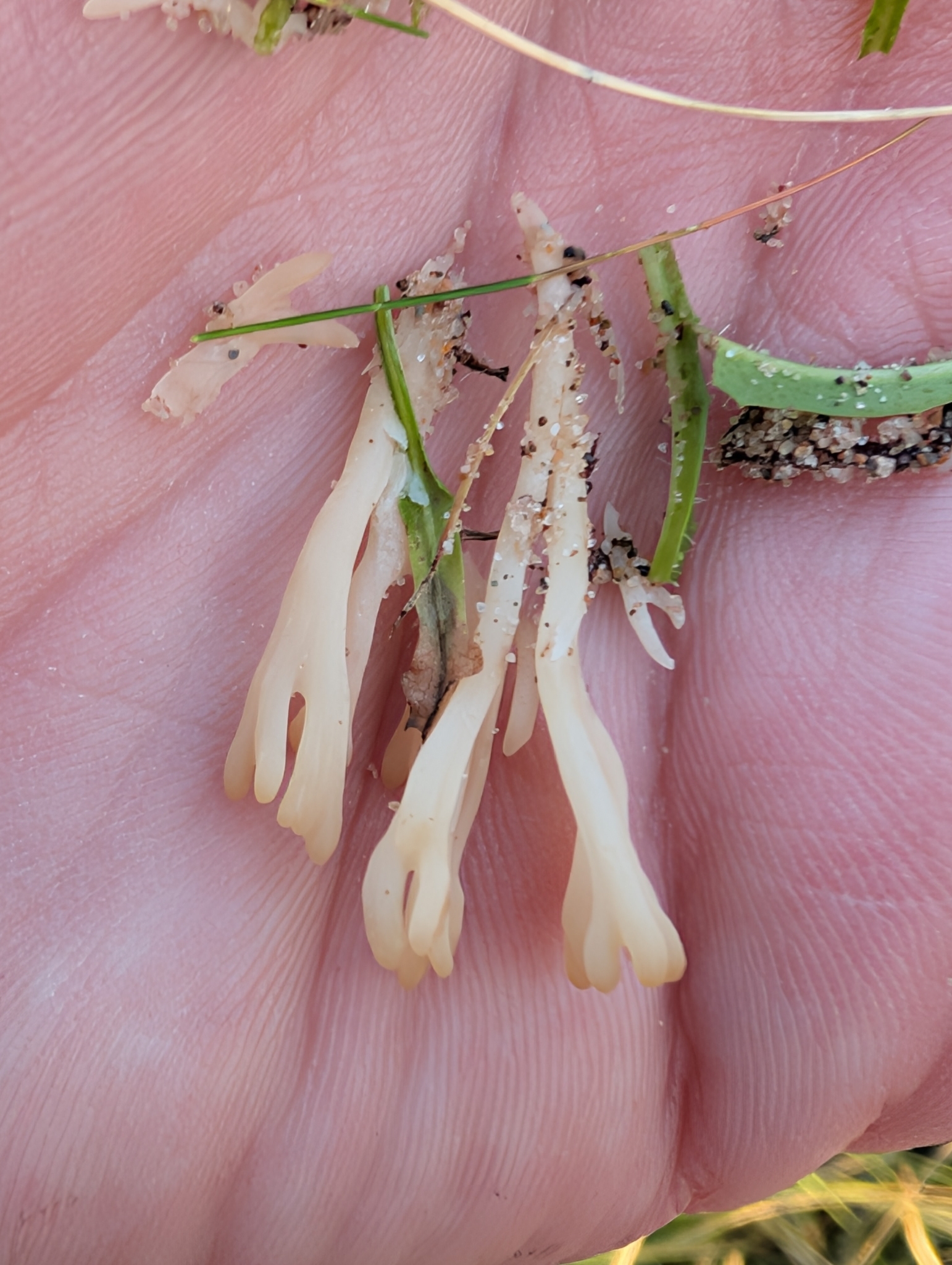 Fruchtkörper bis zu 7 cm hoch, bildet Büschel, stark vom Boden nach oben verzweigt; blass rosagrau. Das Fleisch ist zäh.Sporen 4–6 µm im Durchmesser, kugelig; weiß.