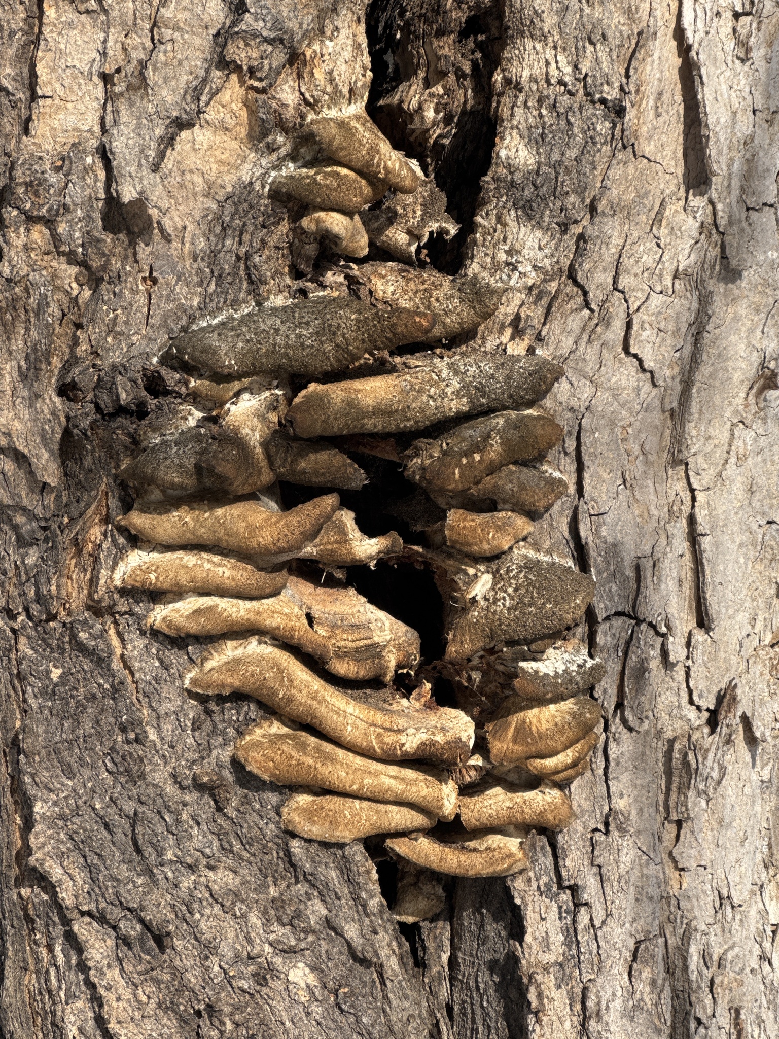 Fruchtkörper: Hüte sehr zahlreich, faserig-fleischig, zähe, blass, flach, treppenförmig übereinanderstehend, mit µmhren Hinterenden in einen dicken, soliden Körper verschmolzen, von Kopfgrösse. Stacheln sehr dicht, schlank, gleich gross.