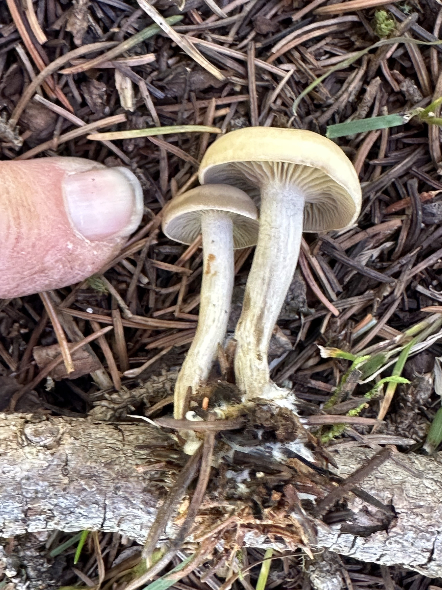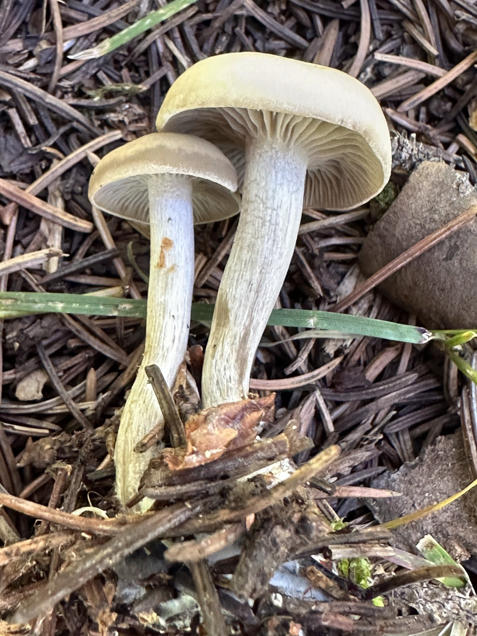 Stiel: zylindrisch, creme bis hellbraun, Basis mit Mycelfäden behaftet