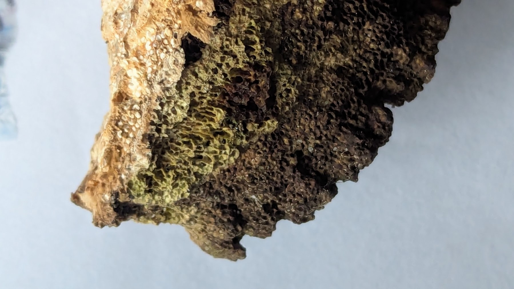 Oberfläche, Hülle: Poren verlängert, 4—7 mm lang, ziemlich weit, rund, ganz, ziemlich gleich gross, blass holzfarbig, im Alter mit bräunlichen Mündungen.