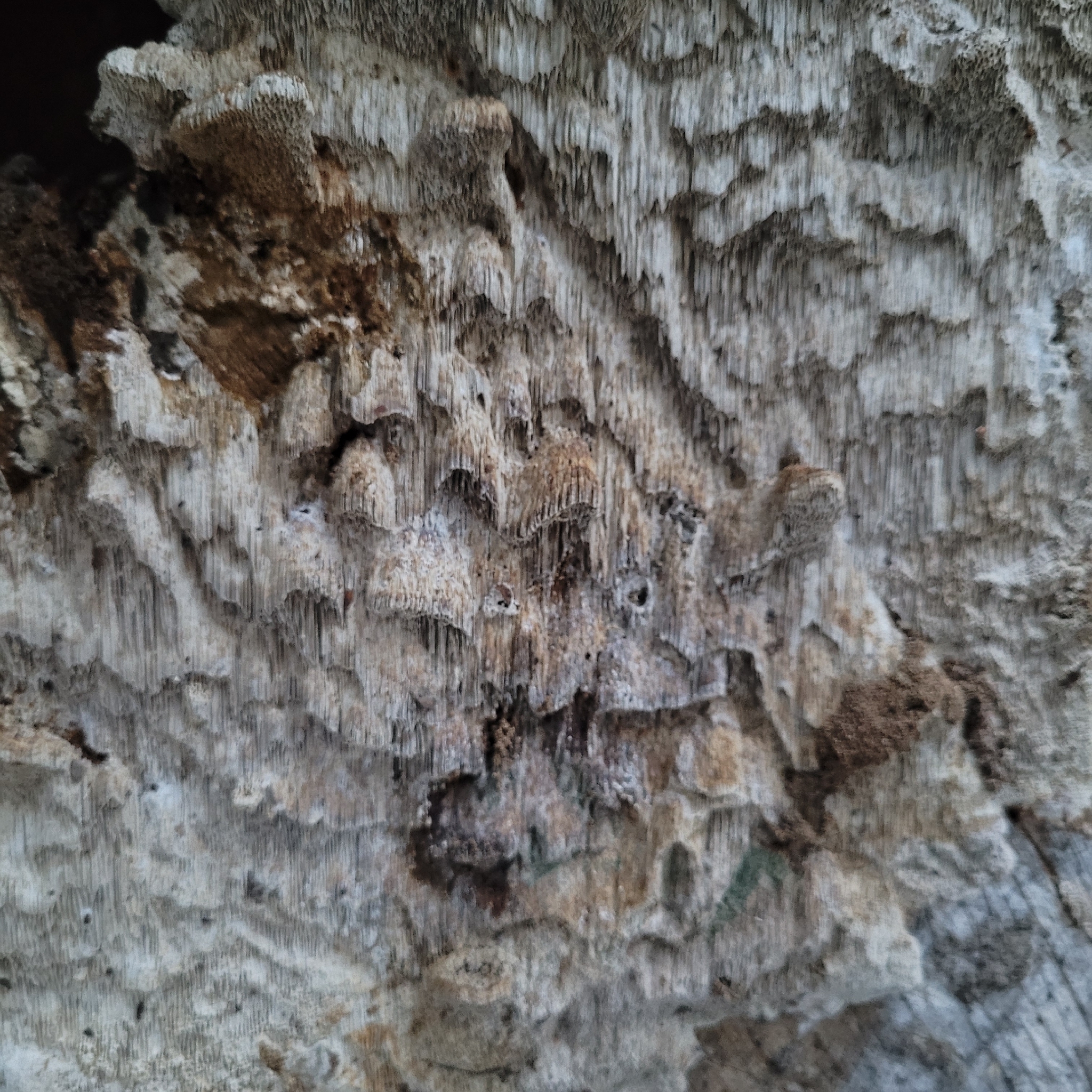 Fruchtkörper: Hut ausgebreitet zurückgebogen, plankonvex, etwas ungleich, eingebogen oder höckerig, mit starren, angedrückten Haaren bekleidet, faserig-holzig, am Rande scharf, leicht gekerbt, 2—8 cm lang und breit, am Grunde 12 bis 18 mm dick, blass braun, undeutlich gezont und gefurcht.