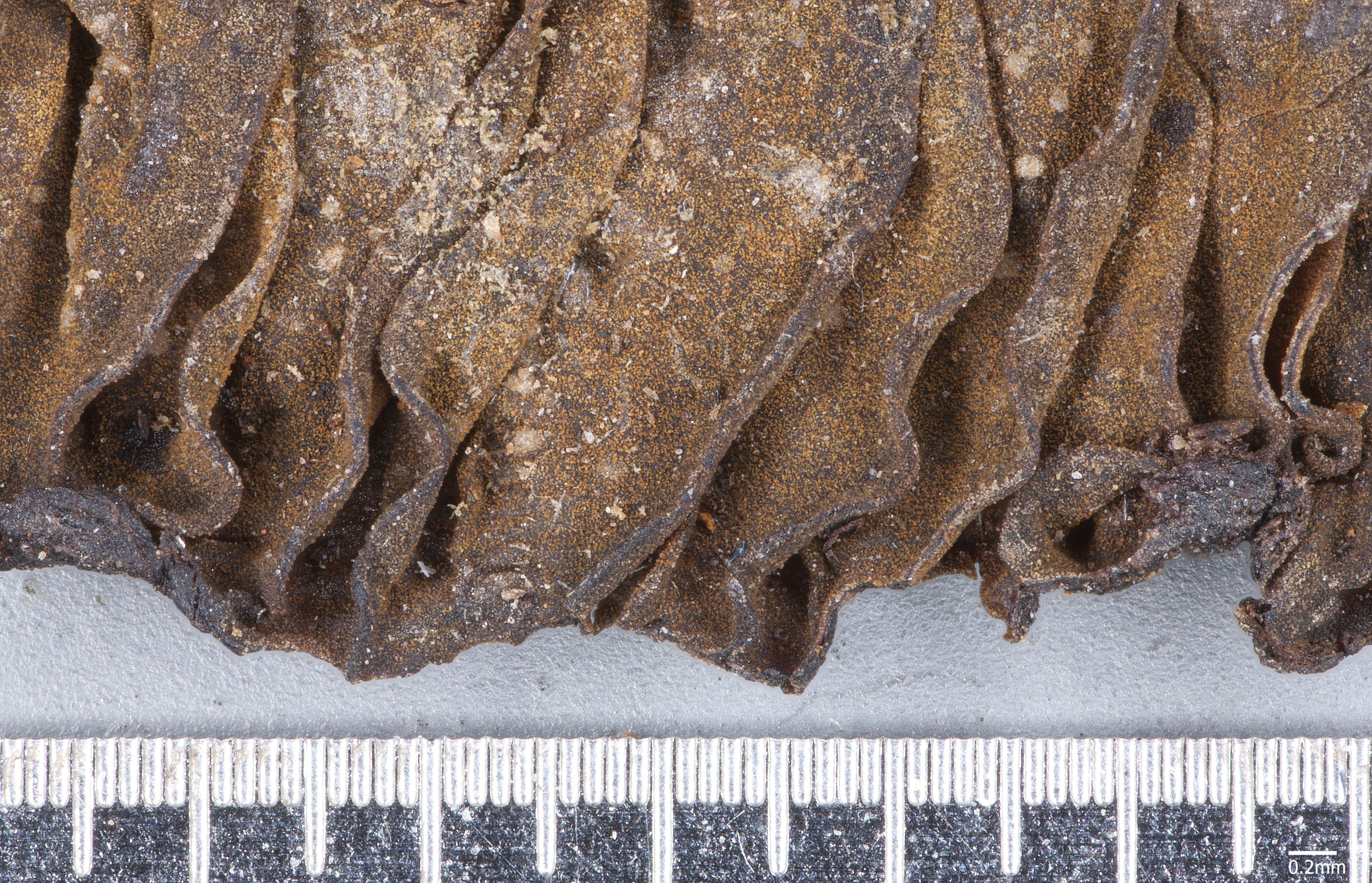 Lamellen: angewachsen, ockergelb, später dunkler braun, dicht stehend.