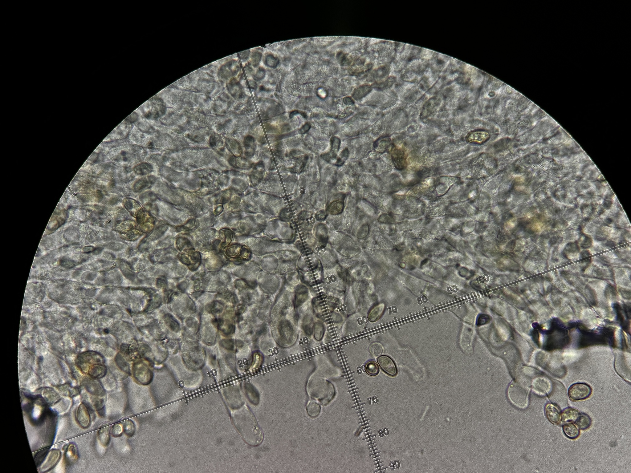 Lamellen: frei, bauchig, weiss-fransig, jung gelb, dann grau oder schwärzlich dunkel.