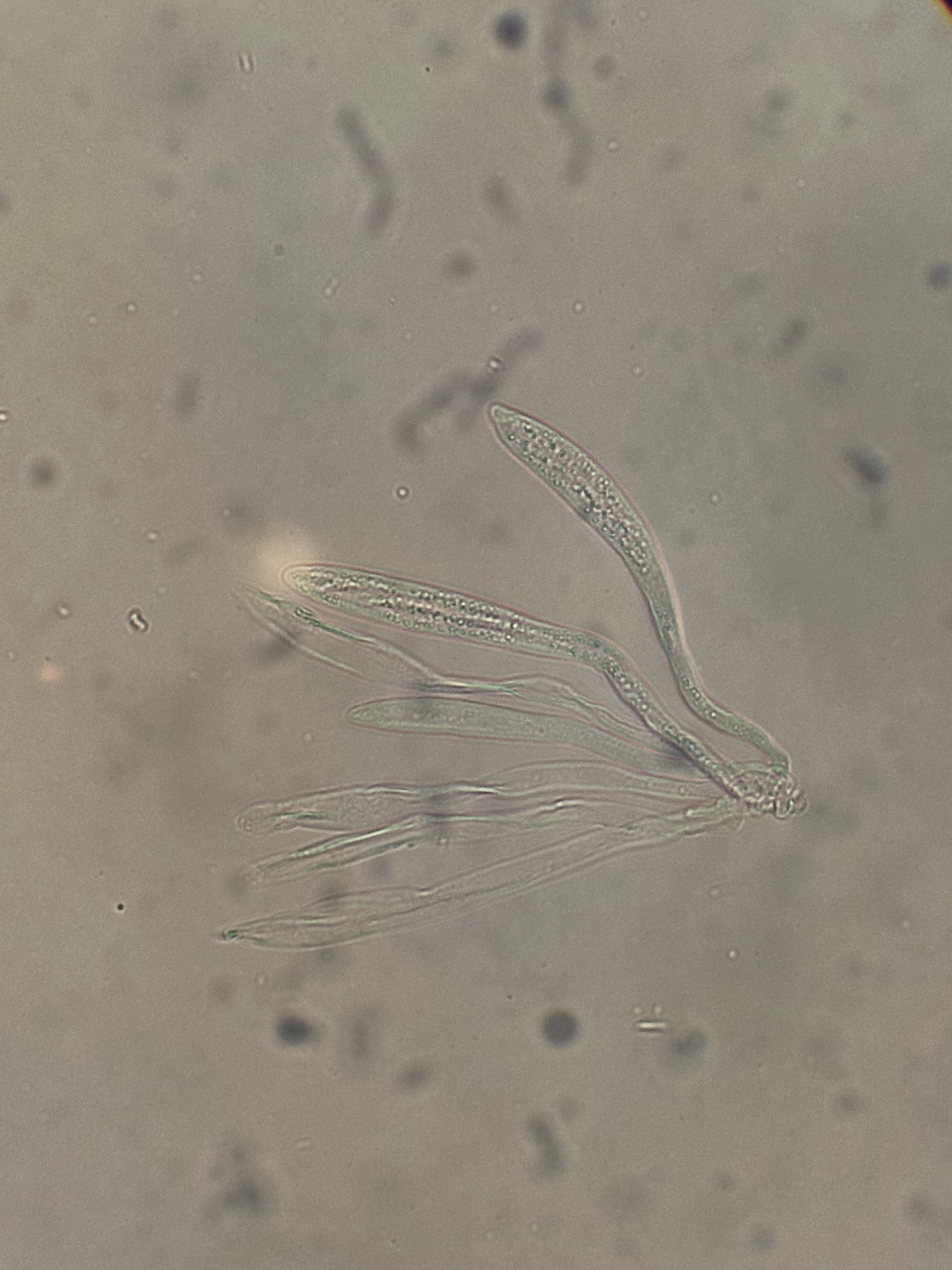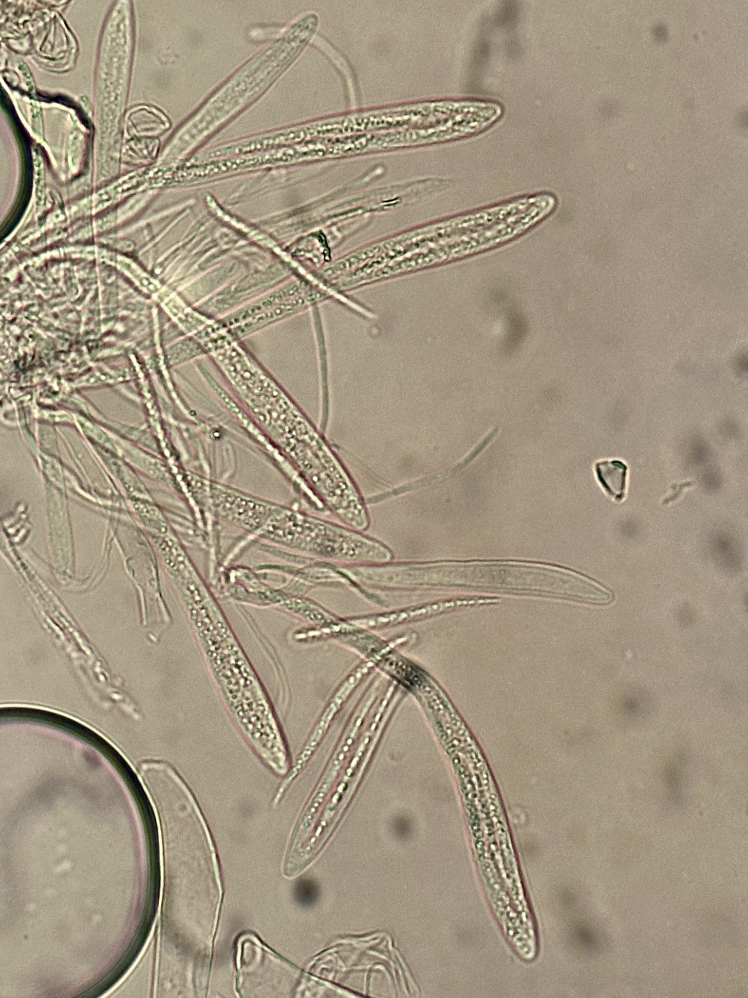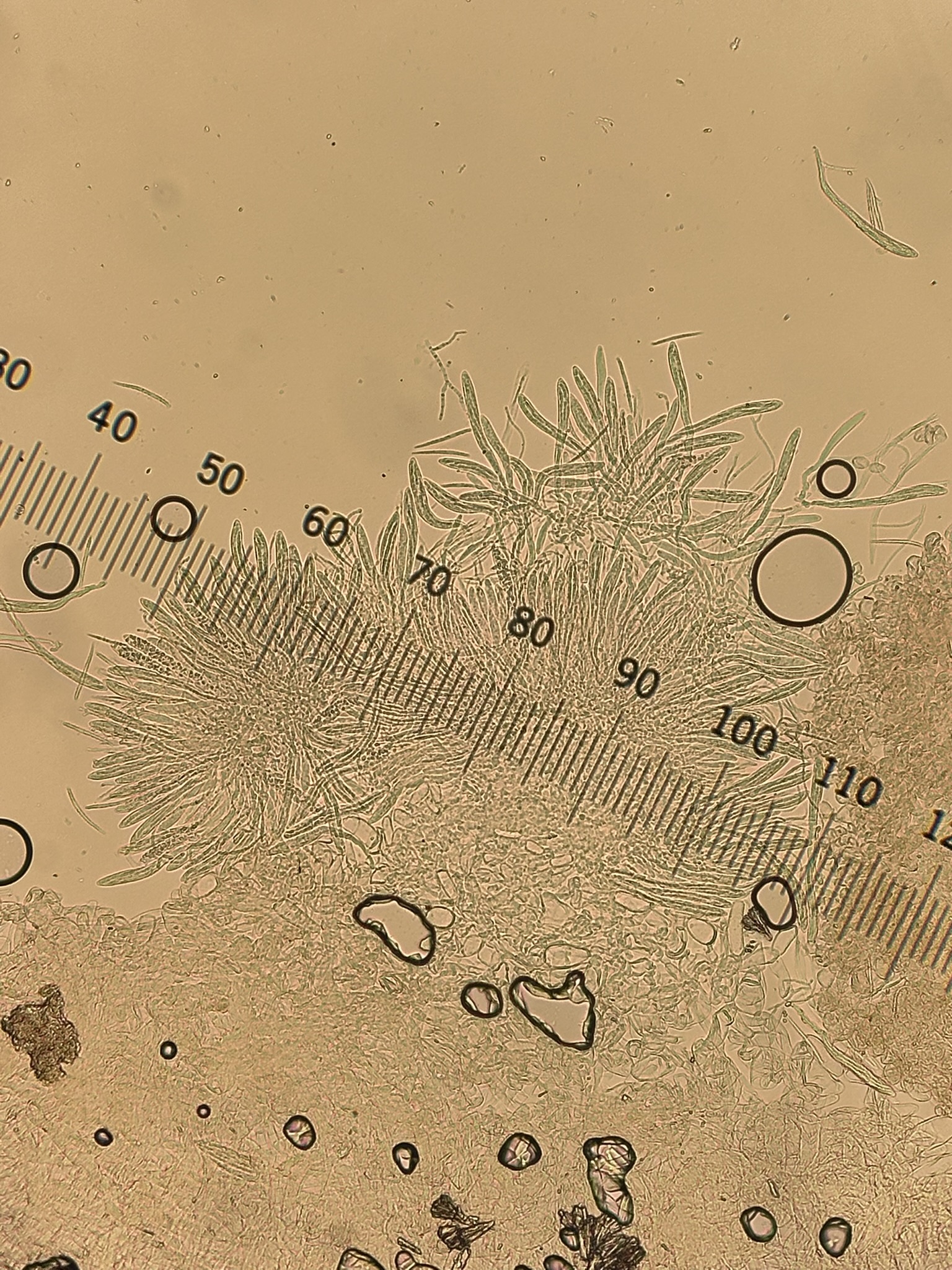Sporen: Schläuche spindel-keulenförmig, langgestielt, 100—130 µm lang, 9—11 µm breit, Sporen 35—40 µm lang, 2 µm breit, gebogen, mit stumpfen Enden, viele öltropfen enthaltend, farblos. Paraphysen fadenförmig, oben bogig gekrümmt, 1,5 µm breit.