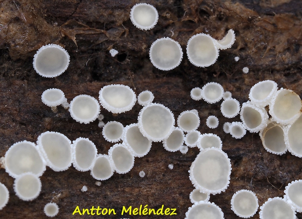 Fruchtkörper: zerstreut, klein, breit, weiss, gestielt, überall behaart, Scheibe schief, weiss.