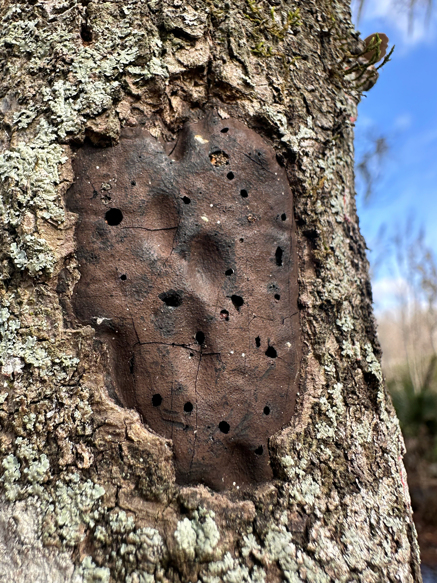 Fruchtkörper: Stroma weit ausgebreitet, oft ganze Zweige zur Hälfte oder auch ringsum auf weite Strecken umziehend, unter dem Periderm gebildet, später dieses abstossend und von seinen Lappen umgeben, in der Jugend bräunlich, reif schwärzlich, zuletzt rissig, etwa 1 mm dick, im Innern anfangs weisslich. Fruchtkörper in das Stroma eingesenkt, dichtstehend, einschichtig, mit sehr kurzen, punktförmigen, rundlichen oder vierkantigen Mündungen.