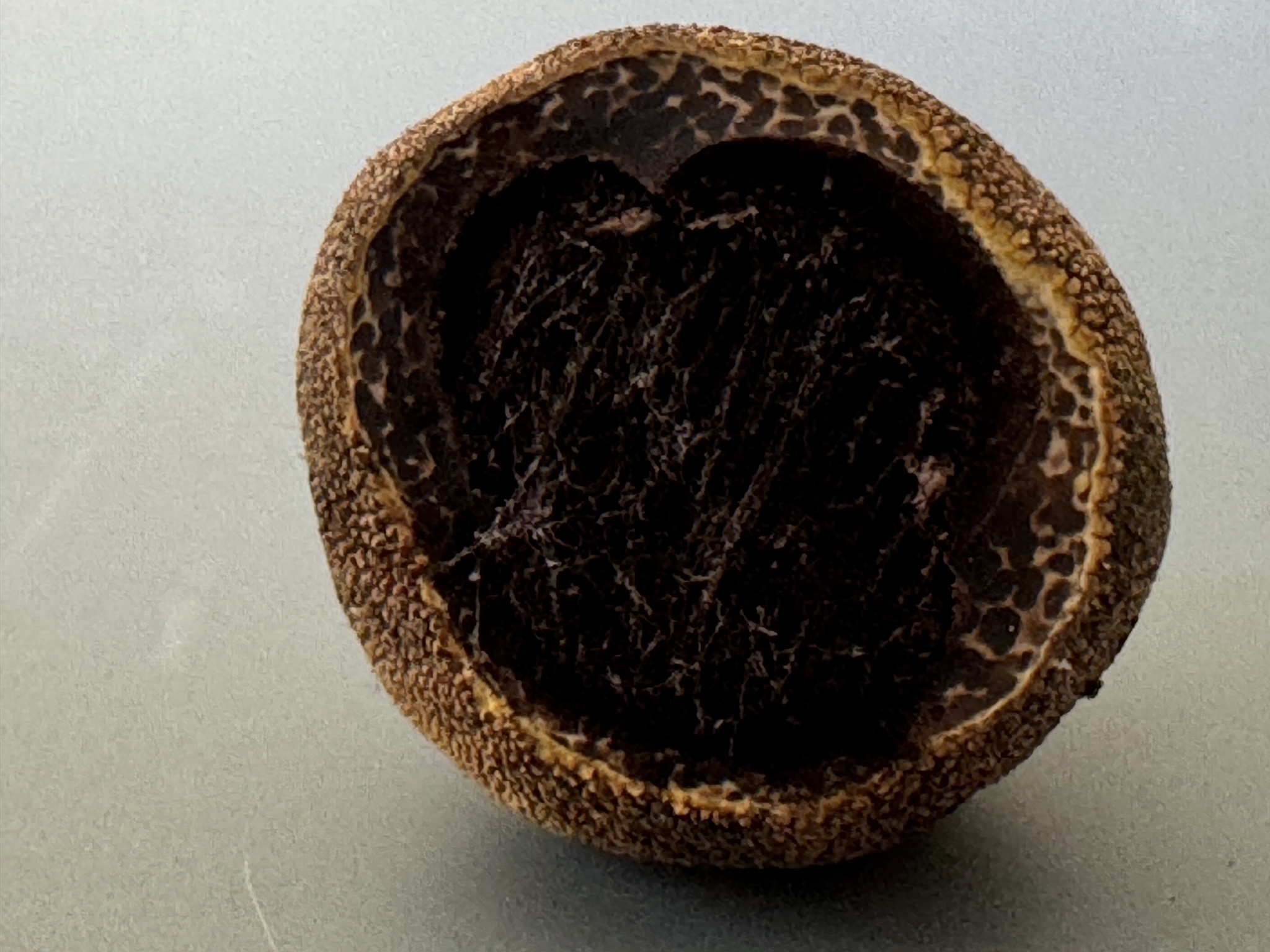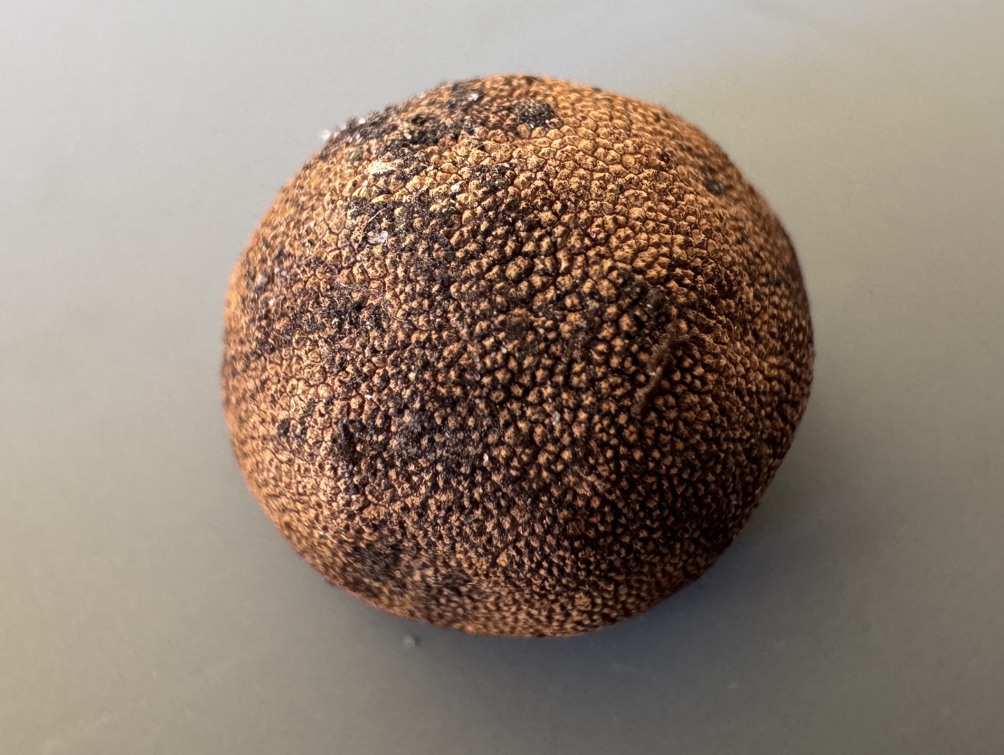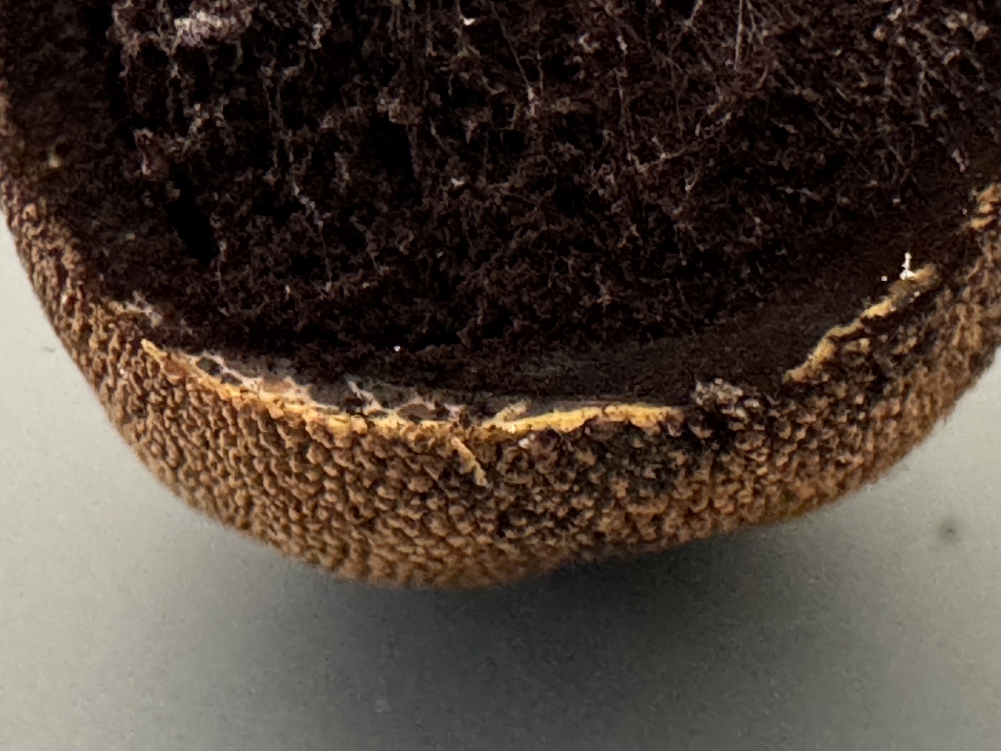 Fruchtkörper: Fruchtkörper sehr regelmässig kugelig bis ellipsoidisch , haselnuss- bis walnussgross, von einer aus Wurzelzweigen und Mycelhyphen gebildeten Hülle umschlossen, mit gelbbrauner bis rötlichbrauner Oberfläche. Peridie 2—3 mm dick. Rinde aus dicht stehenden grösseren oder kleineren oft pyramidenförmigen und ziemlich stark vorspringenden Höckern bestehend, deren Durchmesser bis etwas über 1 mm erreichen kann. Innenschicht der Peridie nach aussen zu gelblich, nach innen allmählich in Rosa bis Bräunlich übergehend, von schmalen, anastomosierenden, luftführenden Adern durchzogen, welche ziemlich regelmässige polyedrische oder rundliche Felder begrenzen.