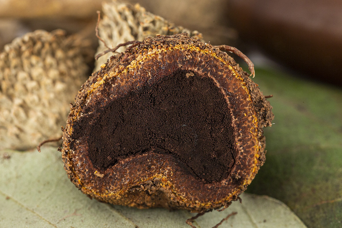 Sporen: Sporenmasse reif schwarz, von grauen, radial verlaufenden, sterilen Adern durchsetzt; Capillitium aus farblosen Fäden bestehend. Asci zwei- bis achtsporig. Sporen kugelig, reif sehr dickwandig, undurchsichtig schwarz, mit unebener, kleinwarziger Oberfläche, 18—21 µm dick.