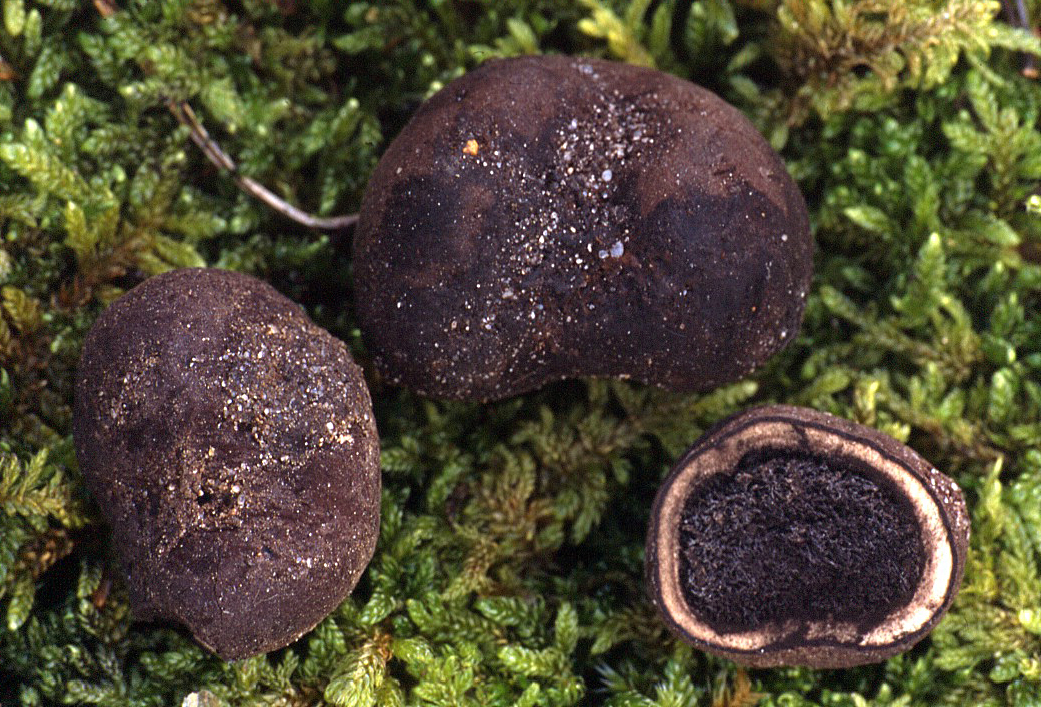 Sporokarpe 2-3 cm breit, leicht abgeflacht mit niedrigen Vertiefungen, bedeckt von einer dunklen, festen erdigen Kruste aus geschwärzter Mykorrhiza und spärlichem dunkel rotbraunem Myzel. Rinde (Cortex) bei reifen Exemplaren fast schwarz mit einem Hauch von Dunkelbraun, undeutlich und fein warzig, bei den meisten Exemplaren mit einem großen, glatten, gut abgegrenzten Fleck mit grün verfärbtem Myzel, spröde und hart, ablösbar vom Peridium. Peridium 1,5-2 mm dick, blass silbergrau, wenn frisch, aber bald schiefergrau, weich. Gleba pulverig im reifen Zustand, schwarz mit einem deutlichen olivfarbenen Schimmer. Geruch nicht ausgeprägt. Cortex 250-350 µm dick mit breiten, flachen Warzen, hervorstehender Teil 100 µm hoch, 200 µm breit, bestehend aus pseudoparenchymatischem Gewebe, dunkelbraun, Wände 1-2 µm dick, subparallele Hyphen zwischen den Warzen 4-5 µm breit und nur leicht heller braun. Peridium klar vom Cortex unterschieden, Hyphen blassbraun, hyalin, dickwandig, 3-4 µm breit im äußeren Teil, lockerer gewebt und 6-7 µm breit im Inneren. Asci nicht beobachtet. Kapillitium spärlich, aus 2 µm dicken, hyalinen Hyphen, die mit olivfarbenem Pigment überzogen sind. Sporen kugelig, 21-25 µm im Durchmesser, dunkelbraun bis fast schwarz, dicht besetzt mit gedrängten, niedrigen Stacheln.