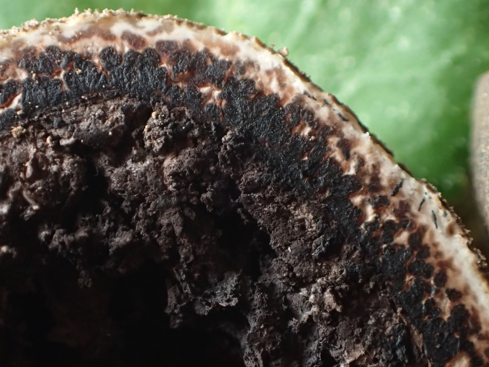 Inneres, Innenmasse: Innenmasse bei der Reife schwarz, mit wenig deutlichen sterilen Adern. Capillitium locker, seidig-weiss.