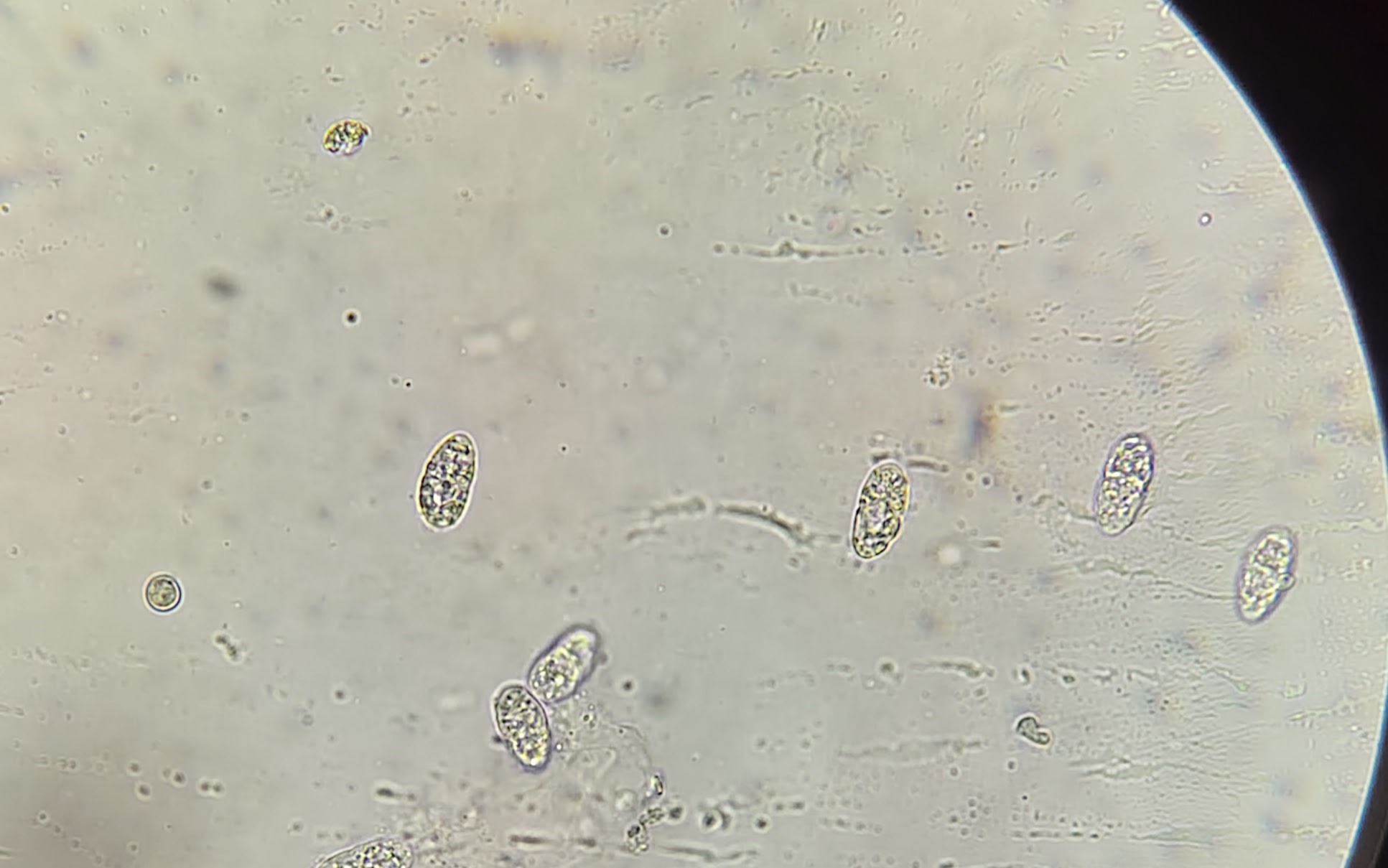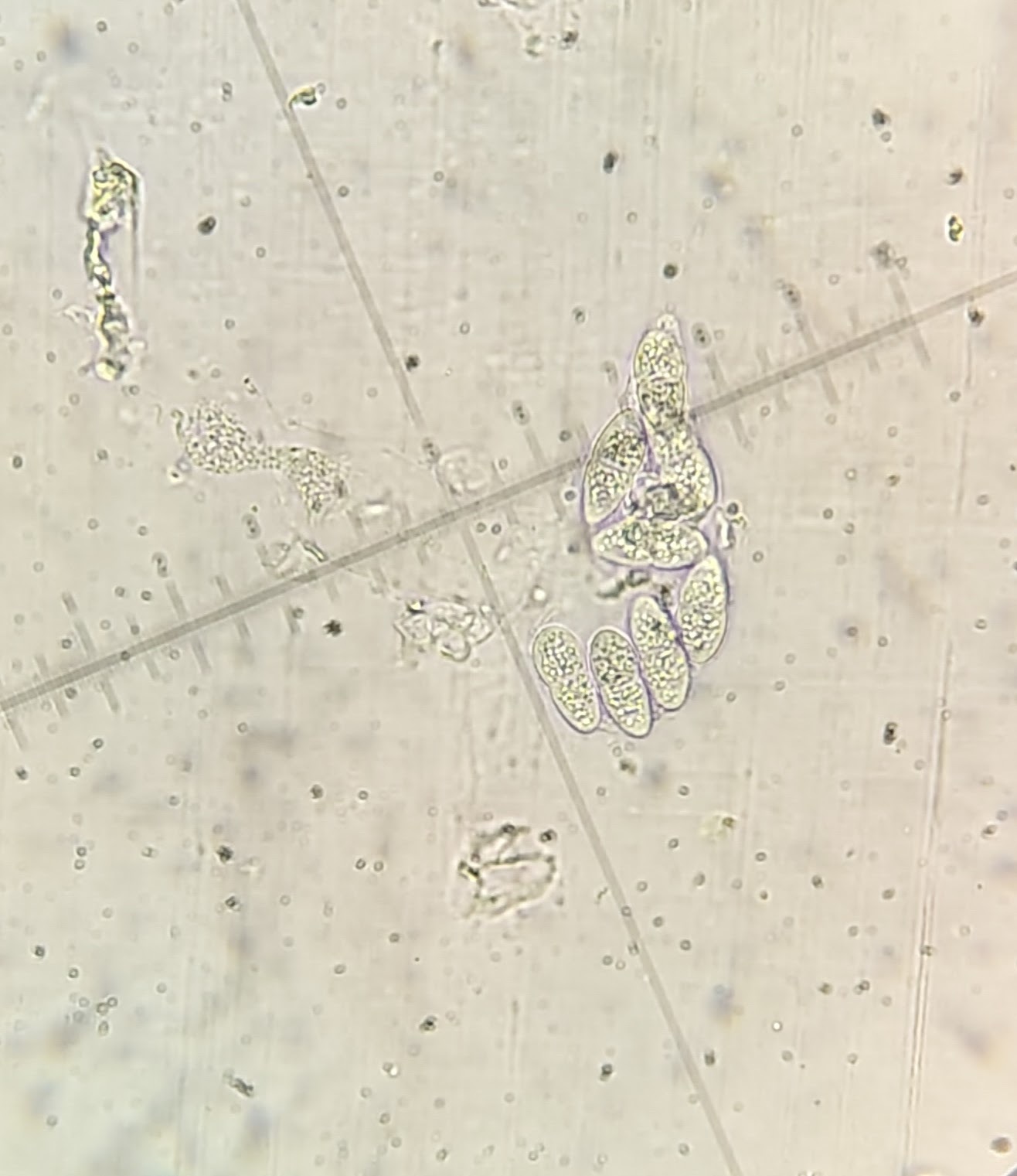 Sporen: Schläuche keulig, am Scheitel abgerundet, sehr kurz gestielt, 50—55 µm lang, 15 µm dick, achtsporig. Sporen zwei- oder fast dreireihig, länglich- ellipsoidisch, zweizeilig, farblos, 15 µm lang, 6 - 7,5 µm dick.