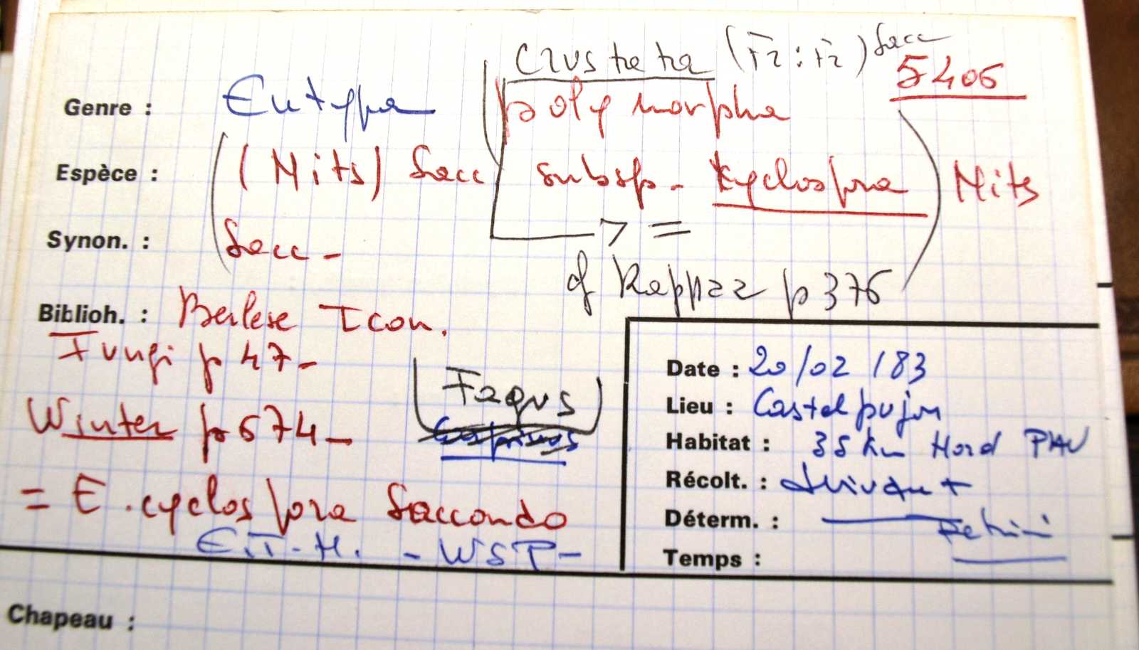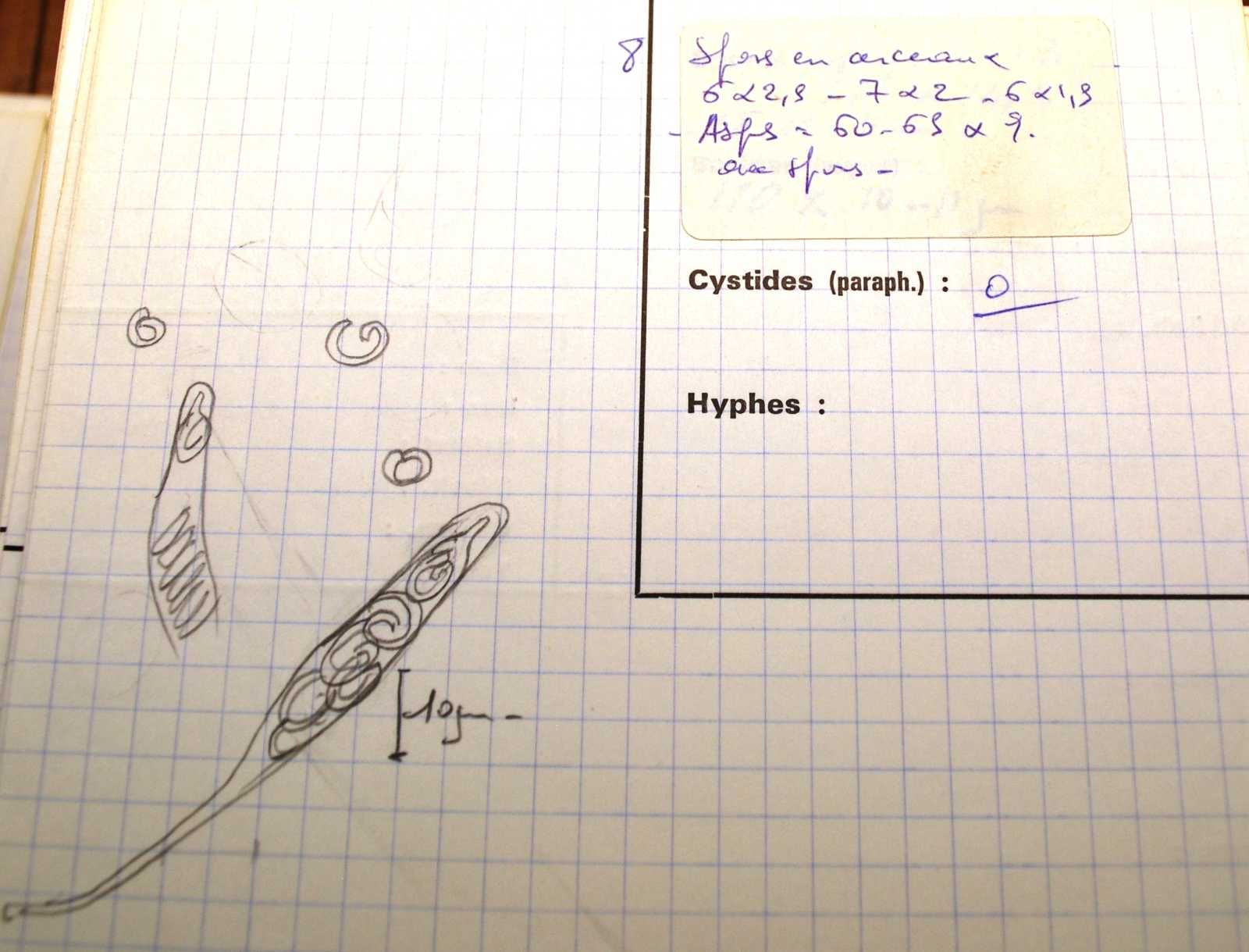 Sporen: Schläuche schmal keulig, sehr lang gestielt, achtsporig, im sporentragenden Teil 32 µm lang, 4—5 µm dick. Sporen in dem an beiden Enden verjüngten Schlauchlumen fast zweireihig, zylindrisch, fast gerade, bräunlich, 6—12 µm lang, 2 µm dick.