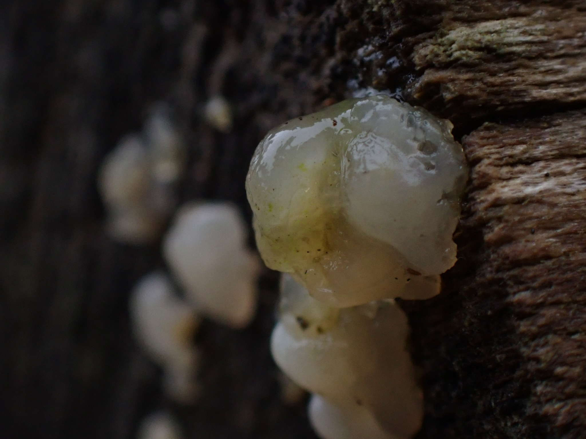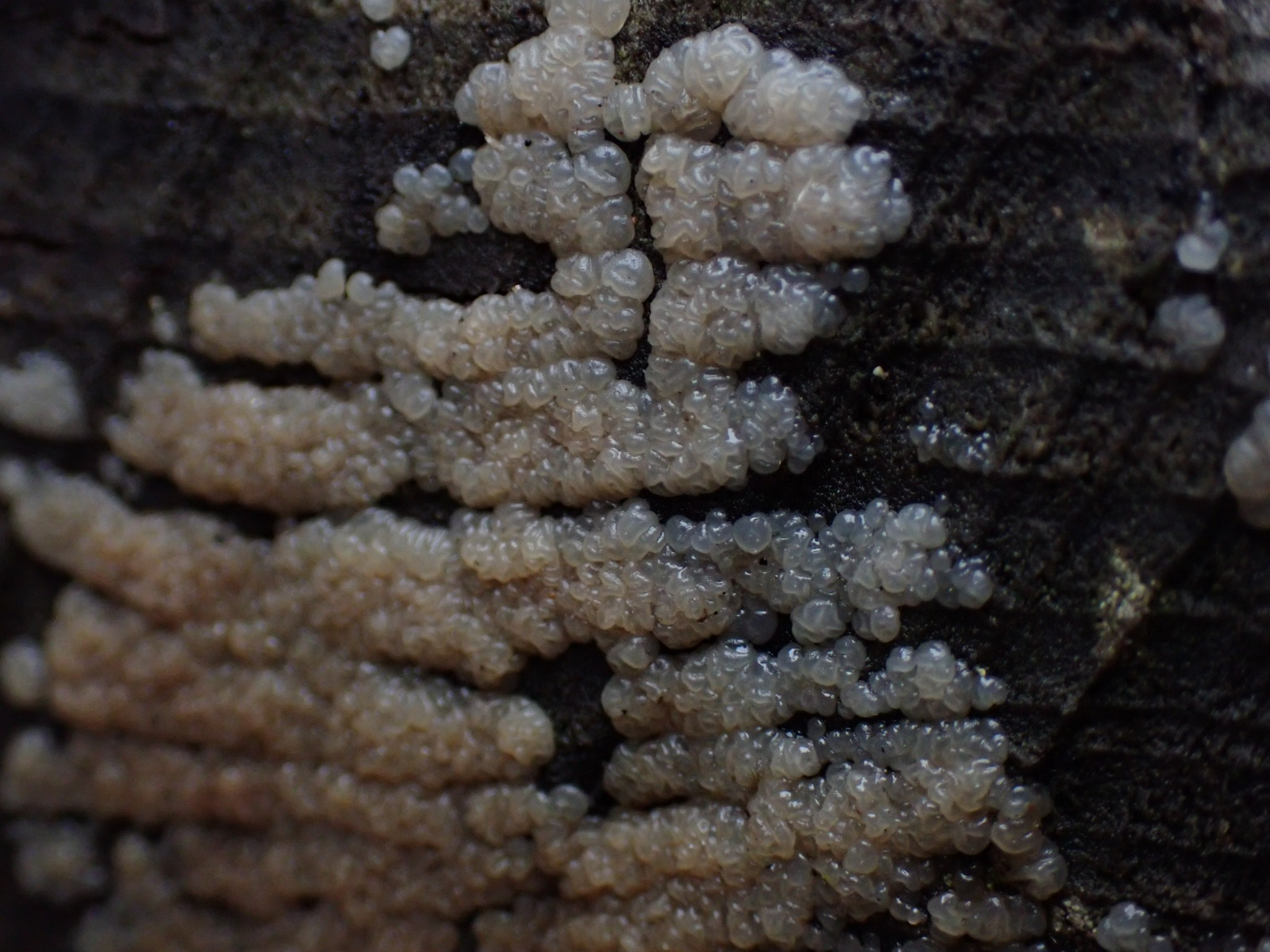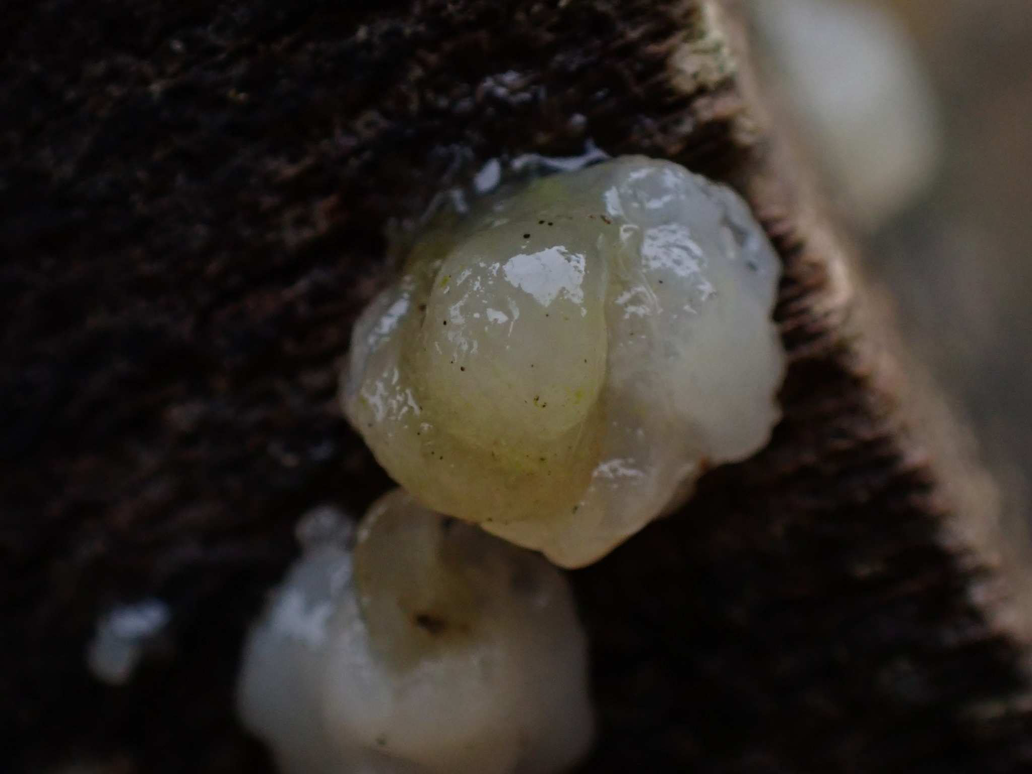 Fruchtkörper: Fruchtkörper rundlich, 2—3 cm breit, oft weithin durch Zusammenfliessen sich verbreitend, milchweiss oder weisslich, innen glasartig durchsichtig, oberseits anfangs fast glatt, später mit seicht gewundenen Furchen, mit schmalem Grunde aus der Rinde vorbrechend.