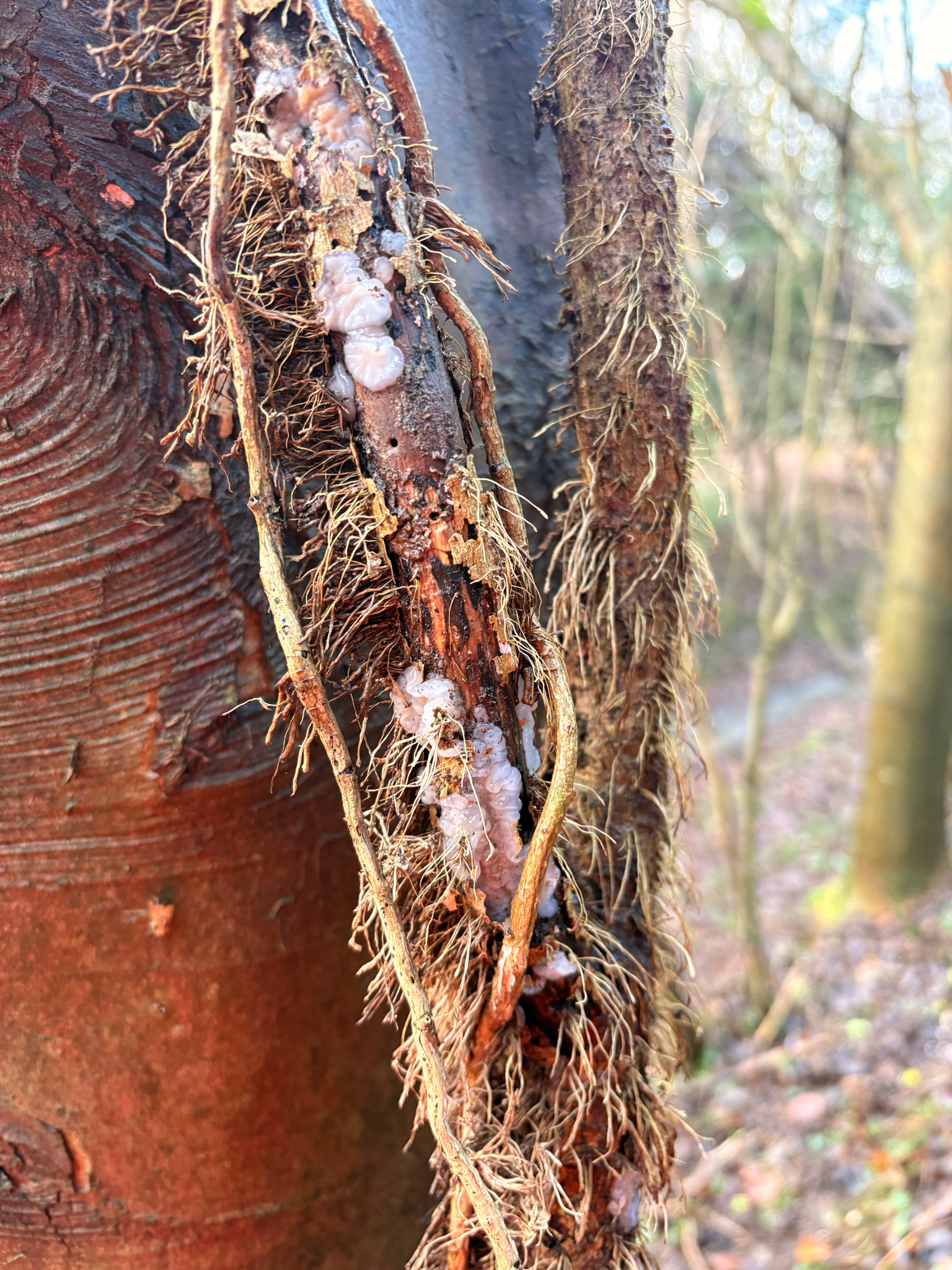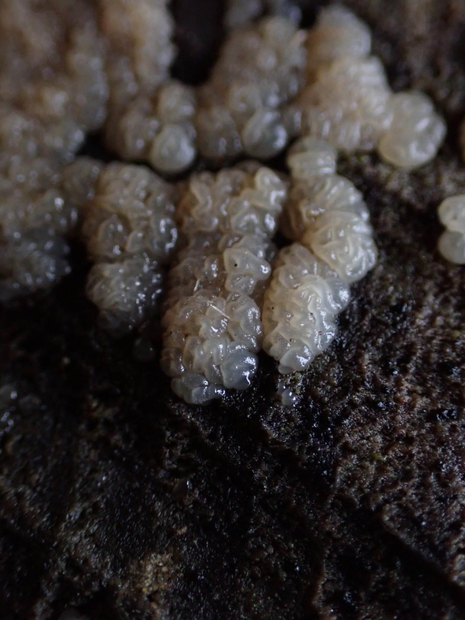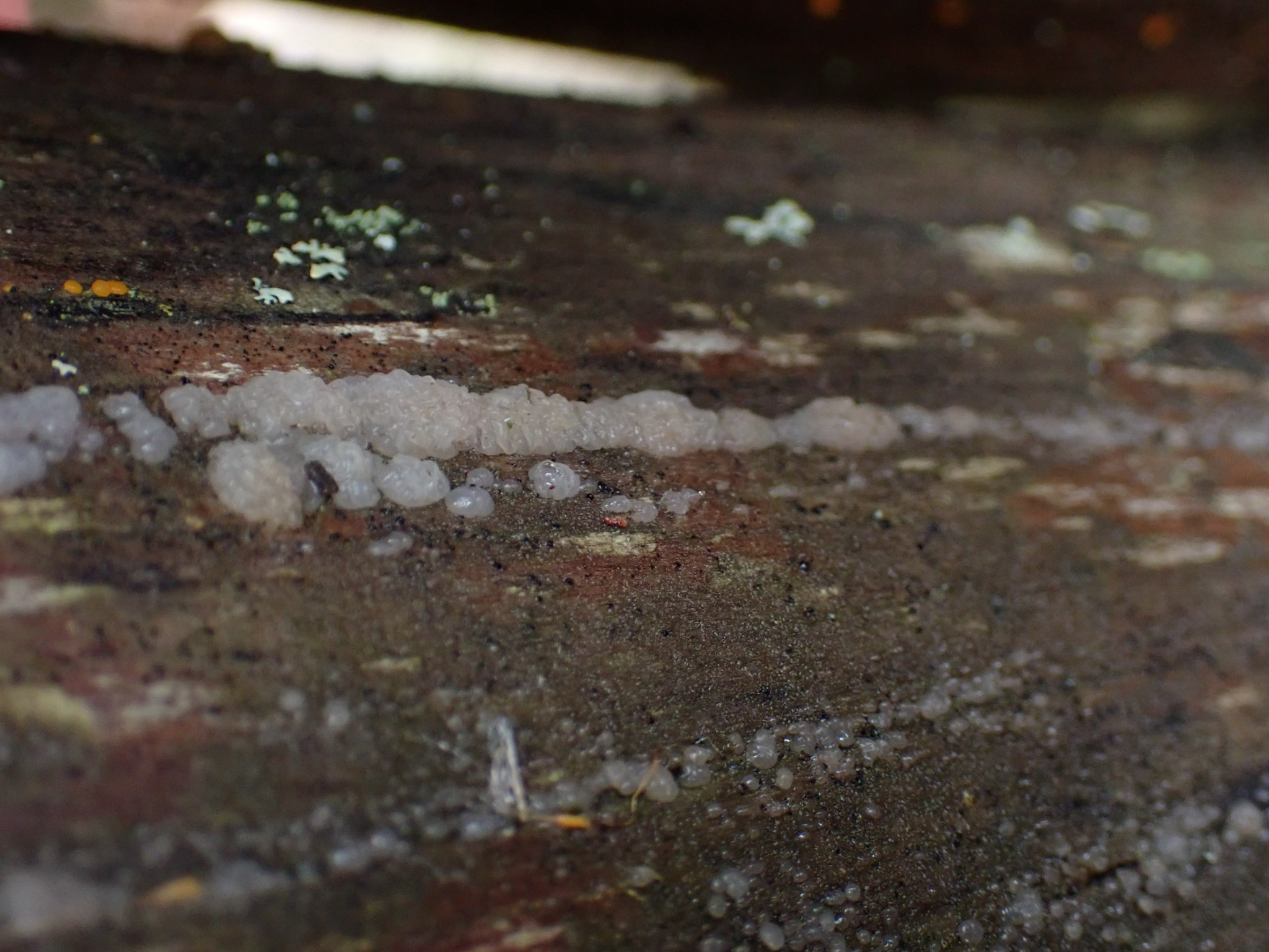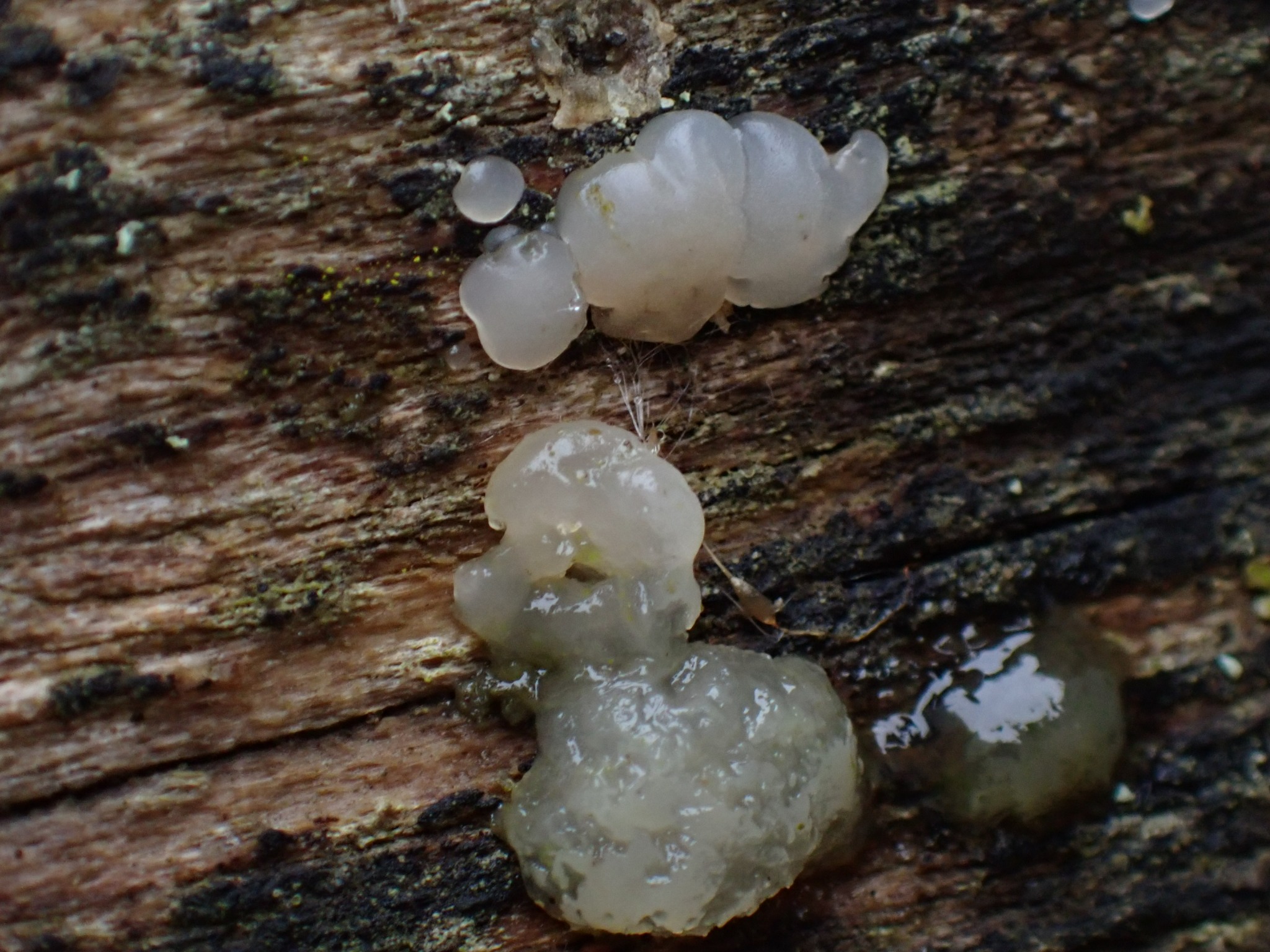 Fruchtkörper: Fruchtkörper rundlich, 2—3 cm breit, oft weithin durch Zusammenfliessen sich verbreitend, milchweiss oder weisslich, innen glasartig durchsichtig, oberseits anfangs fast glatt, später mit seicht gewundenen Furchen, mit schmalem Grunde aus der Rinde vorbrechend.