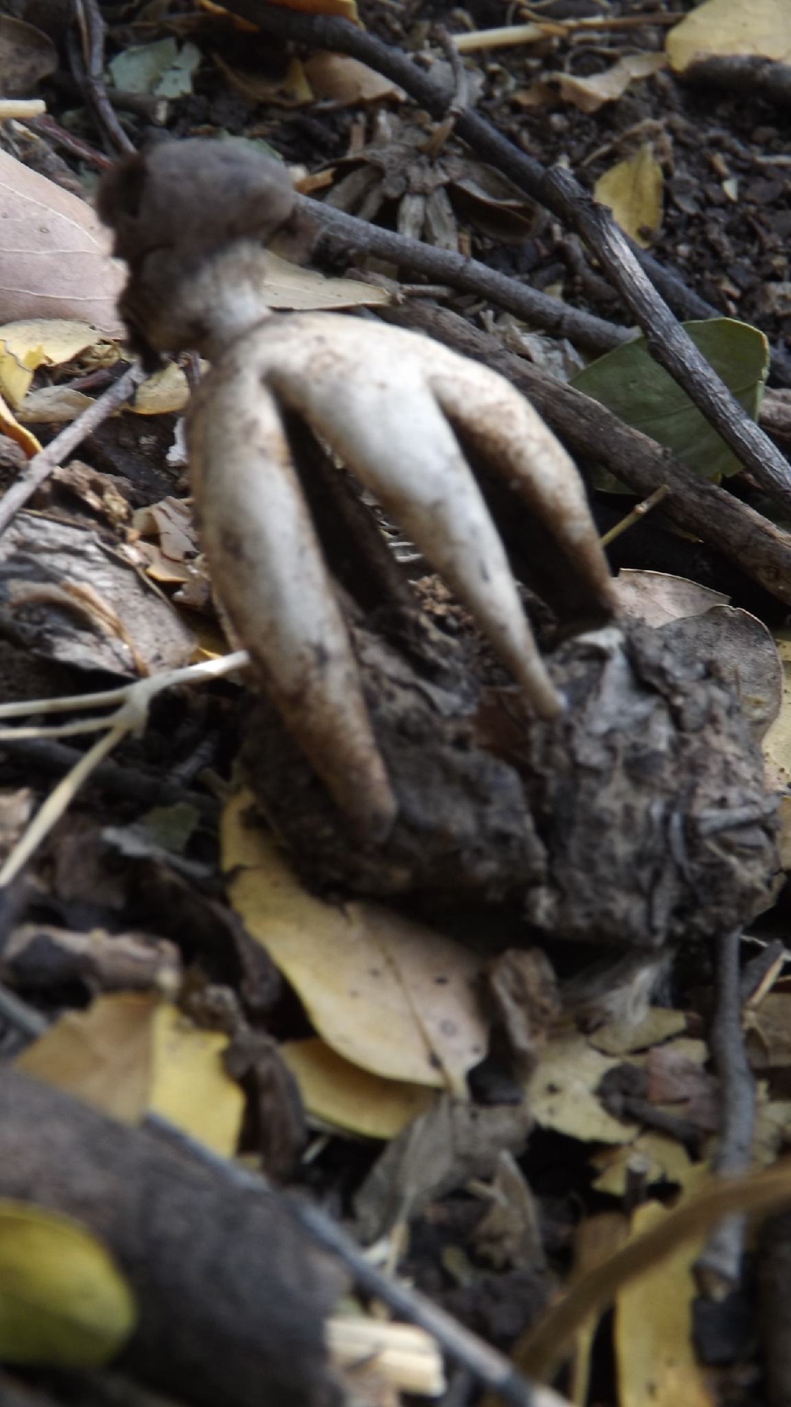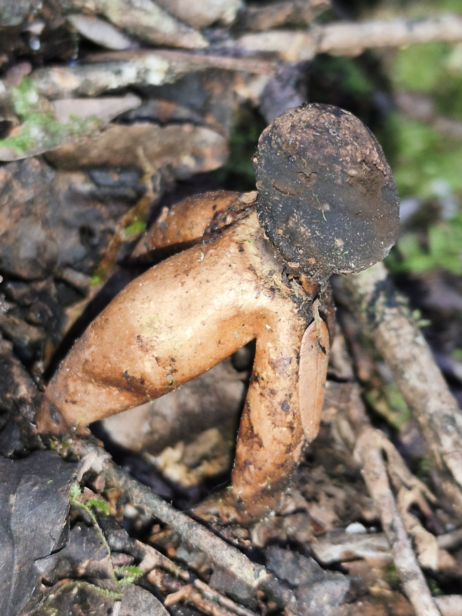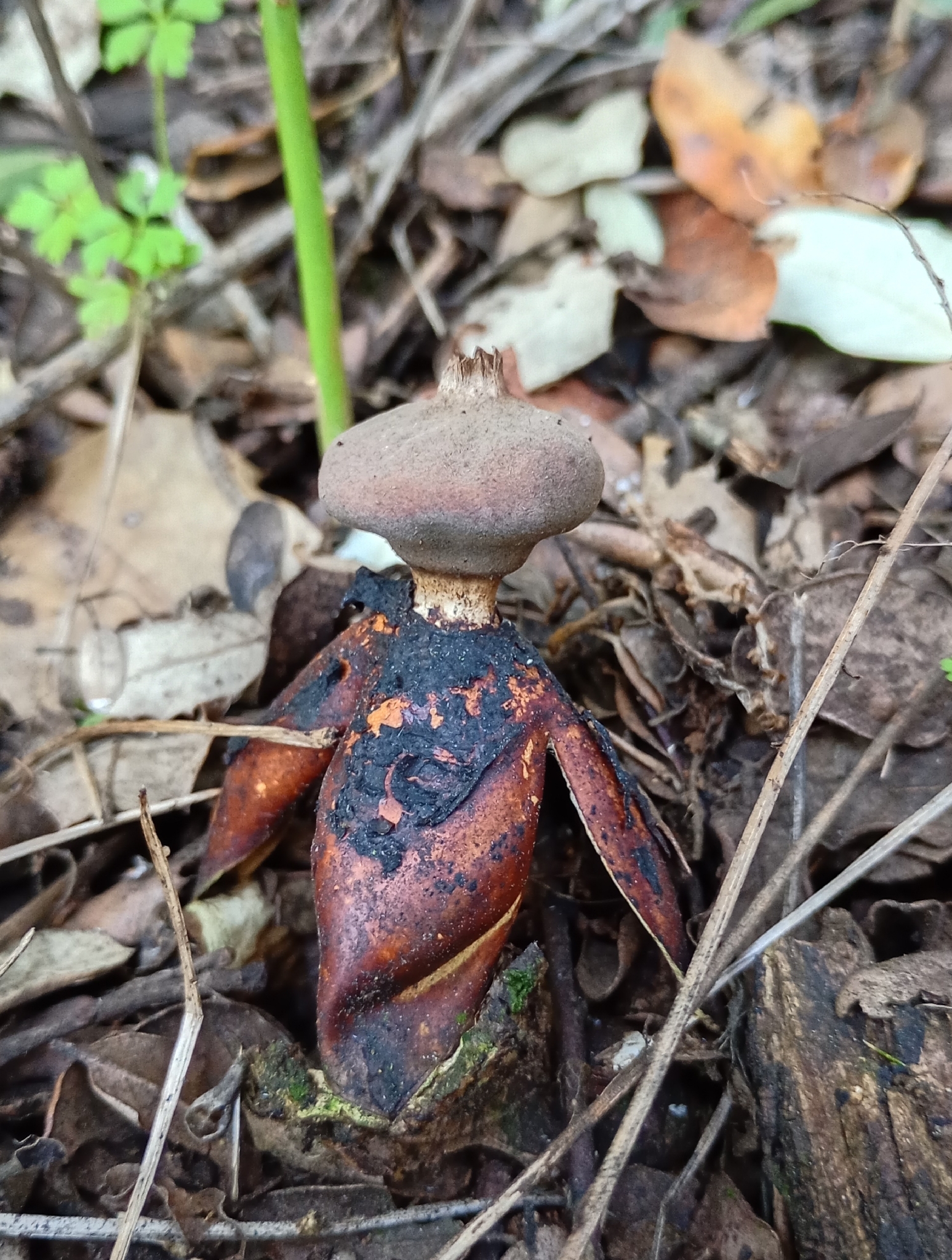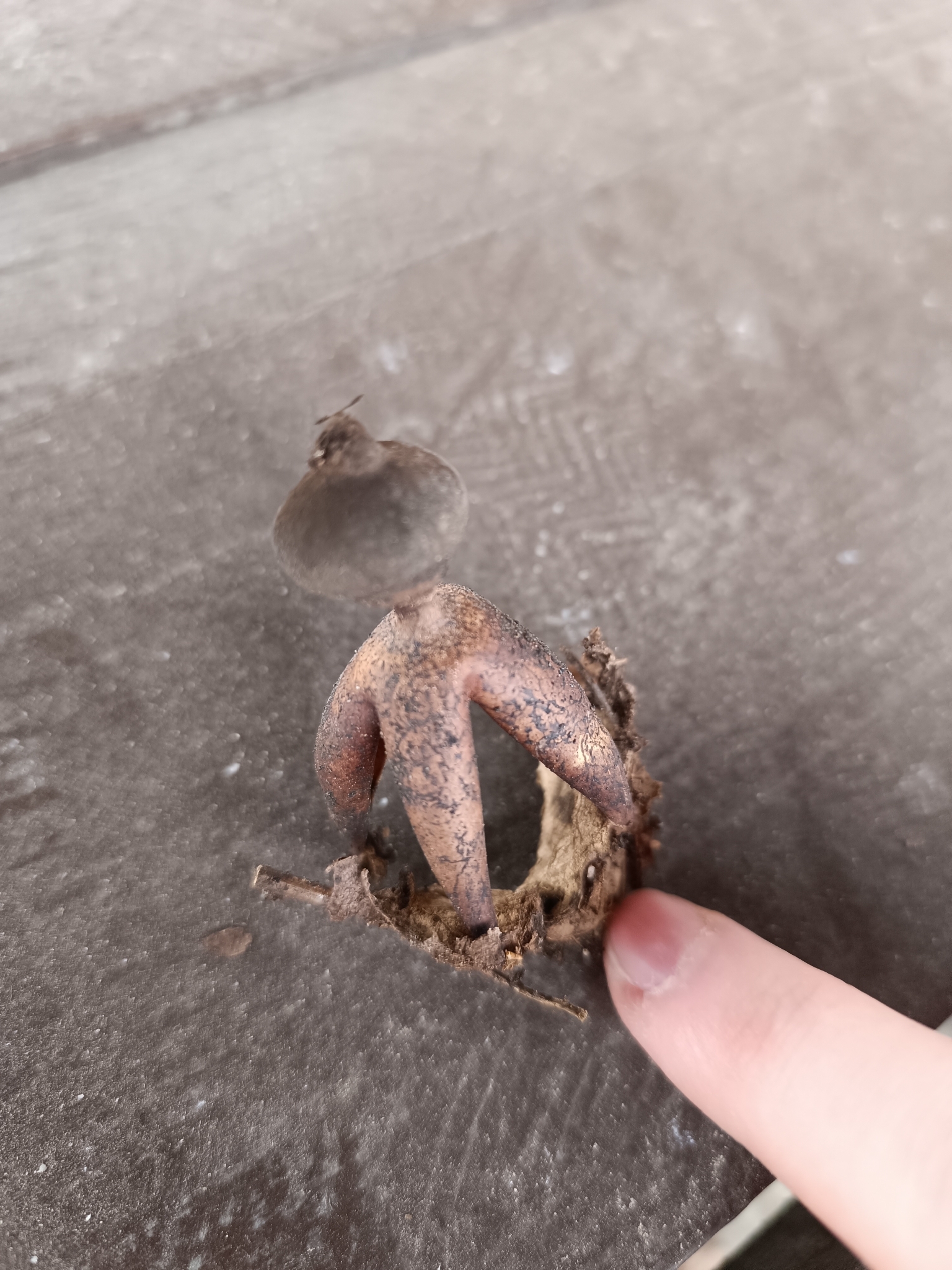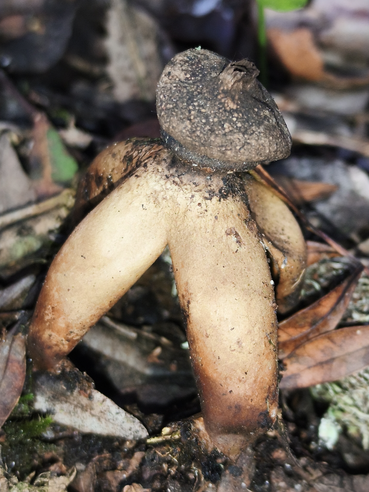 Fruchtkörper auf einem kurzen Stiel getragen, spaltet sich in 4 hohe, schmale, nach unten gerichtete Strahlen, die auf den Spitzen einer becherartigen Struktur stehen, die an der Basis des Pilzes durch 4 ähnliche, aber kürzere und breitere, nach oben gerichtete Strahlen gebildet wird.Sporenbehälter 1–1,5 cm breit, kugelförmig, mit einem fransigen apikalen Porus; bräunlich.Sporen 3,5–4,5 µm im Durchmesser, kugelig, warzig. Sporenmasse schwarzbraun.