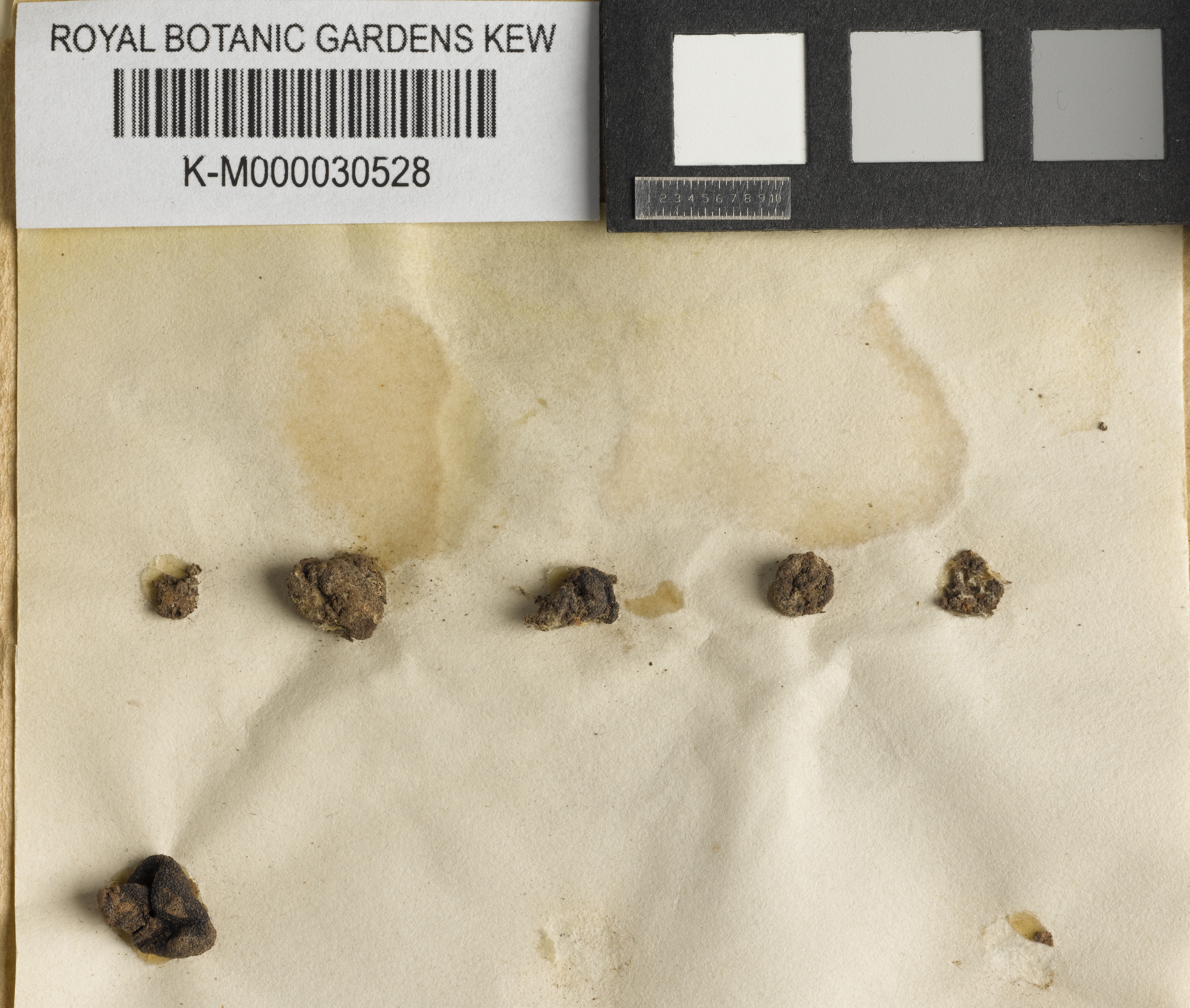 Fruchtkörper: Fruchtkörper knollenförmig, mit meist unregelmässig angeordneten Höckern und schwarzbraune oder braune, mit kleinen vieleckigen, meist abgeplatteten Warzen überzogener Rinde, bis 2 cm im Durchmesser, am Grunde mit breitem oft faltig abgesetztem Polster, oben mit weiter oder spaltförmig verengter und zuweilen in einer Falte verborgener Mündung. Die Wand µmst innen braun oder schwarz berindet, eingefaltet oder mit stark vorragenden, plattenförmigen Vorsprüngen. Hymenium gelblichweiss.
