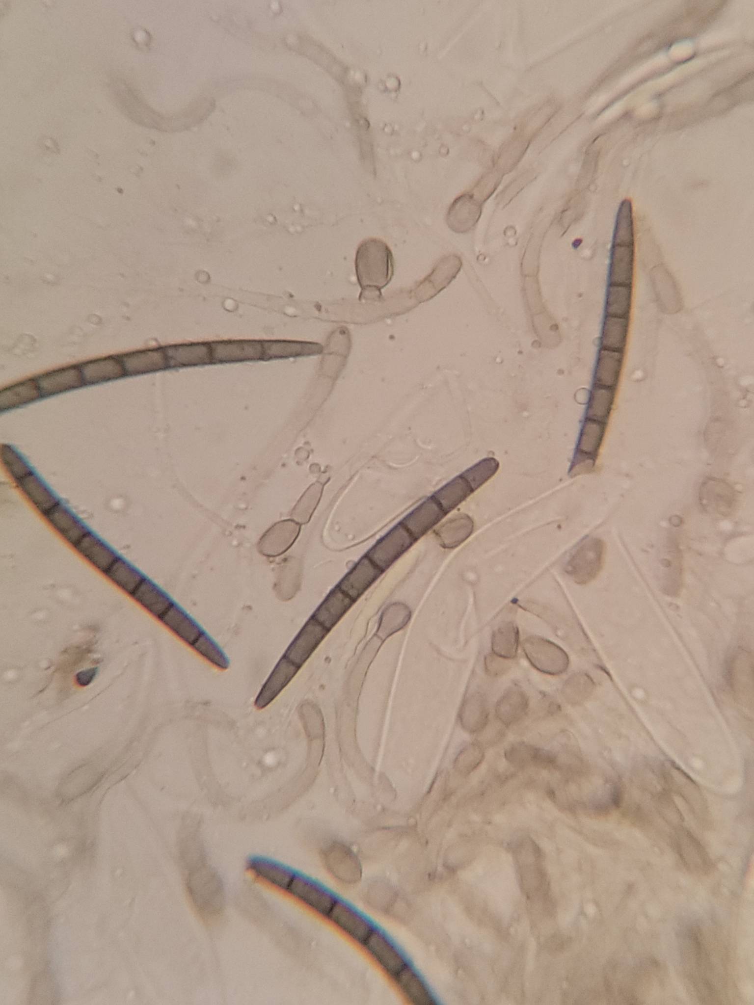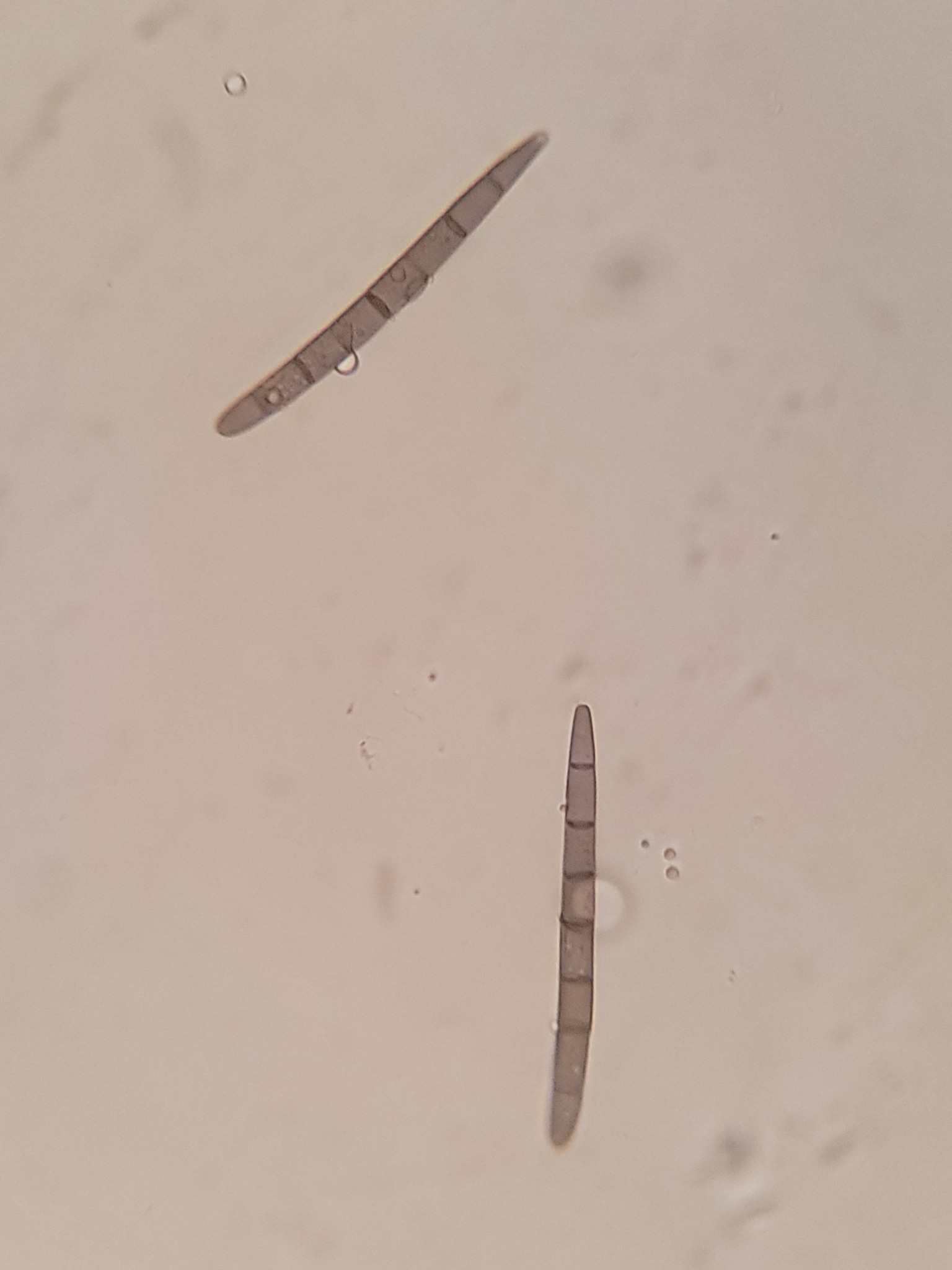 Sporen: Schläuche keulenförmig, sporenführender Teil 100—120 µm lang. 12—15 µm breit. Sporen zylindrisch, 55—80 µm lang, 5—7 µm breit, mit sieben Querscheidewänden. Membran braun. Paraphysen mit Querscheidewändeu, oben mit kettenförmigen, bauchig aufgetriebenen Zellen, die obersten 6—7 µm breit, bräunlich.