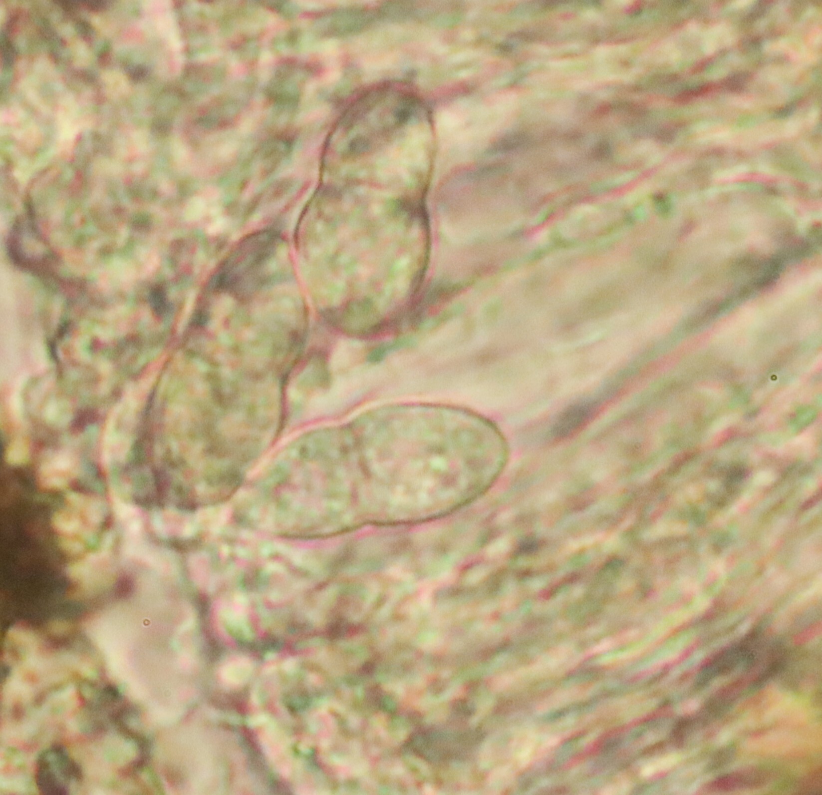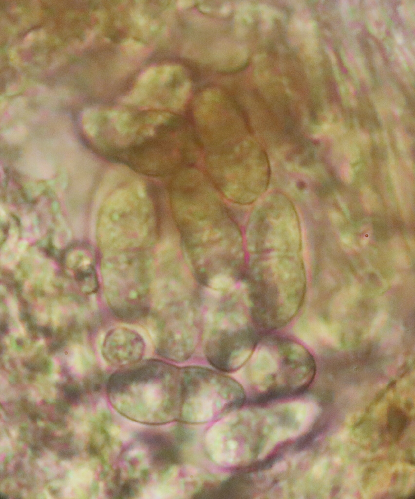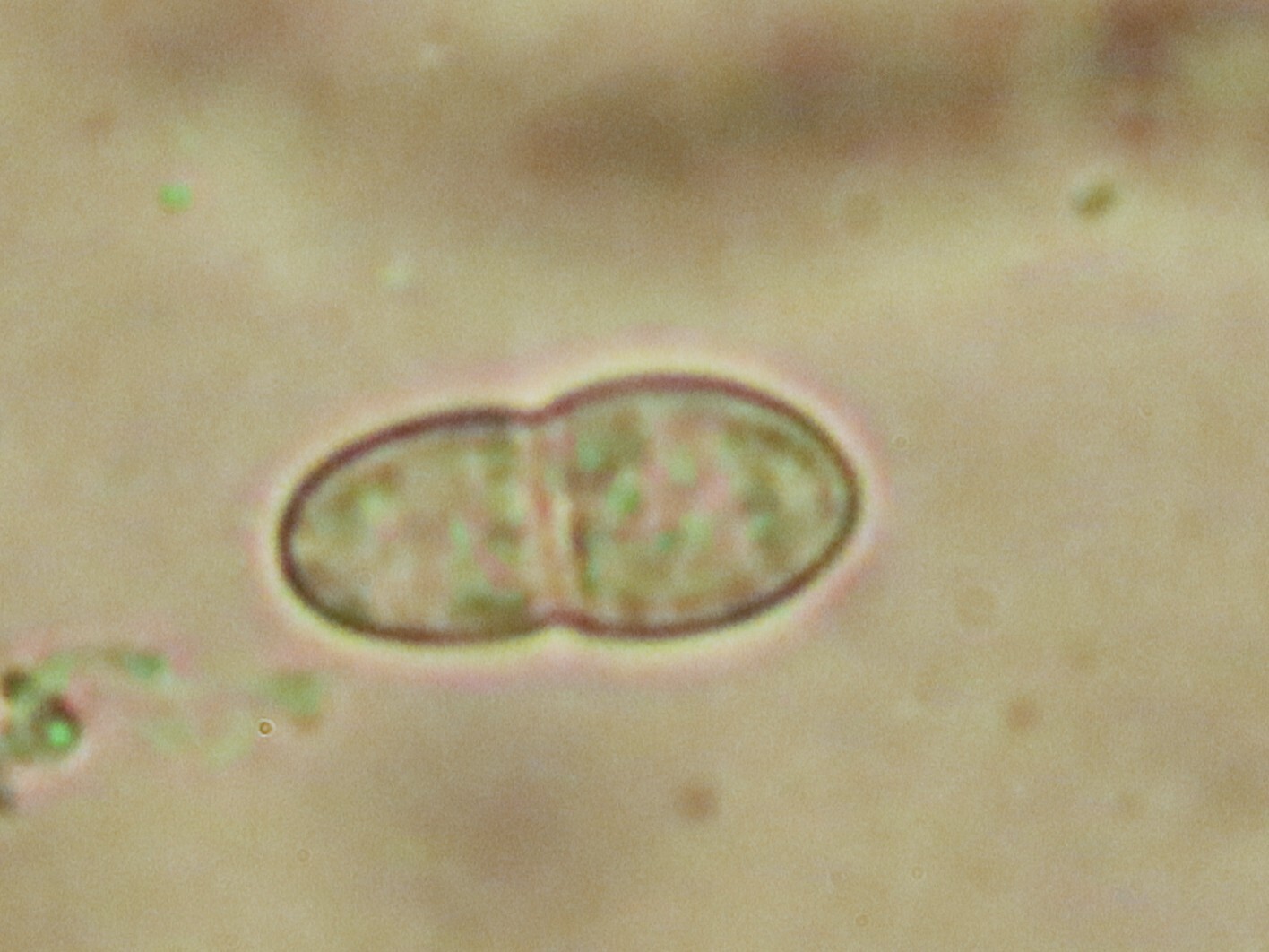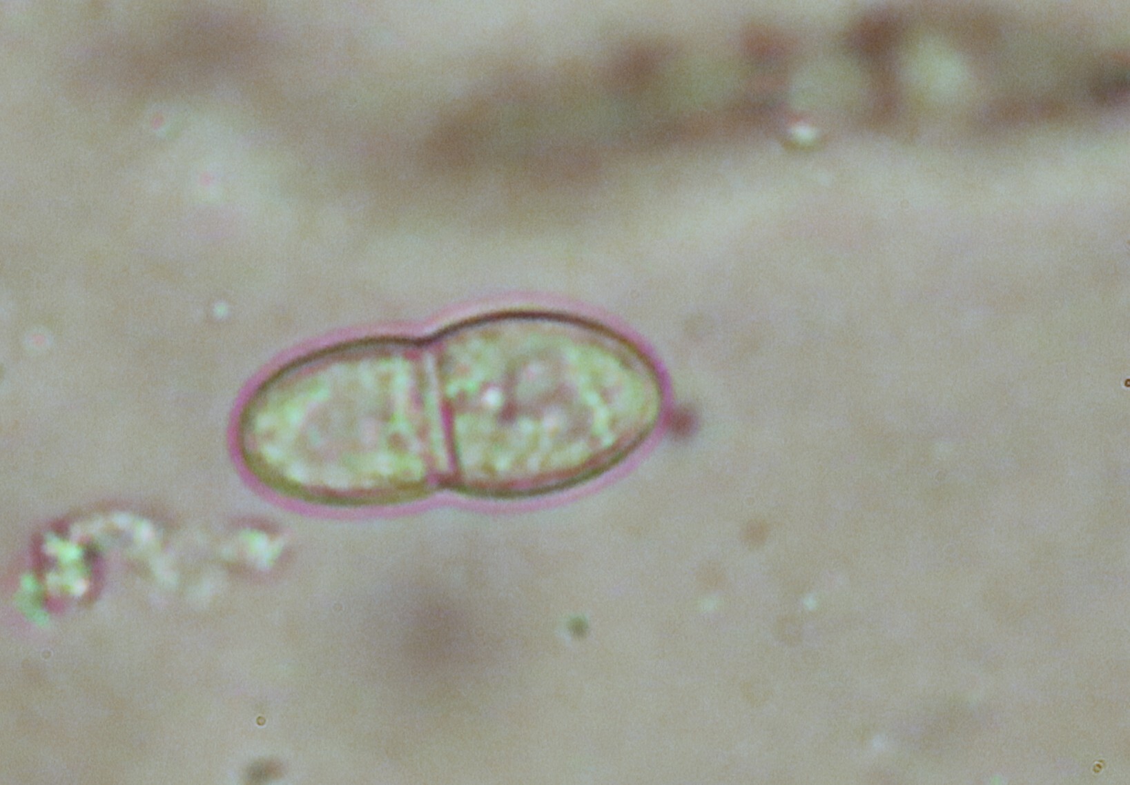 Sporen: Schläuche zylindrisch-keulenförmig, 60—90 jU lang, 6 bis 10 µm breit, achtsporig. Sporen einreihig, eiförmig, an den Enden abgerundet, 12—15 µm lang, 6—8 µm breit, zweizeilig, an der Scheidewand etwas eingeschnürt, farblos, die unteren Zellen viel schmäler. Paraphysen fadenförmig, oben verzweigt, braungrün, ein Epithecium bildend.