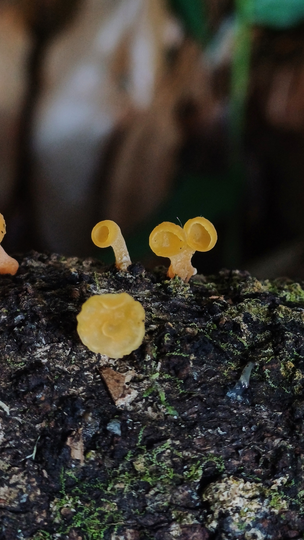 Fruchtkörper: Fruchtkörper zäh gallertig, bis fast knorpelig, 5—15 mm hoch und 2—8 mm breit, becher- oder schüsseiförmig, im oberen Teil abgeflacht oder schüsseiförmig vertieft und hier mit dem Hymenium überzogen, hellgelblich, meist mit sehr kurzem, dickem, zuweilen auch verlängertem Stiel.
