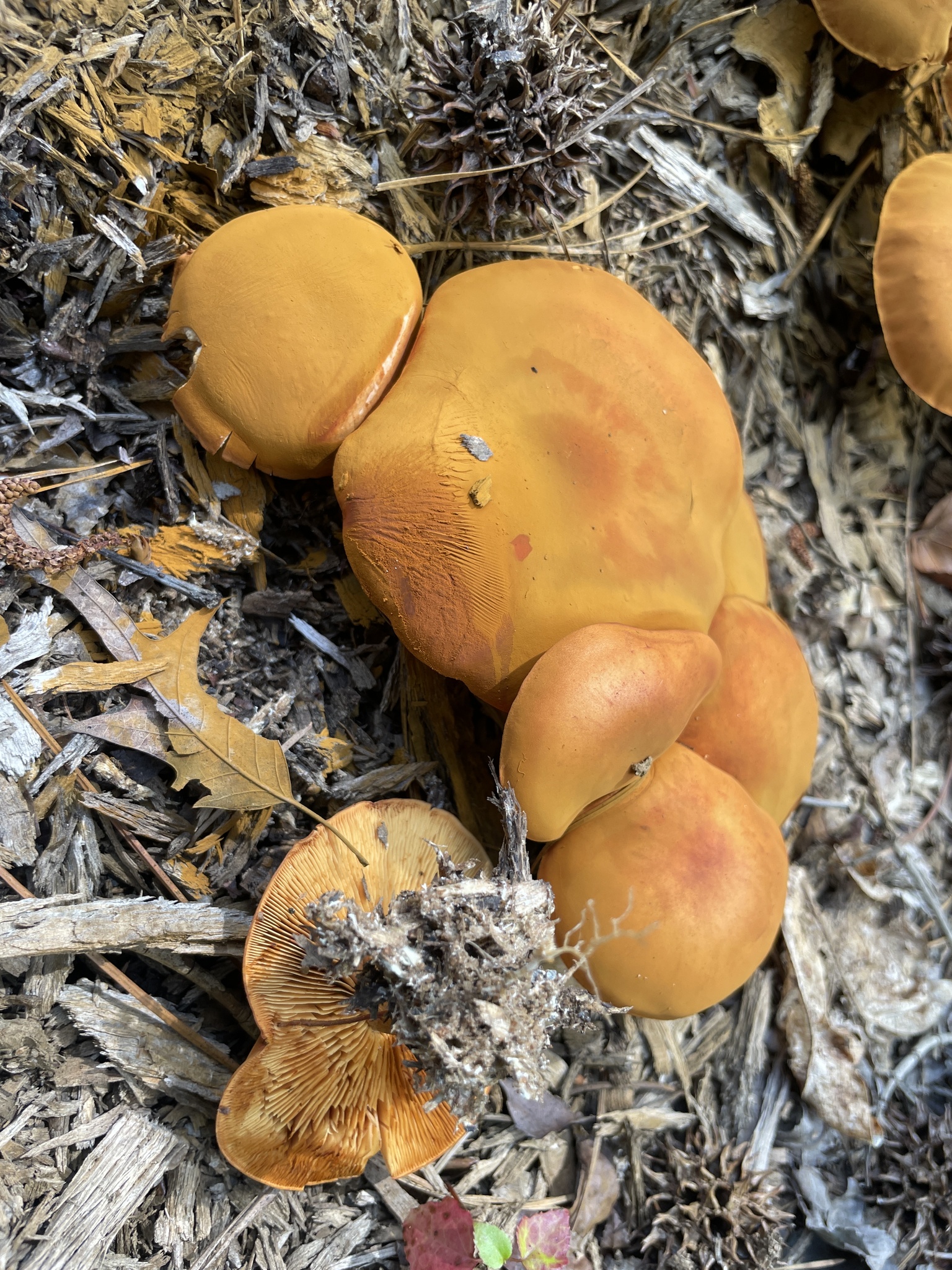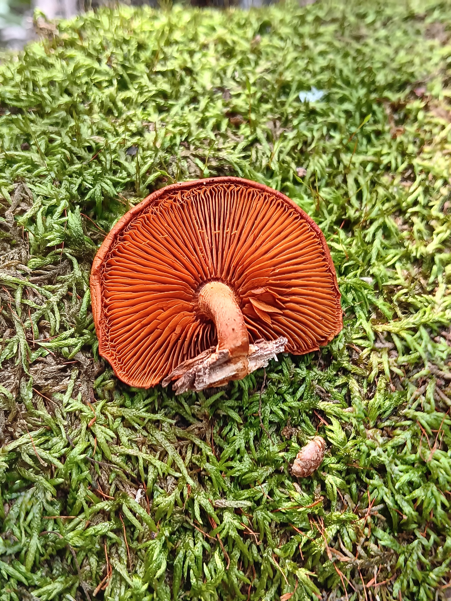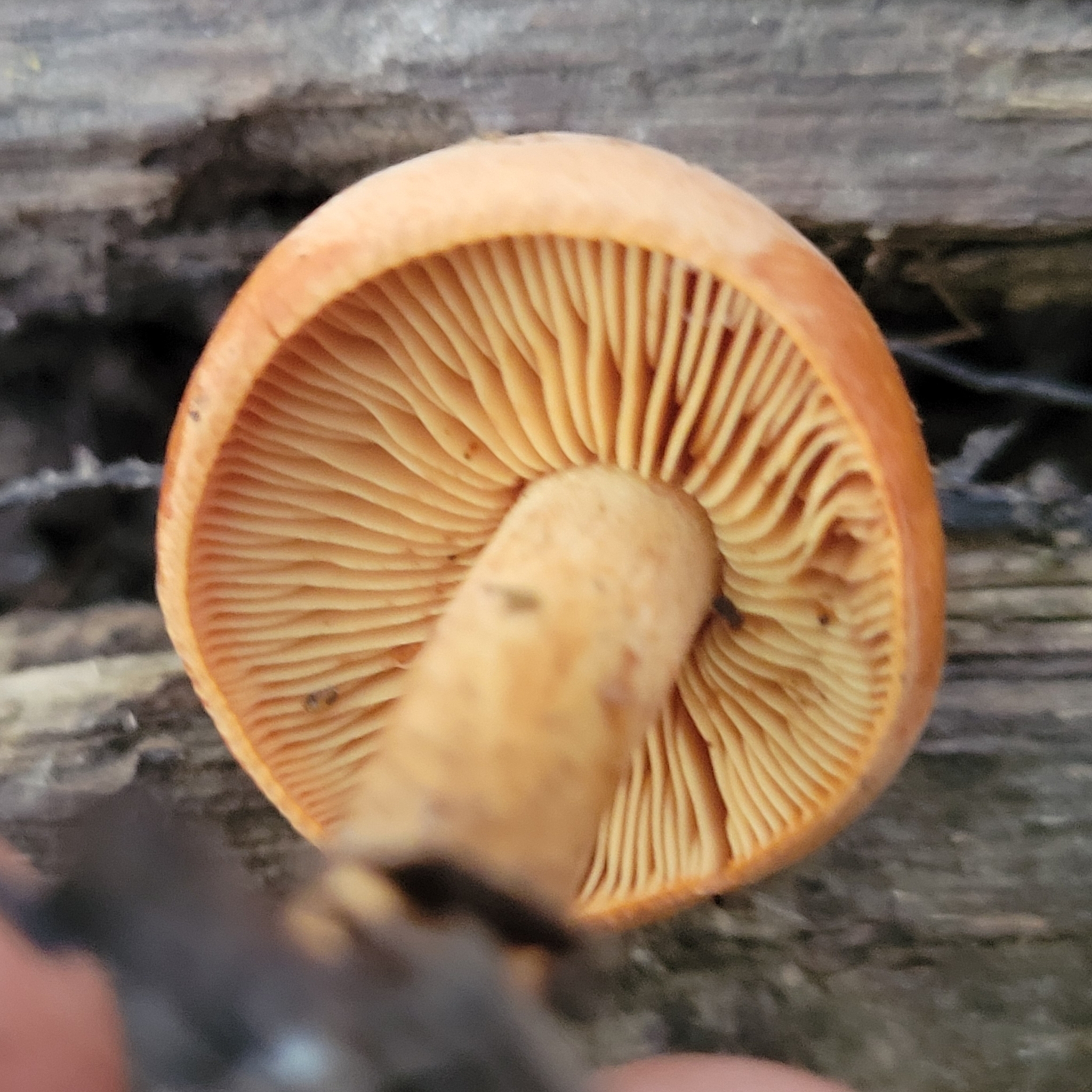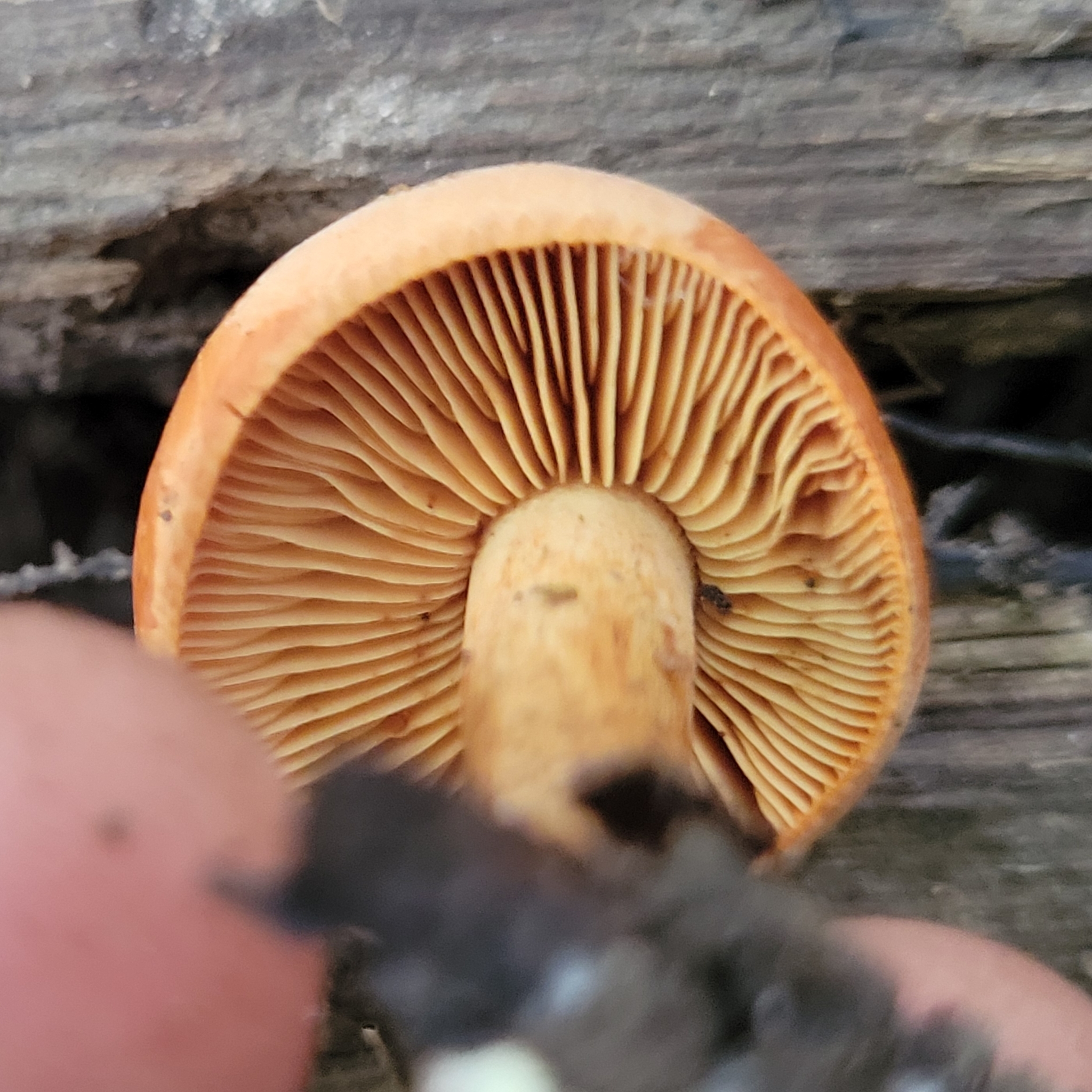 Lamellen: angewachsen, gedrängt, breit, jung goldgelb, dann gelb-zimmetbraun.