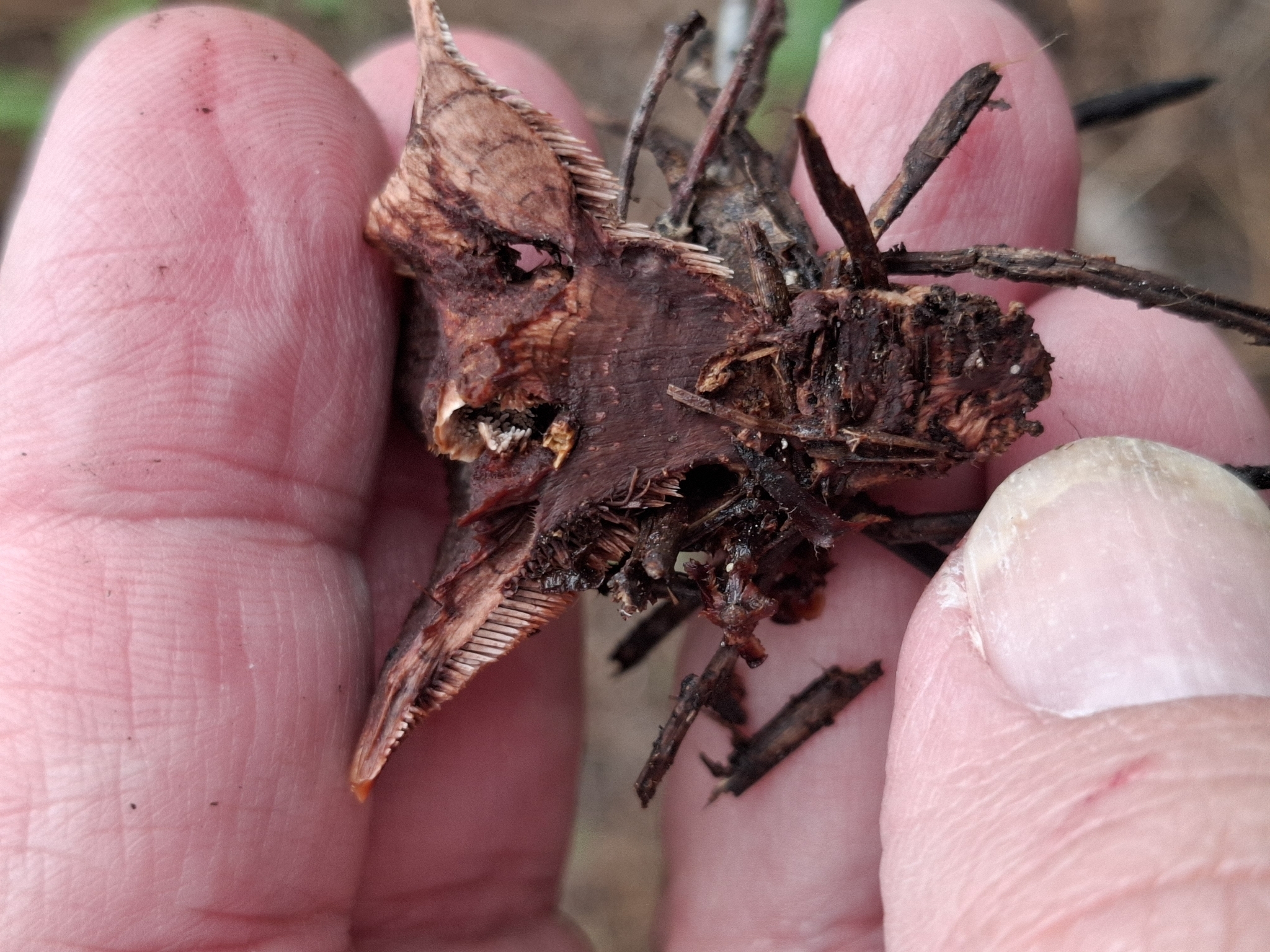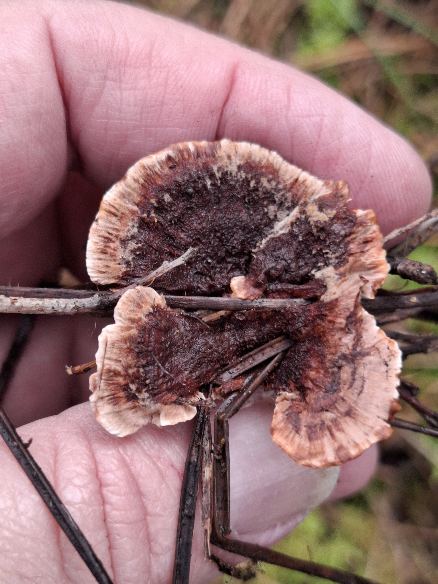 Fruchtkörper: Fruchtkörper schwammig- korkartig, weich, innen und aussen rostbraun.