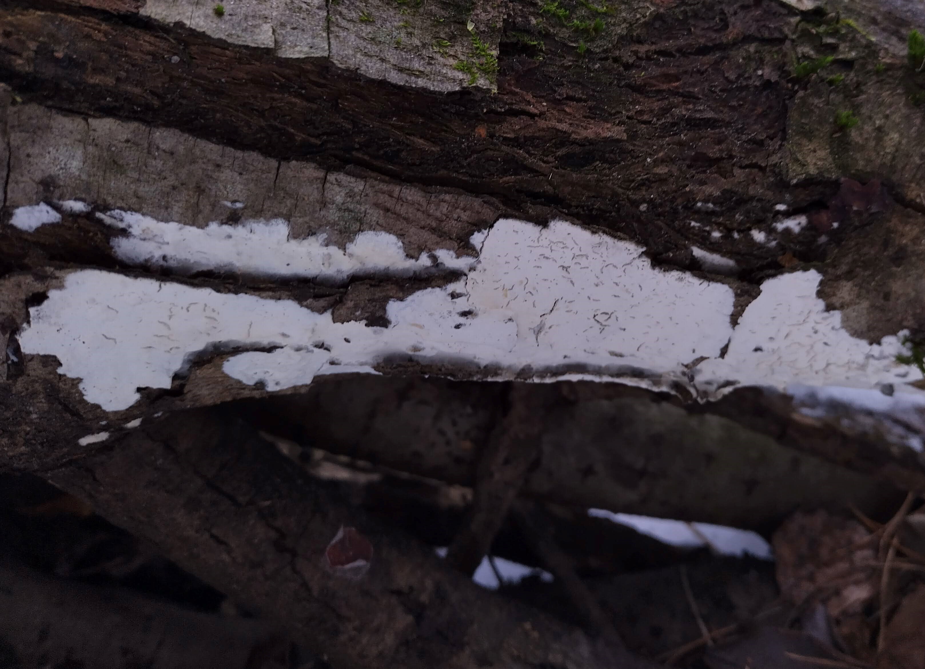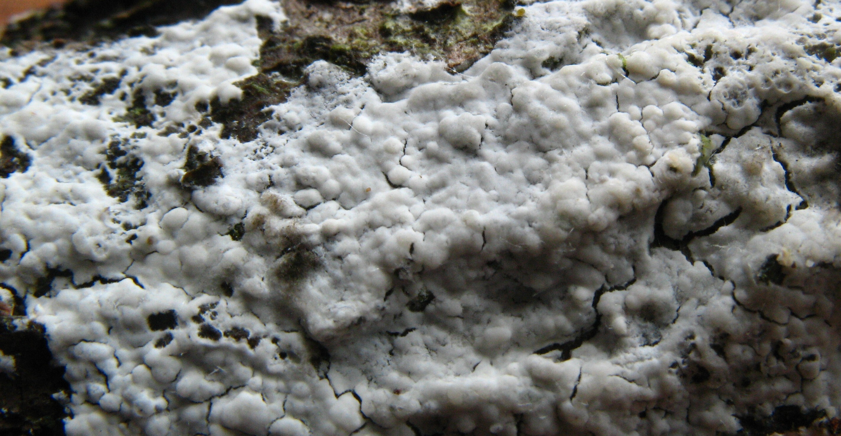 Fruchtkörper: Bildet weisse, dünnhäutige, weit verbreitete, zusammenhängende Überzüge. Hymenium frisch mit flockigen, feinen Warzen bedeckt, ohne borstenförmige Cystiden, trocken glatt, rissig.