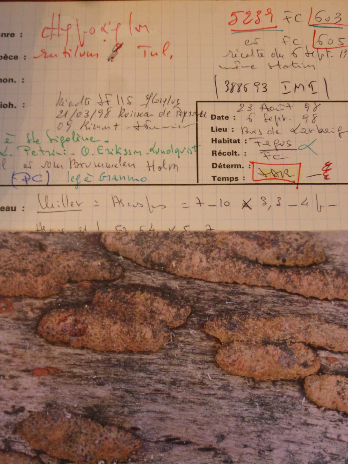 Sporen: Schläuche zylindrisch, sehr lang gestielt, sporenführender Teil 60—80 µm lang, 5— 8 µm breit, achtsporig. Sporen einreihig, ellipsoidisch, einseitig abgeflacht, 8—11 µm lang, 4—5 µm breit. Membran schwarzbraun. Paraphysen fadenförmig. Konidienlager rehbraun. Konidienträger verzweigt, büschelig. Konidien sehr klein.