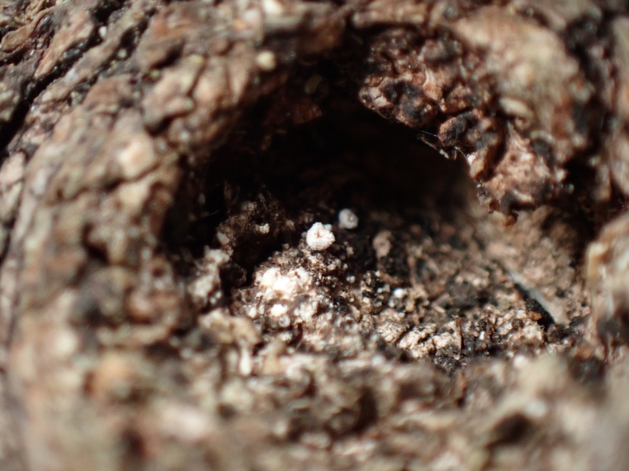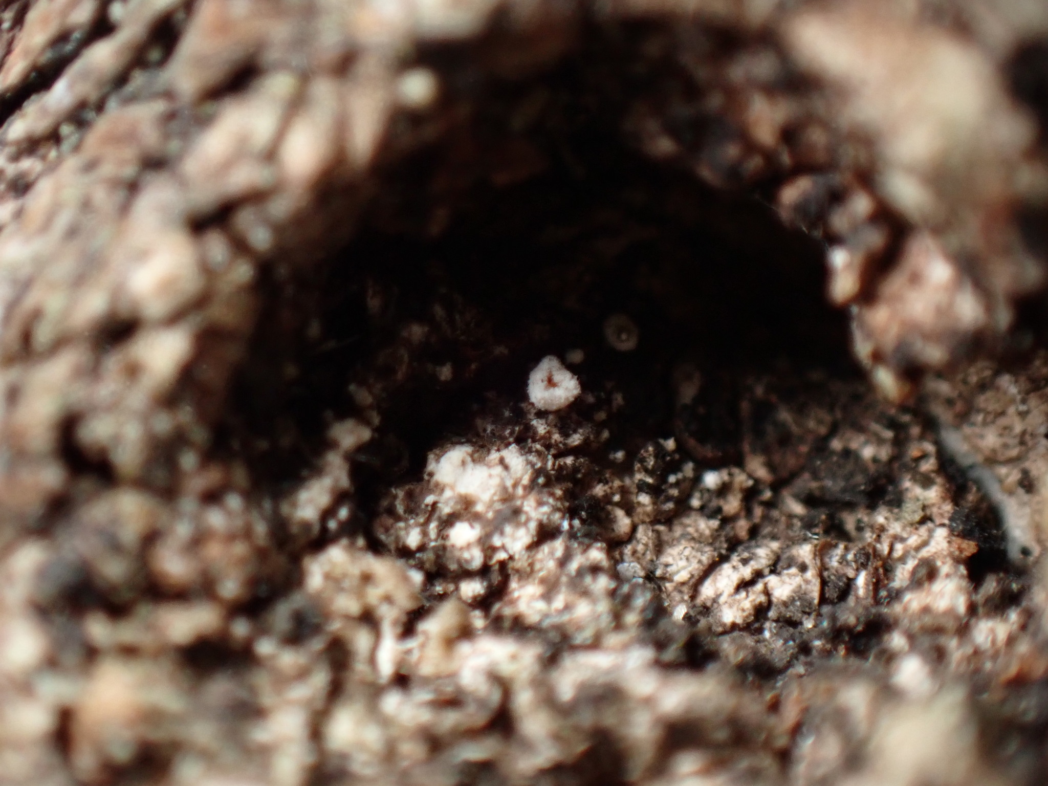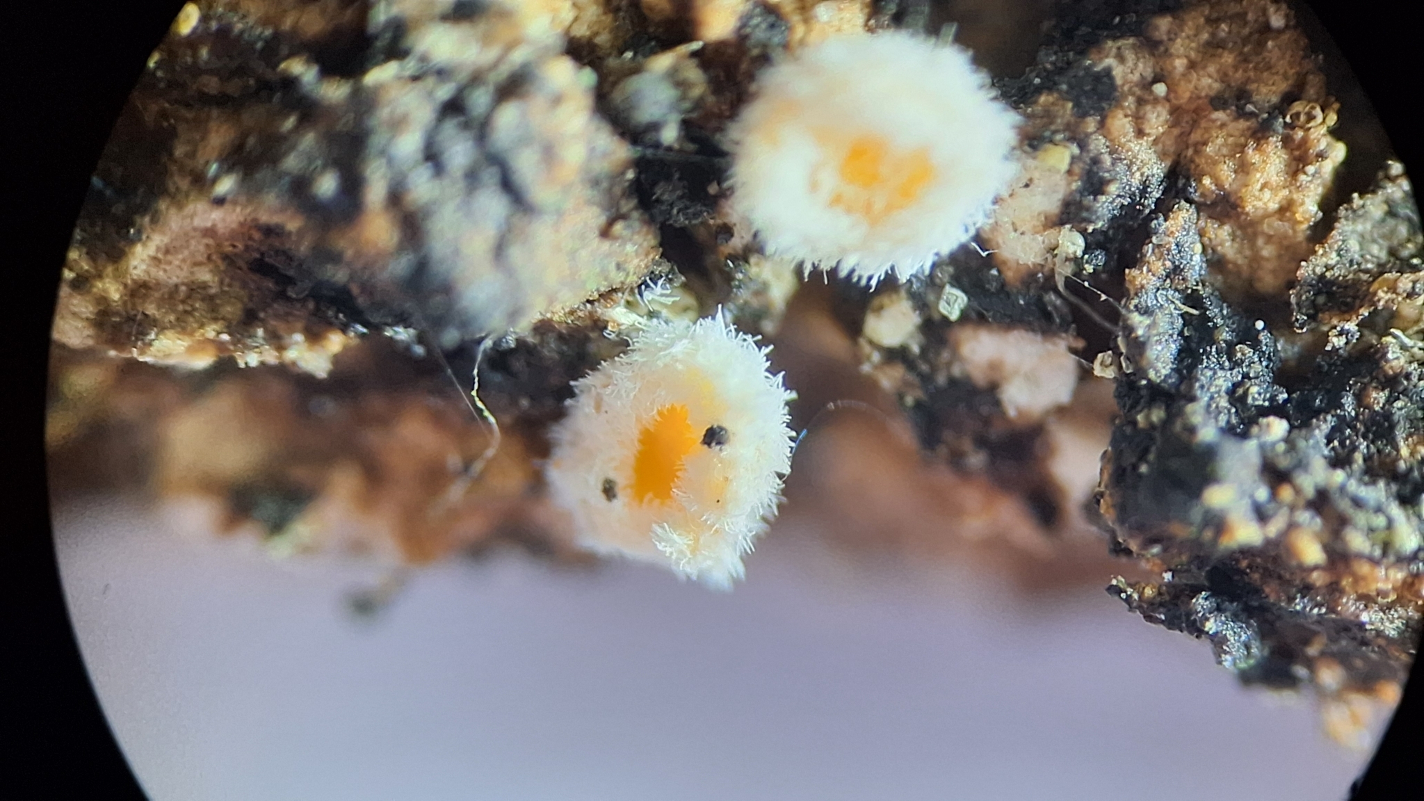 Fruchtkörper: Apothecien gesellig, sitzend, kreiseiförmig, kurz und dick gestielt, zuerst kugelig geschlossen, rundlich sich öffnend und die krugförmige, zart berandete, orangegelbe Fruchtscheibe entblössend, äusserlich weiss, zottig dicht bedeckt von zerbrechlichen, einfachen, septierten, rauhen, farblosen, langen, 3—3,5 µm breiten Haaren, trocken eingebogen, 0,5—1,5 mm breit und hoch, wachsartig.