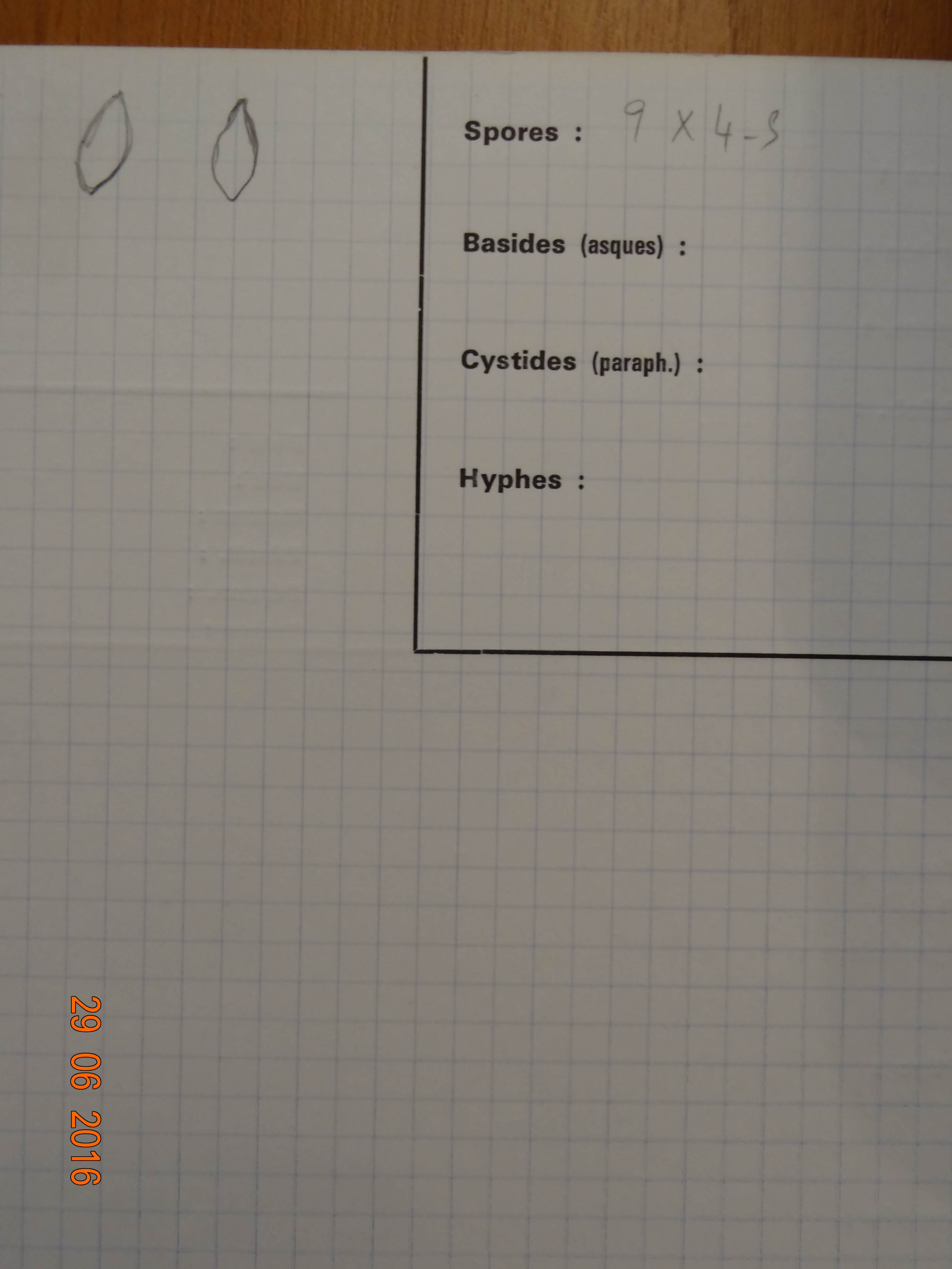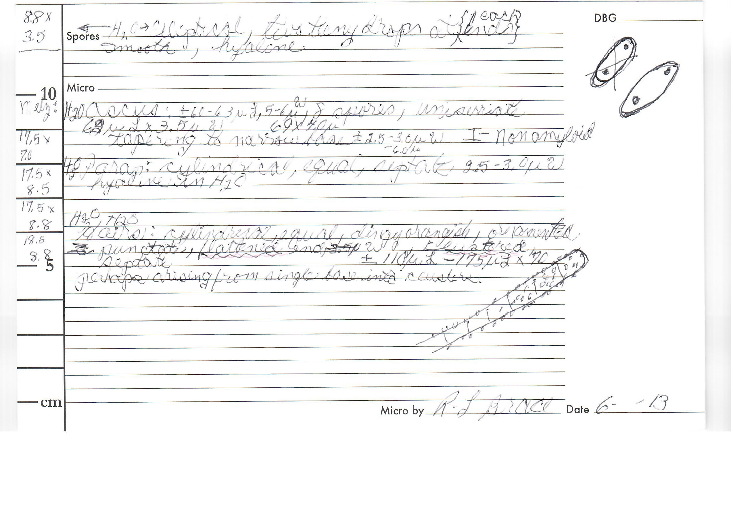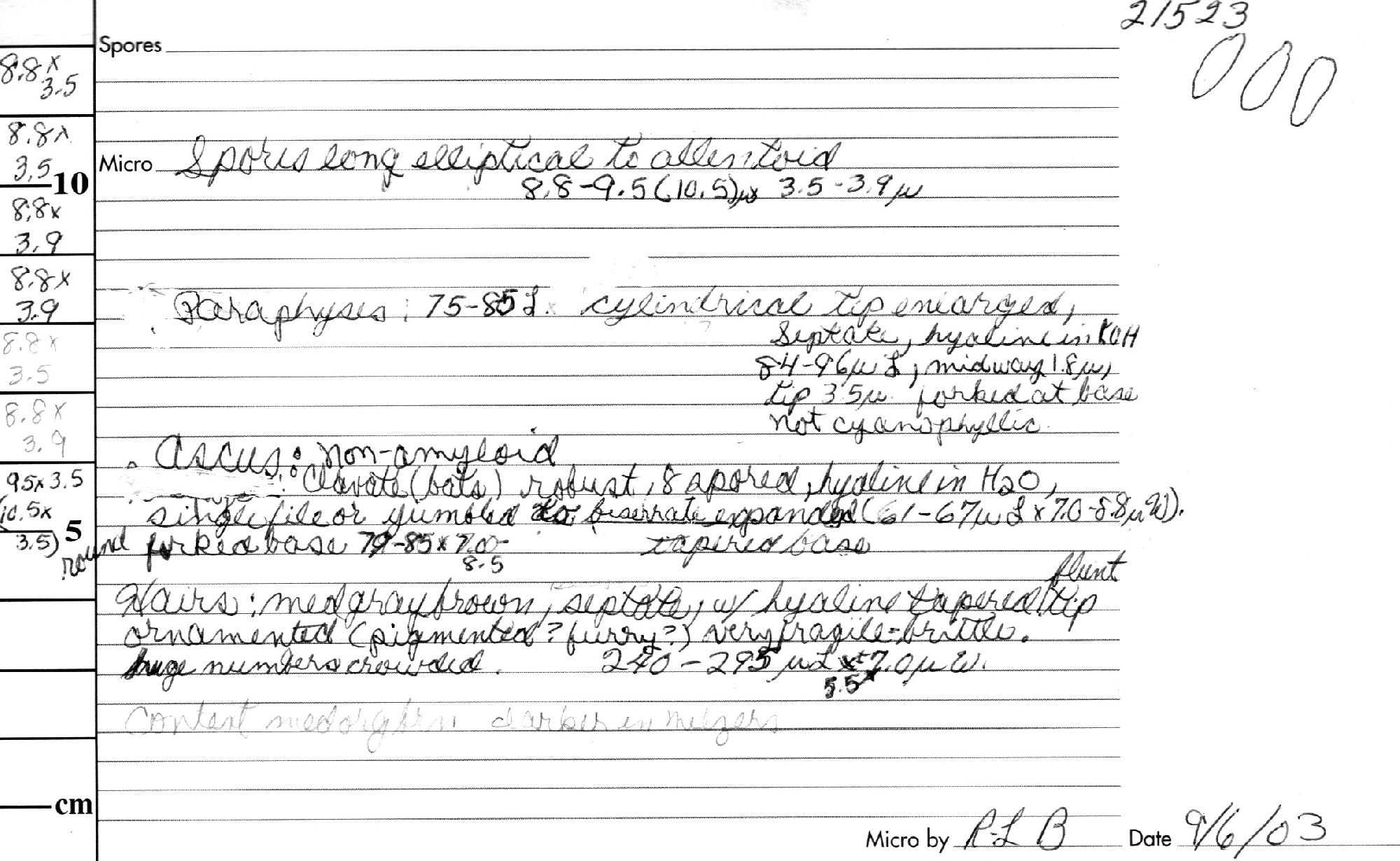 Sporen: Schläuche zylindrisch-keulig, oben abgerundet, 6O—80 µm lang, 7—8 µm breit, achtsporig. Sporen elliptisch-eiförmig, einzellig, farblos, 7—10 µm lang, 4 bis 6 µm breit, meist einreihig gelagert. Paraphysen oben oft gabelig geteilt, 2 µm breit, voll gelblichrötlicher Öltropfen. Gehäuse braun.