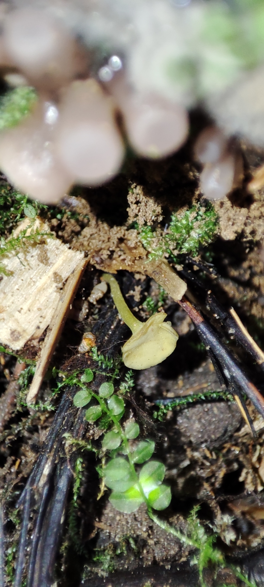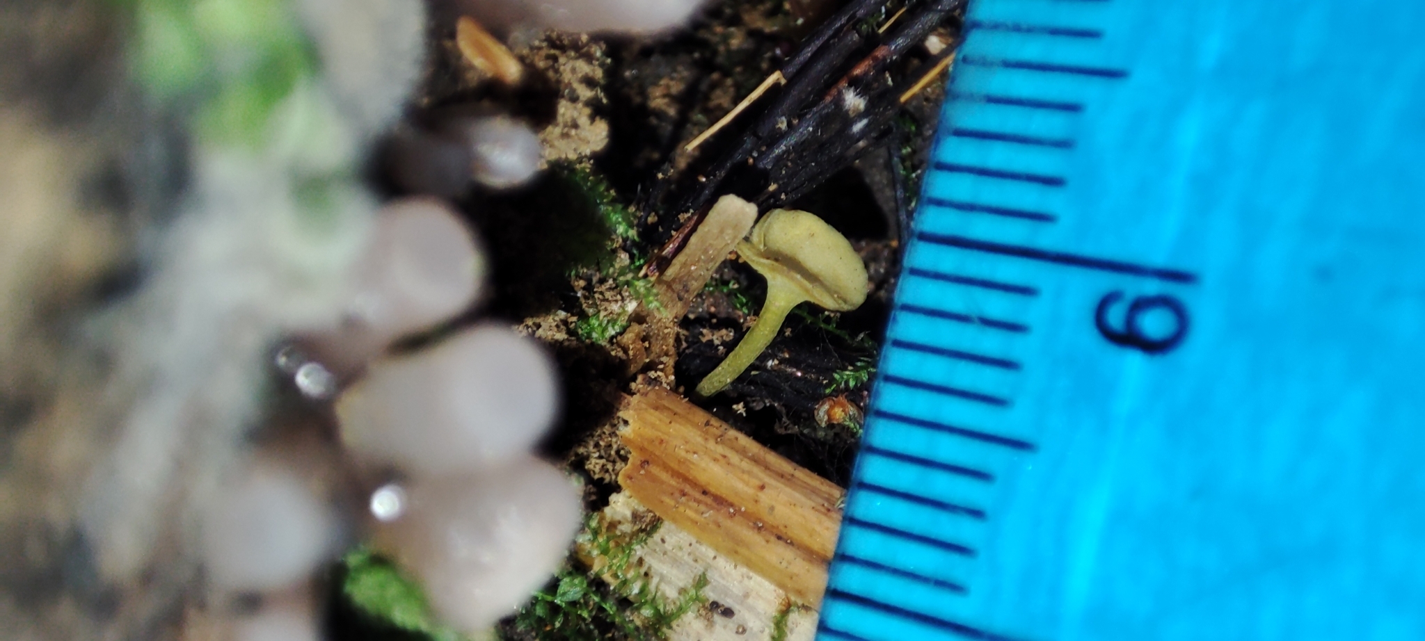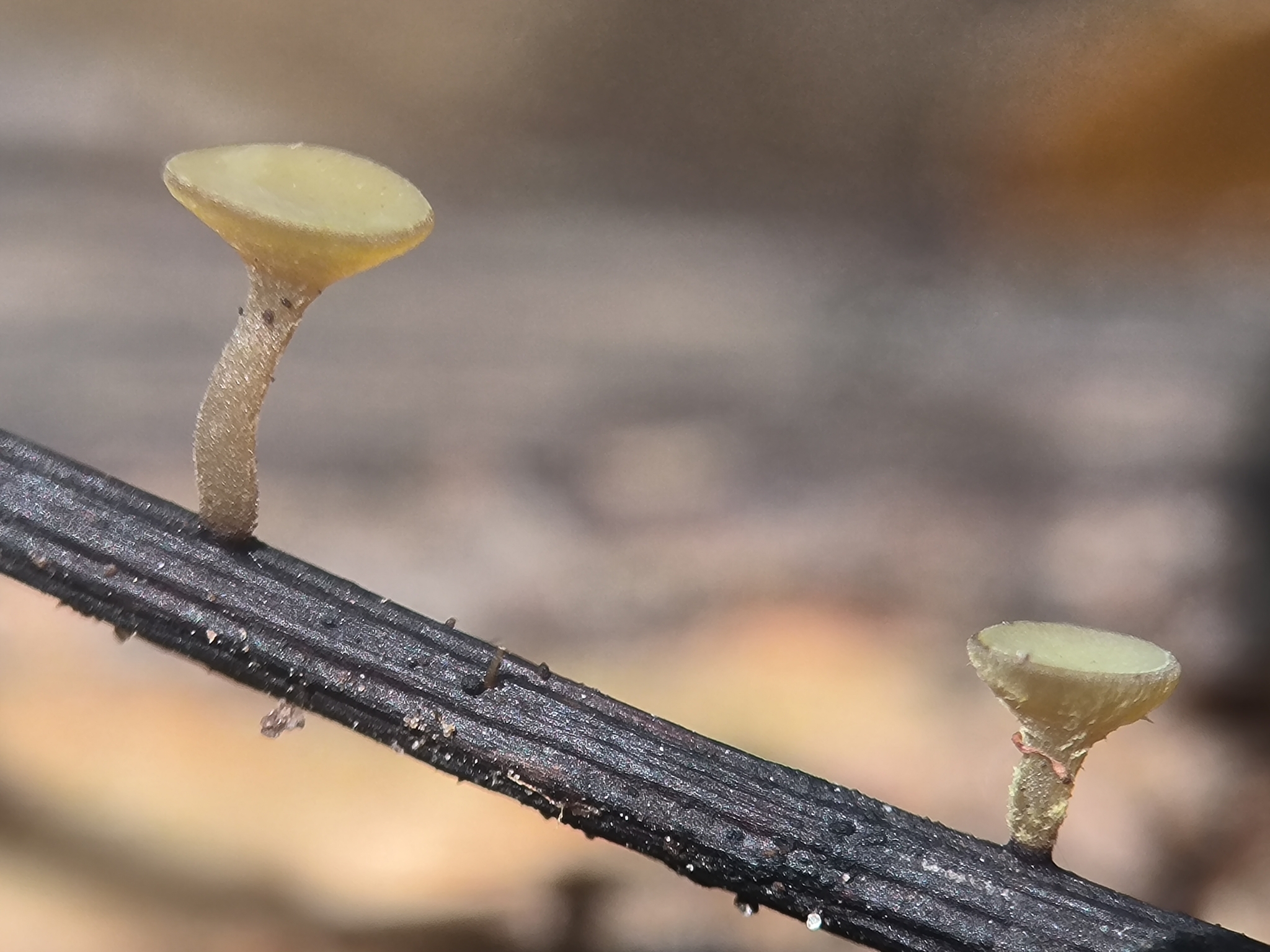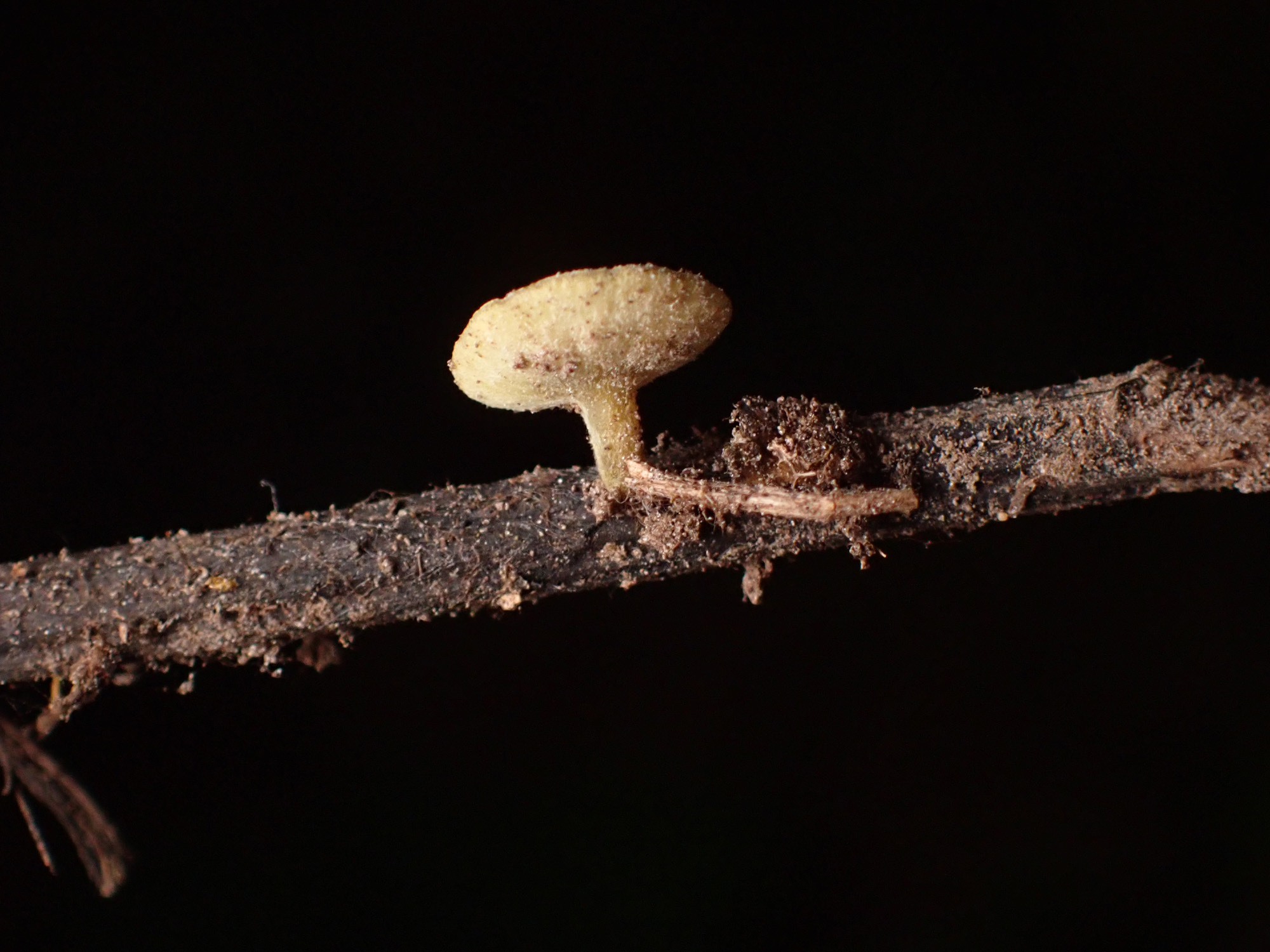 Fruchtkörper: Apothecien meist vereinzelt, sitzend, kelchförmig, zuerst kugelig geschlossen, rundlich sich öffnend und die krug-, bald flach schüsseiförmige, zart berandete, endlich gewölbte, blassgrüne Fruchtscheibe entblössend, 0,5—2 mm breit, mit einem zylindrischen, geraden oder gebogenen, oft in die Erde eingesenkten, 1,5—2 mm langen, 0,15—0,5 mm dicken Stiel, aussen glatt, bräunlich- oder grünlichgelb, trocken eingerollt, heller und etwas gekerbt berandet, schwach flaumig, mit braungrüner Fruchtscheibe, wachsartig fest.