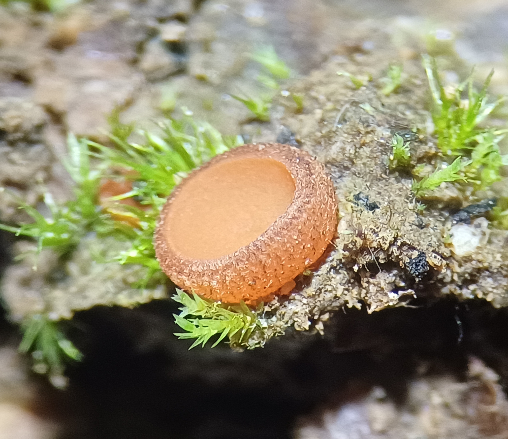 Fruchtkörper 0,5–2 cm breit, schalenförmig, sitzend (sessil); Innenseite karminorange, Außenseite blasser, bedeckt mit winzigen, flaumigen braunen Haaren, besonders nahe dem Rand.Sporen 17–19x9–11 µm, elliptisch, grob netzartig (reticulated).Asci 300x15 µm.