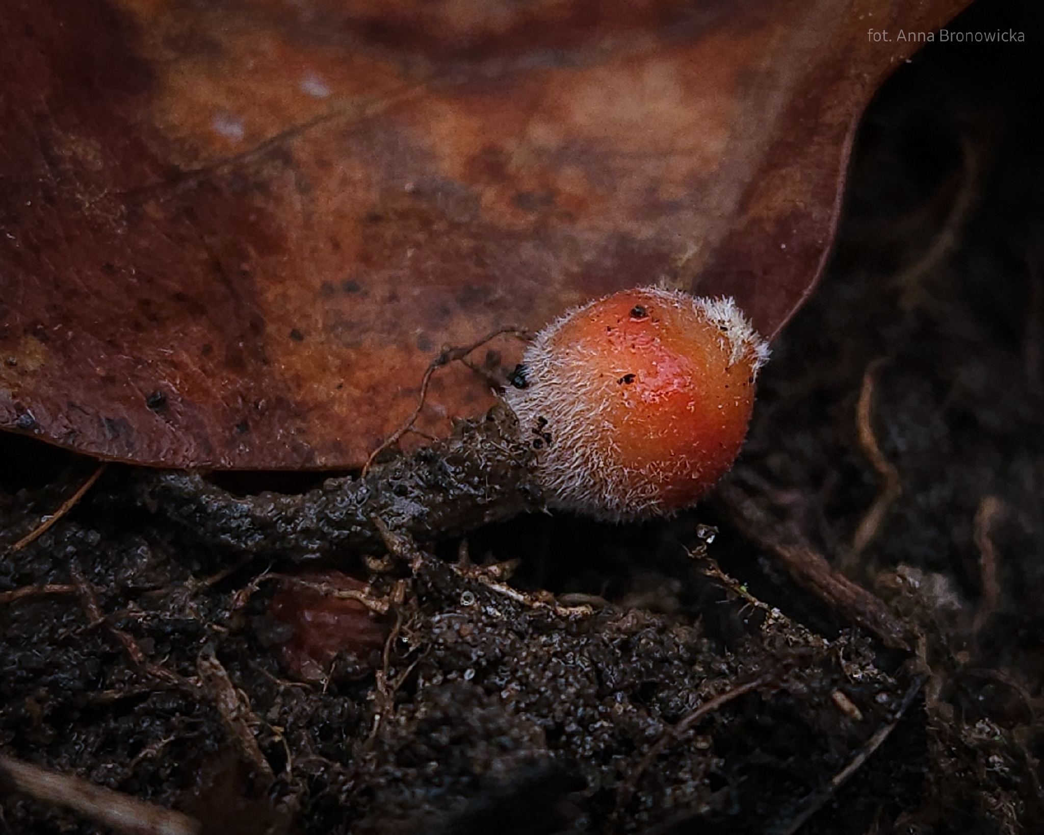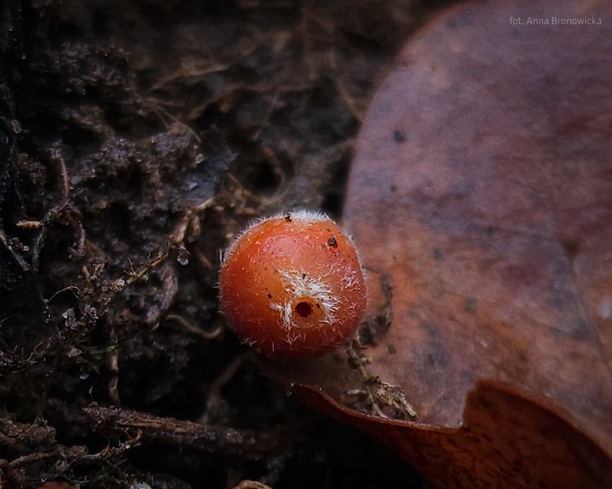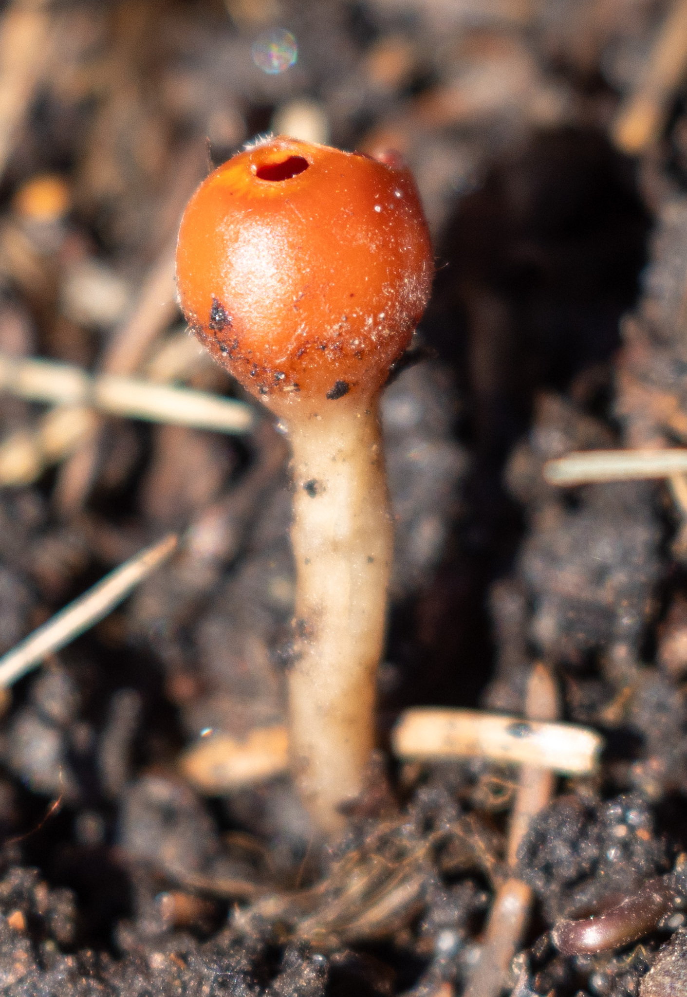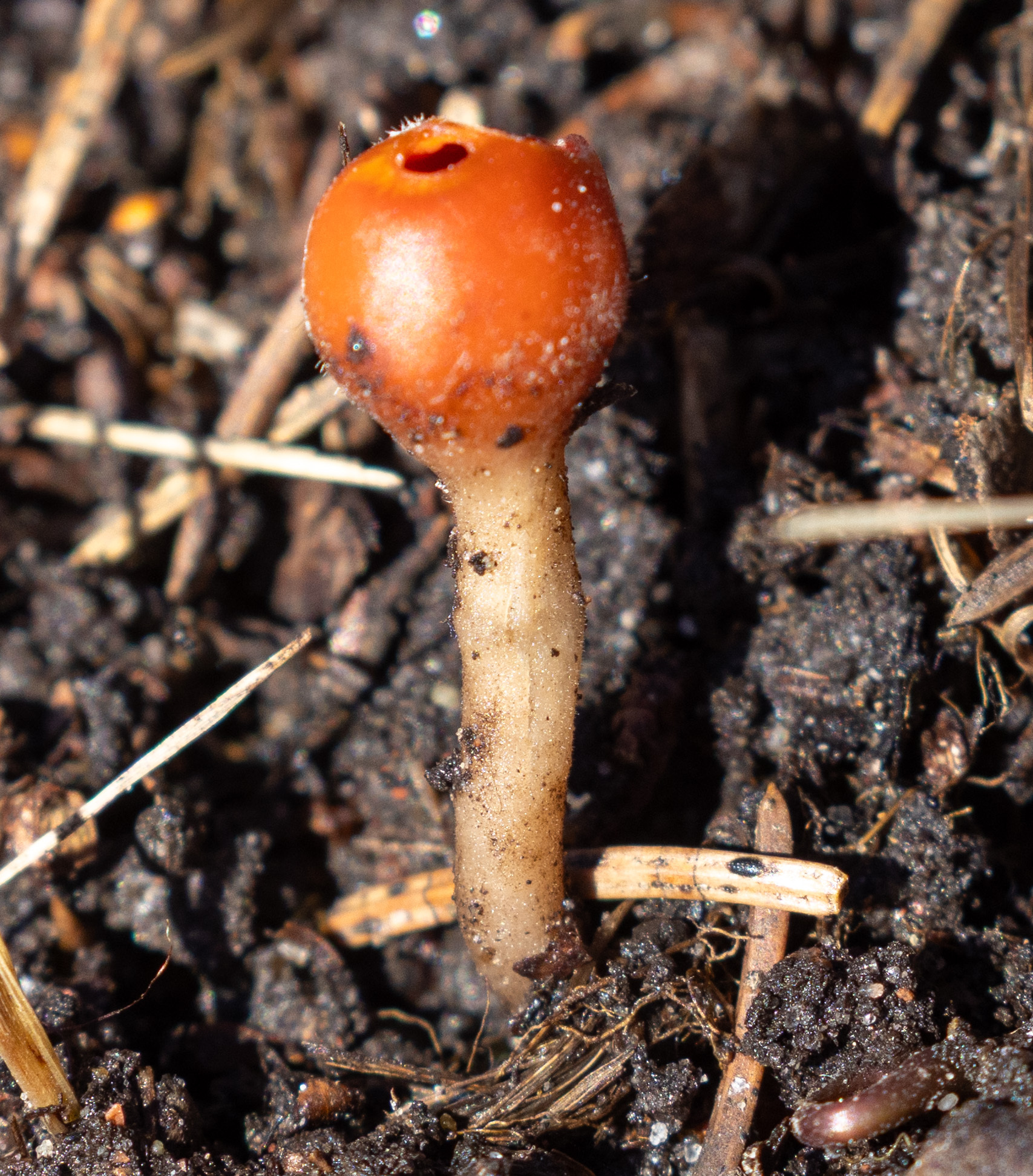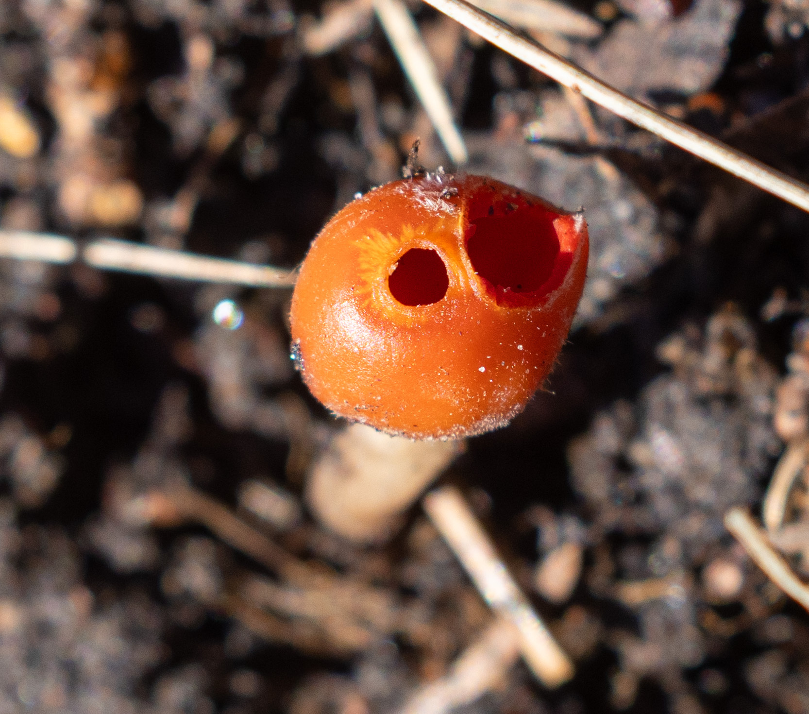 Oberfläche, Hülle: Becher anfangs birnenförmig oder kugelig, mit sehr kleiner, kreisrunder Mündung, 2 — 5 mm breit, später erweitert und meist sternförmig zerreissend, dann bis 1 cm breit, aussen weisslich, schwach filzig. Scheibe lebhaft mennig- oder scharlachrot.