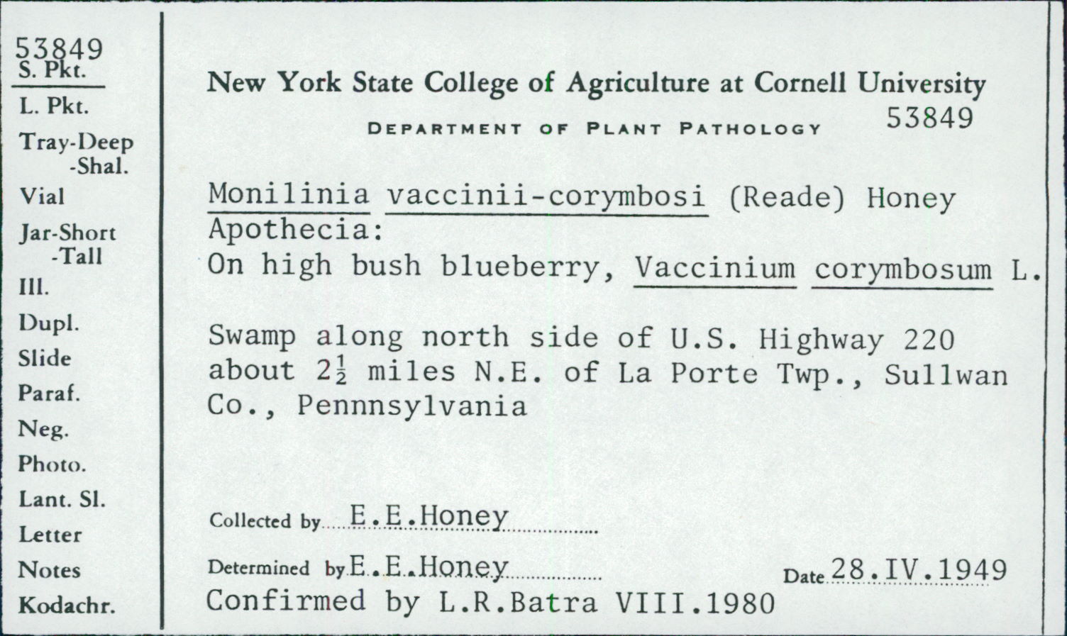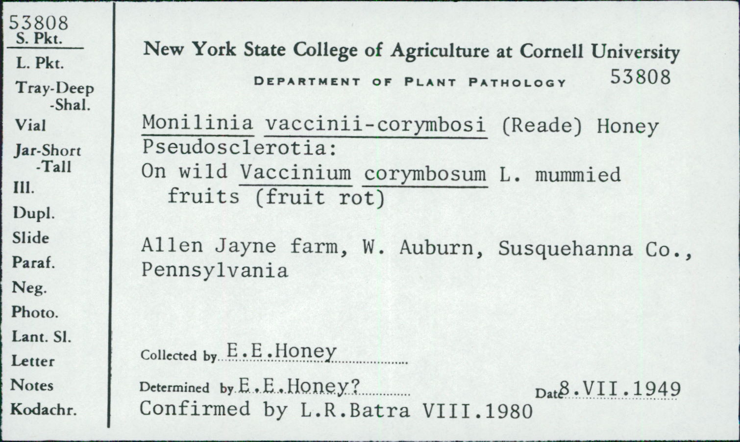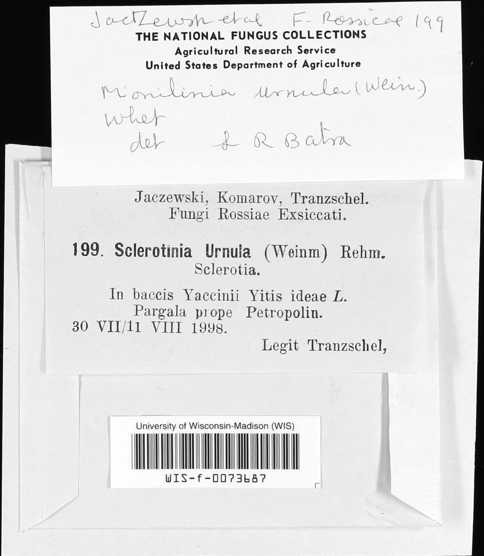 Vorkommen: Sclerotien in den Früchten von Preiselbeere oder Preißelbeere (Vaccinium vitis-idaea), die dadurch schmutzig lederbraun werden. Sclerotium in der Grösse und allgemeinen Gestalt den Beeren der Nährpflanze gleichkommend, seitlich mit vier starken Rippen, aussen schwarzbraun, innen weiss.
