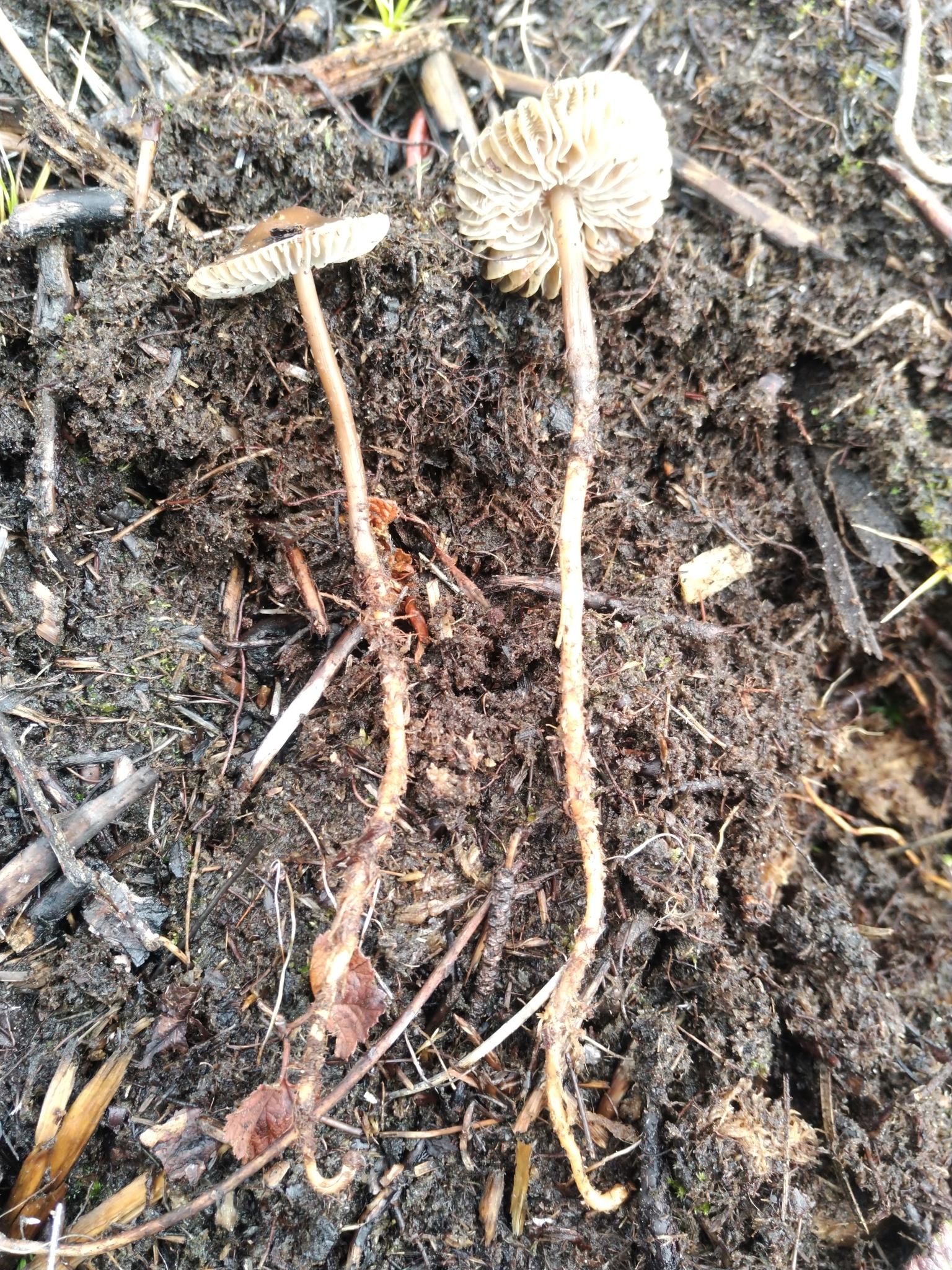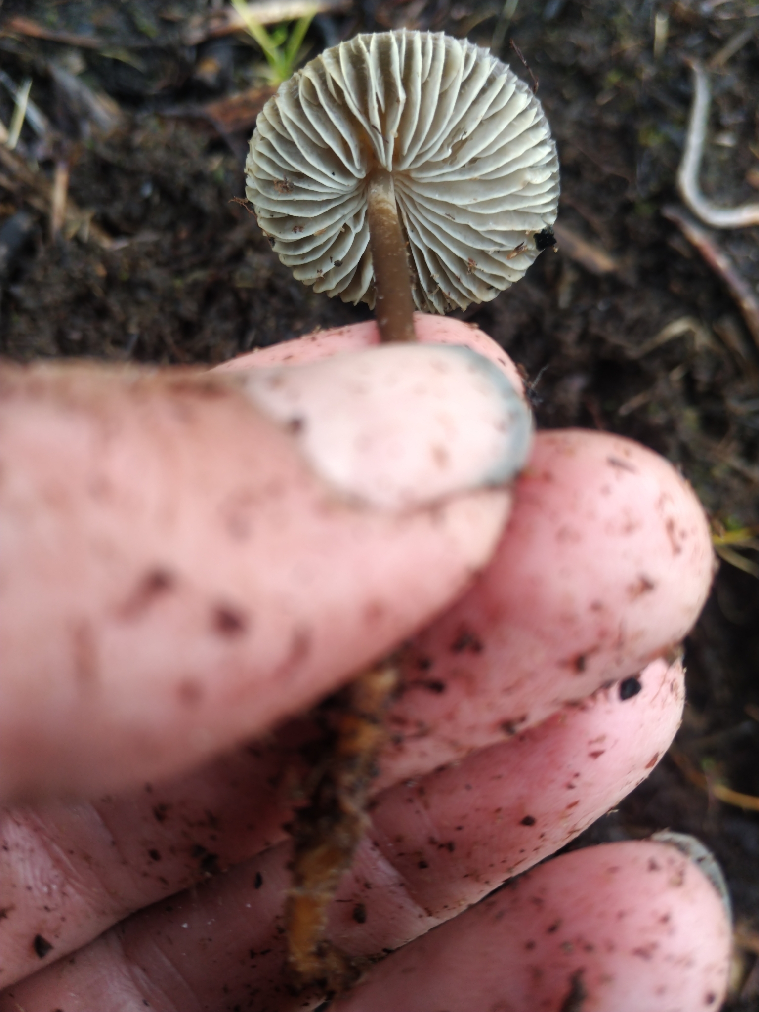 Hut 1—3 cm im Durchmesser, kegelförmig bis gewölbt mit einem prominenten Umbo; graubraun mit dunklerem, fast schwarzem Zentrum; gerieft.Stiel 20—40x2—3 mm, Basis oft wurzelnd; graubraun; Basis oft mit feinen, weißen Haaren.Fleisch weißlich; dünn in der Mitte; Geschmack leicht rettichartig, Geruch nicht vorhanden.Lamellen angewachsen mit herablaufendem Zahn; weiß, später rosa-grau getönt.Sporen 8—10x6—7.5µ, breit ellipsoid; amyloid.Sporenabdruck weiß.Cheilozystidien birnenförmig mit warziger Spitze.