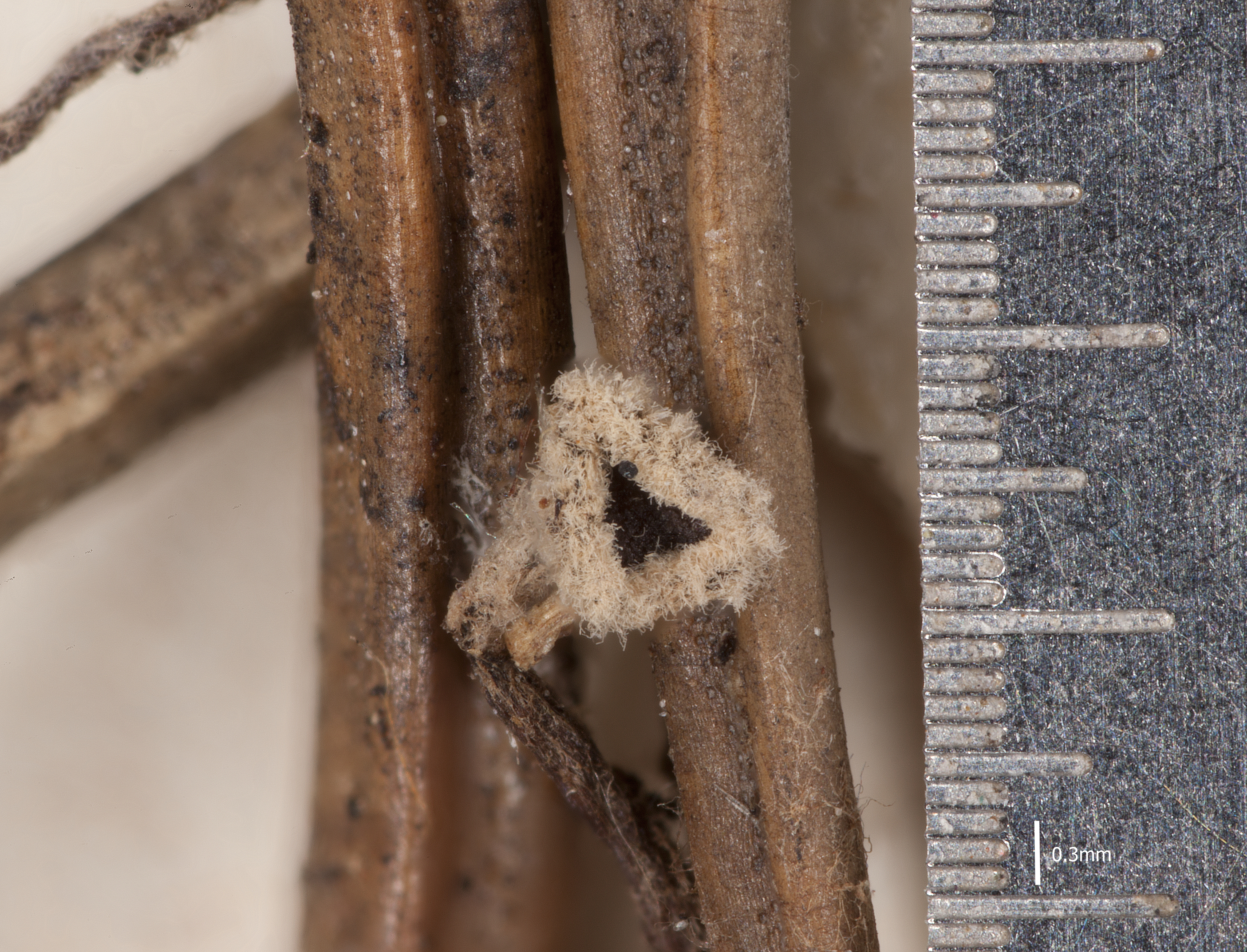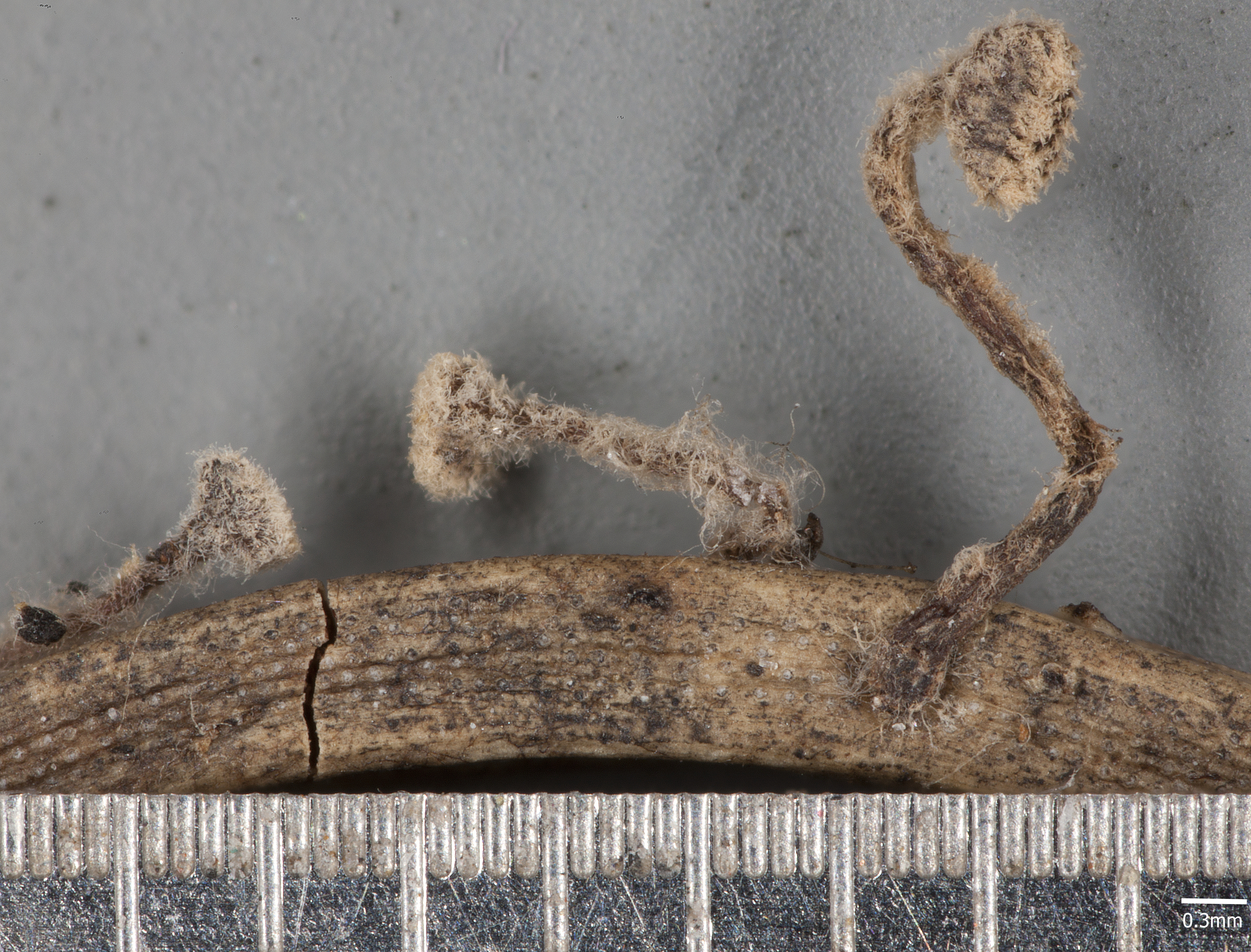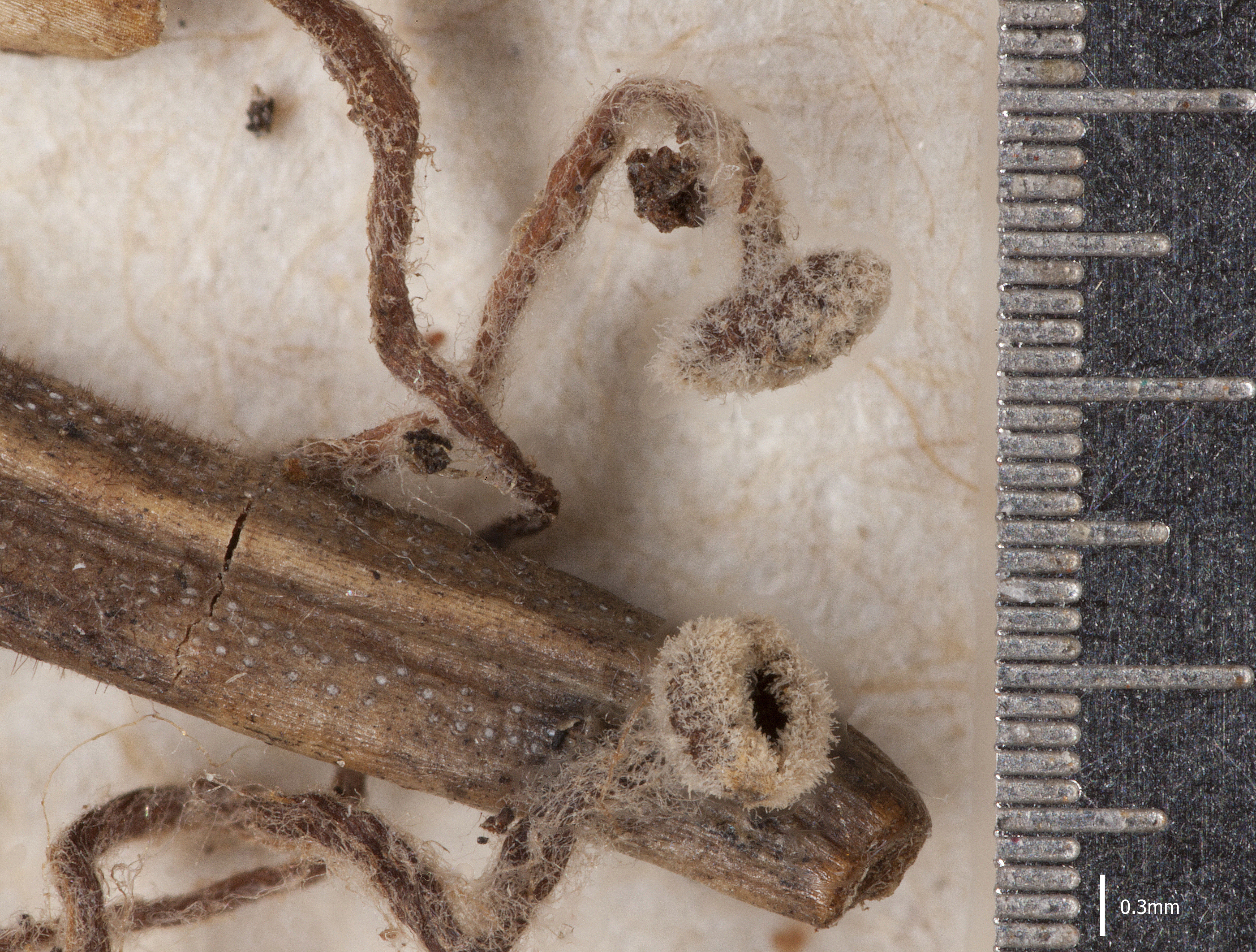 Fruchtkörper: Apothecien vereinzelt, zuerst kugelig geschlossen, rundlich sich öffnend und die ziemlich krugförmige, zart berandete Fruchtscheibe entblössend, 0,3—1,2 mm breit, auf einem 1—3 cm langen, zylindrischen, ziemlich geraden oder gebogenen, 0,2—0,4 mm breiten Stiele sitzend, bräunlich, äusserlich besonders am Rande des Apotheciums weissfilzig von einfachen, kaum septierten, stumpfen, geraden, zuerst farblosen, später schwach bräunlichen, 30—120 µm langen, 3 µm breiten Haaren, gallertwachsartig.