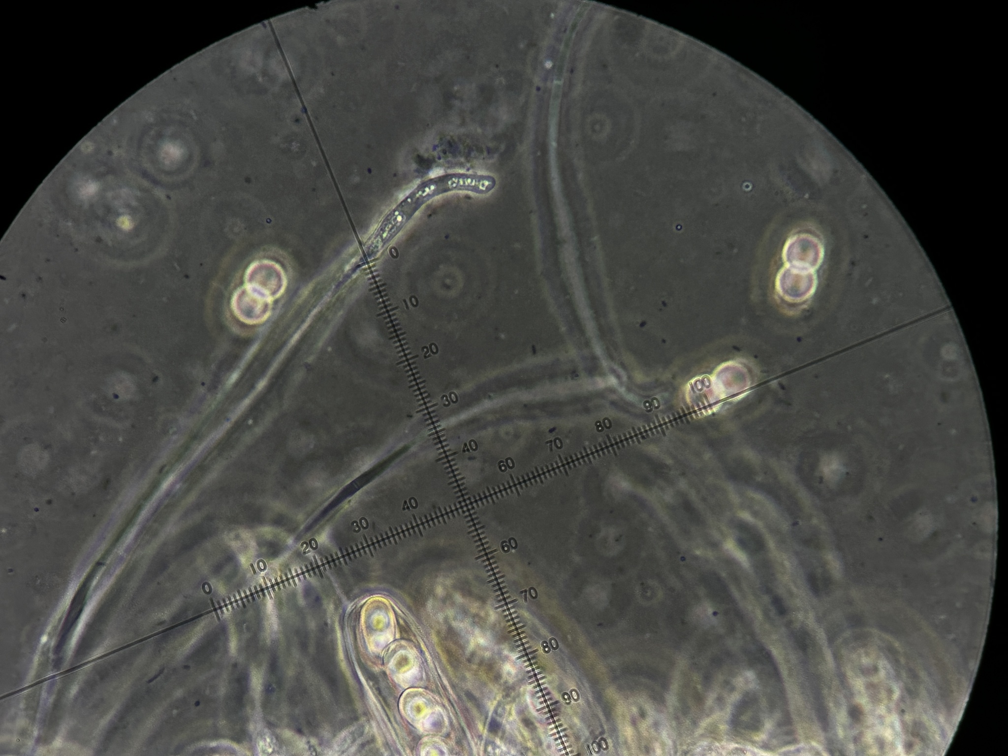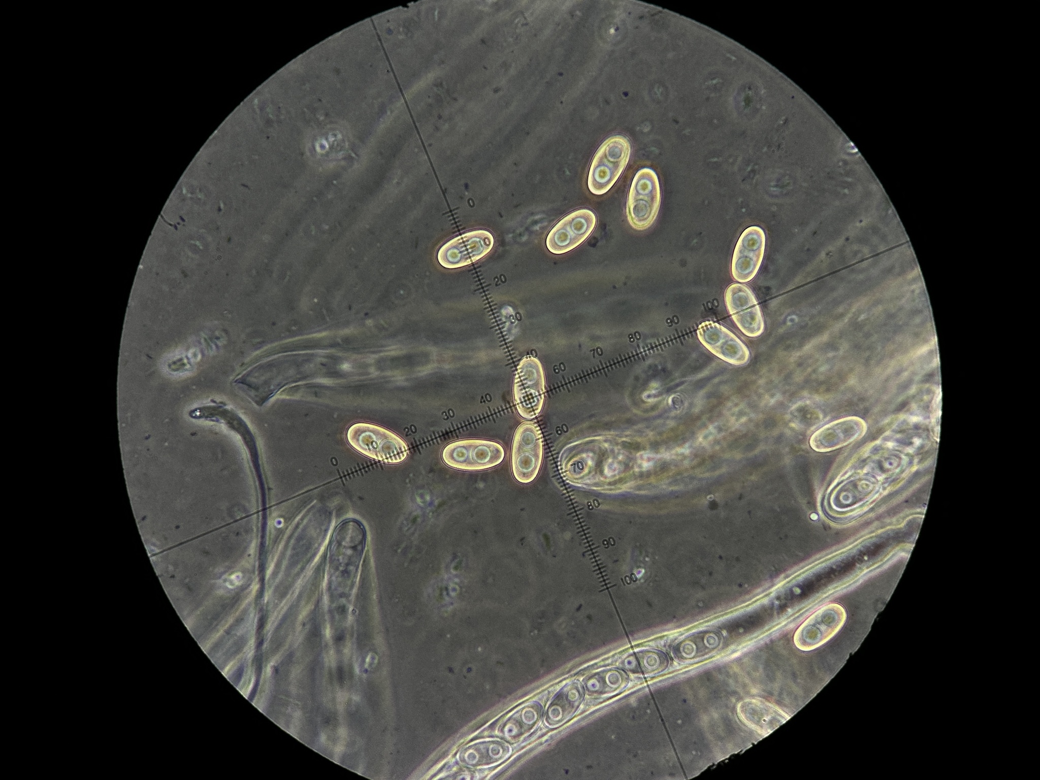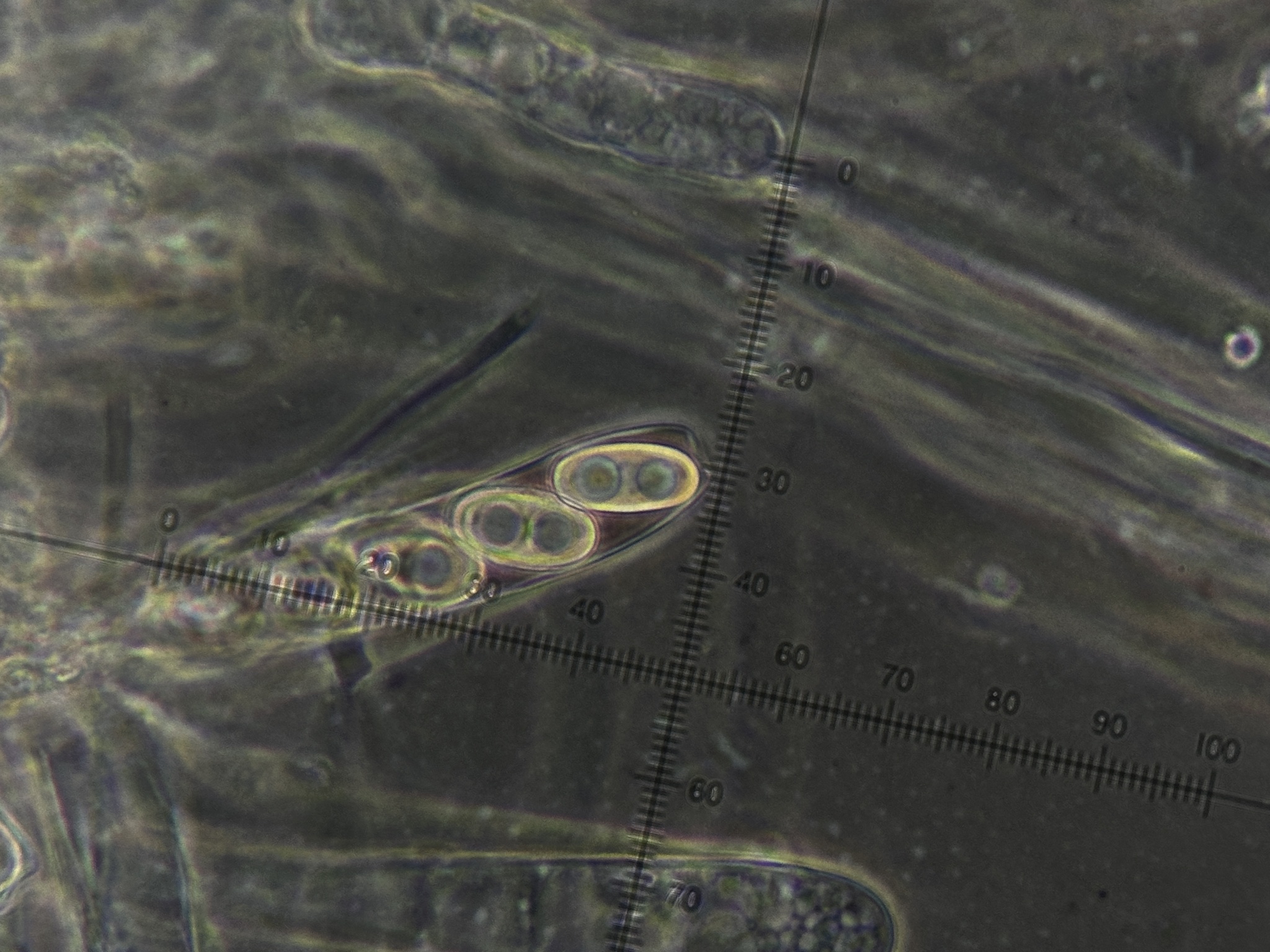 Sporen: Schläuche zylindrisch, oben abgestutzt, ca. 300 u lang, 10 µm breit, achtsporig. Sporen elliptisch, stumpf, äusserlich rauh, einzellig, mit zwei grossen Öltropfen, farblos, 12—14 µm lang, 6—7 µm breit, oben im Schlauch, einreihig liegend. Paraphysen unten gabelig geteilt, septiert, nach oben bis 6 µm breit, gelblich. Jod bläut die Schläuche, besonders deren Spitze.