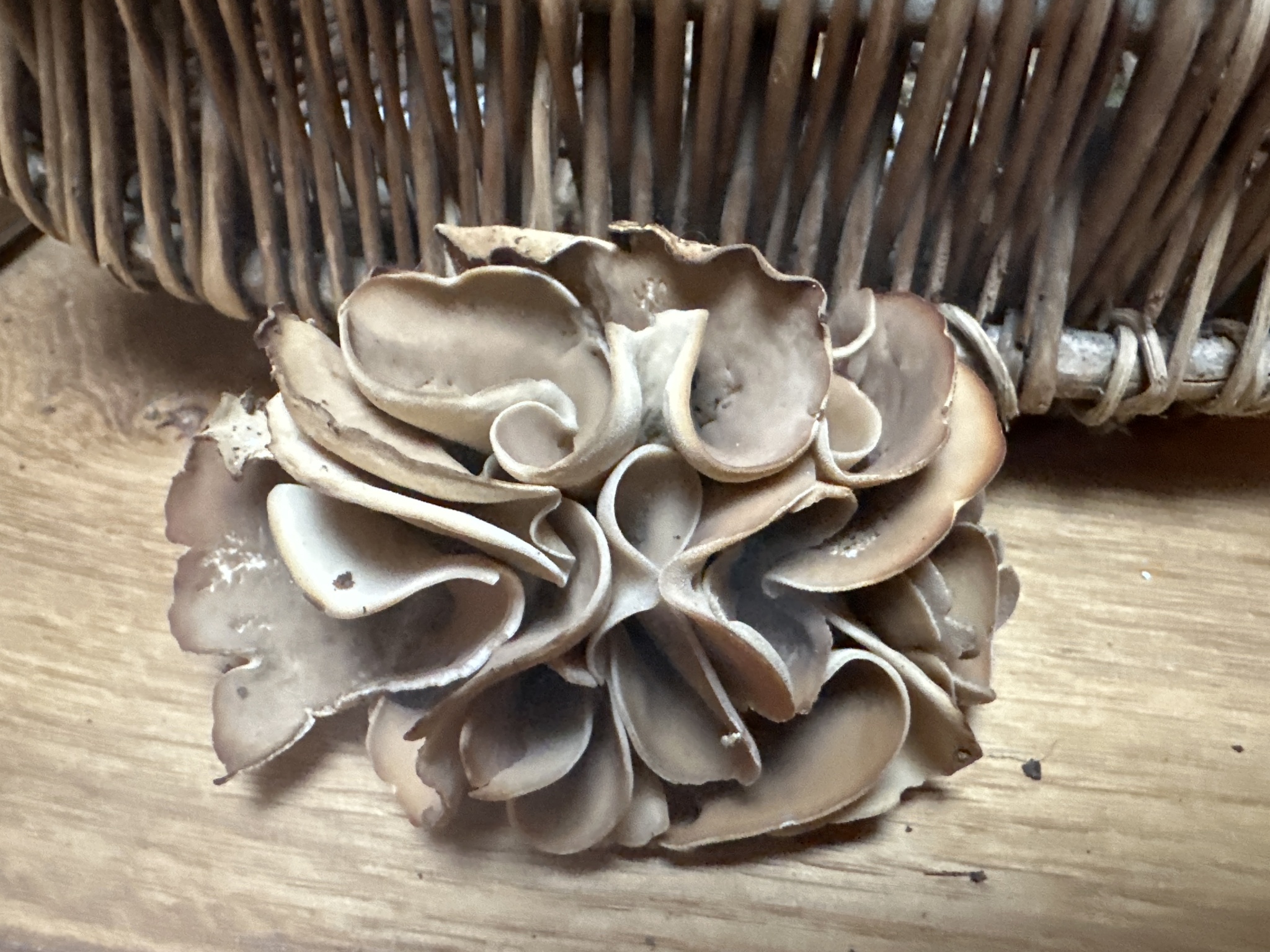 Fruchtkörper: Apothecien rasenweise, sitzend, mit krugförmiger, später gefalteter, ganz oder eingerissen und verbogen berandeter, bräunlicher, grauer oder blasser Fruchtscheibe, aussen glatt, am Grund etwas stielförmig zusammengezogen, blass lederfarben, 6—8 cm breit, fleischig.