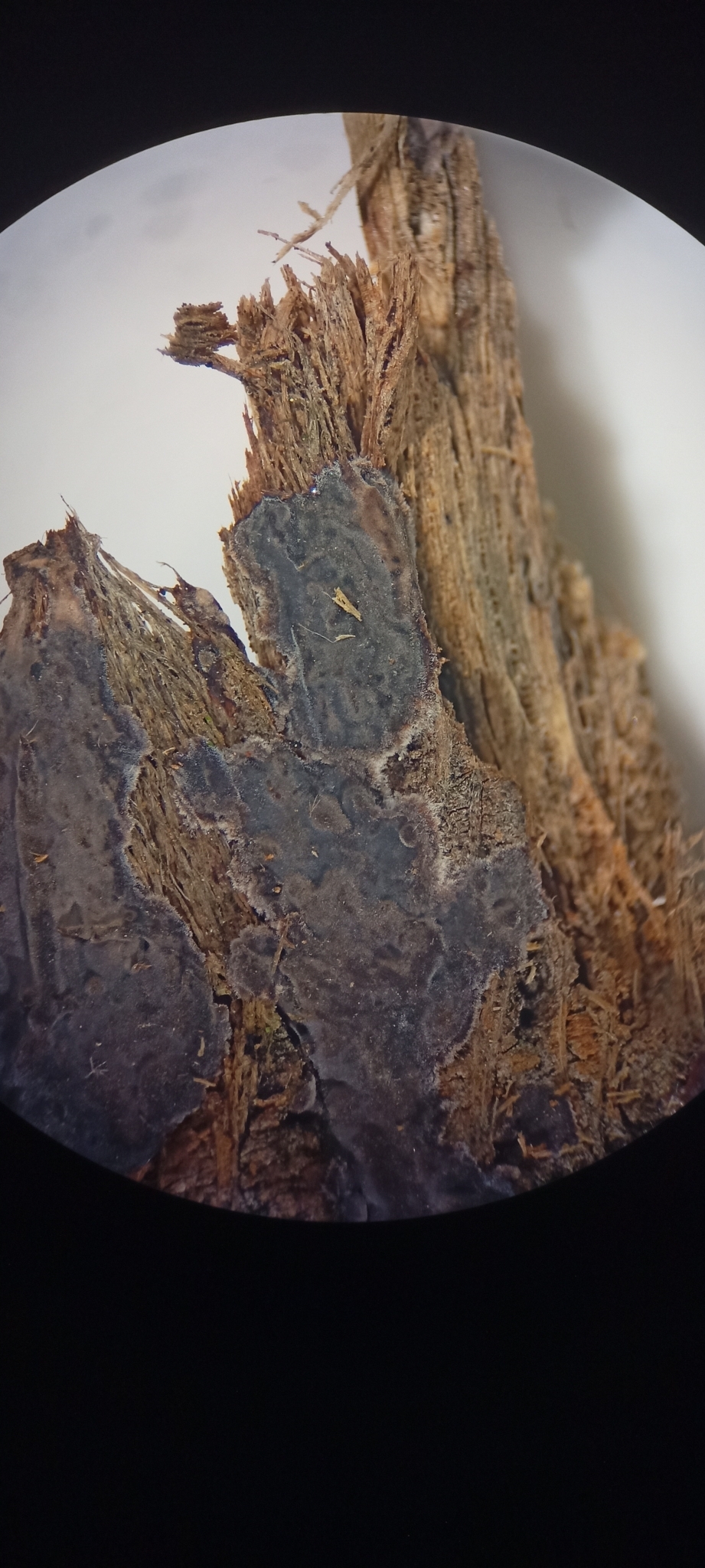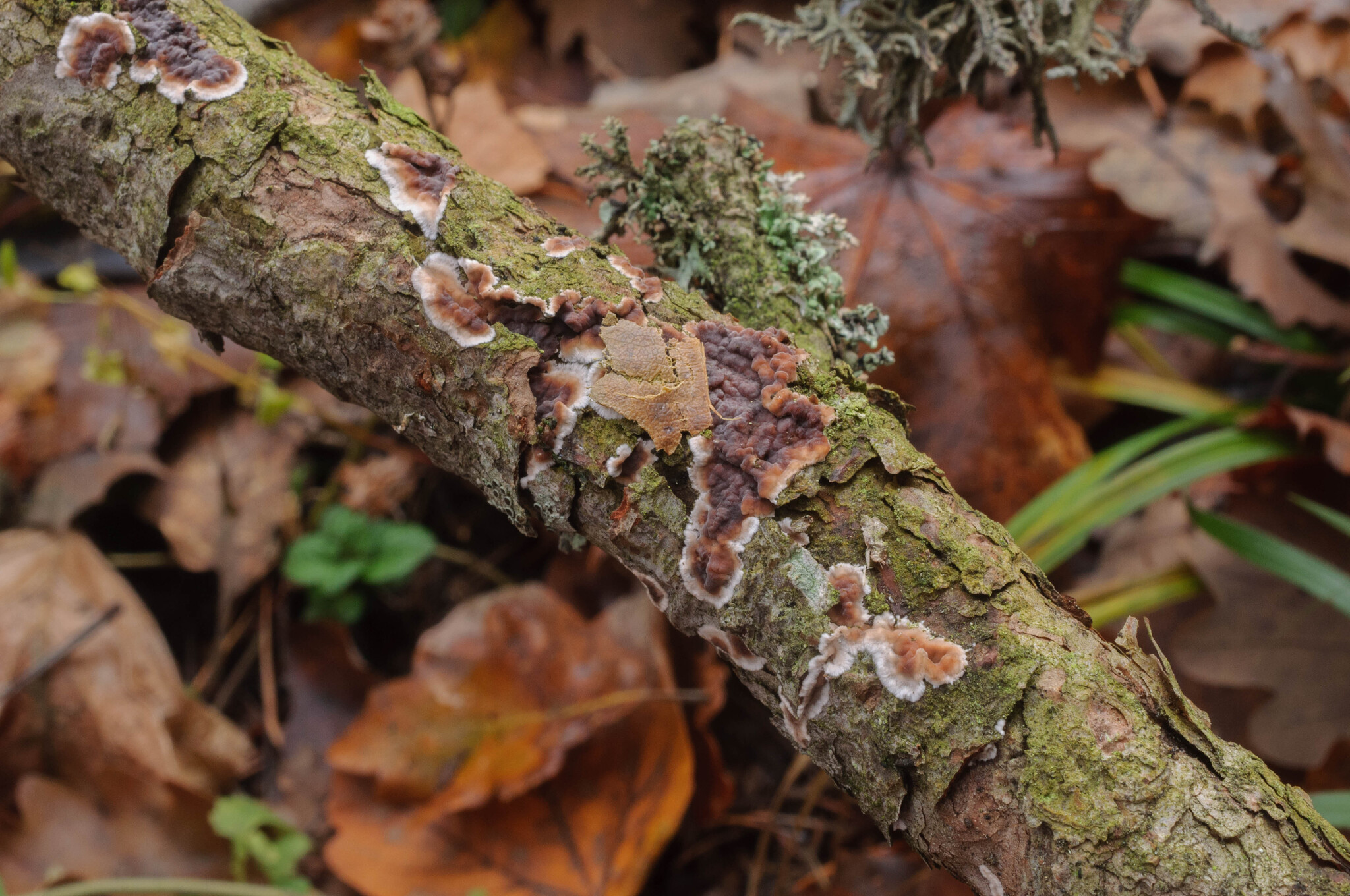 Fruchtkörper: Fruchtkörper frisch knorpelig -lederartig, trocken holzig, anfangs fast schildförmig, klein, mit freiem, rundlich begrenztem, etwas abstehendem Rande, später oft zu grösseren gefelderten Krusten zusammenfliessend. Hymenium höckerig-warzig, violettrötlich oder fleischfarben, trocken heller, grau. Unterseite schwärzlich, glatt.