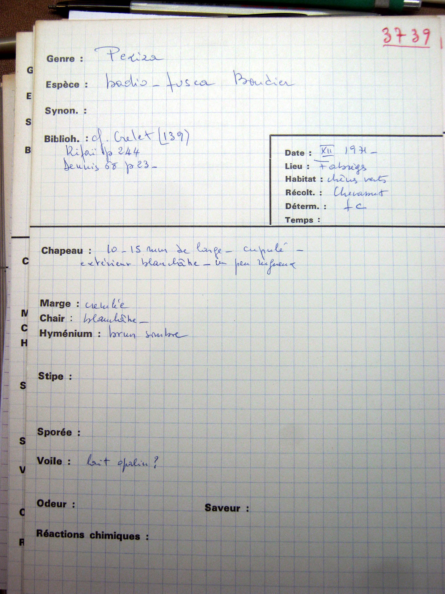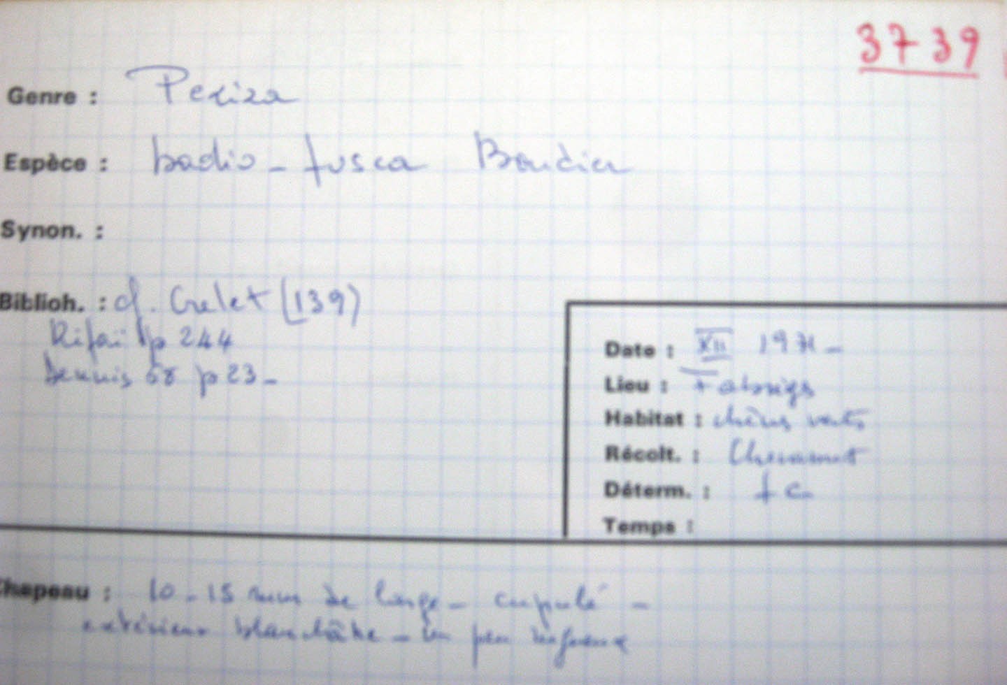 Fruchtkörper: Apothecien sitzend, einerseits von unten bis oben gespalten, schüssel- oder ohrförmig sich erweiternd und andrerseits verlängernd, die uneben wellig und dick berandete, umbrabraune Fruchtscheibe entblössend, aussen heller, glatt, nach unten kurz stielartig verschmälert, 2—3 cm hoch und breit, fleischig.