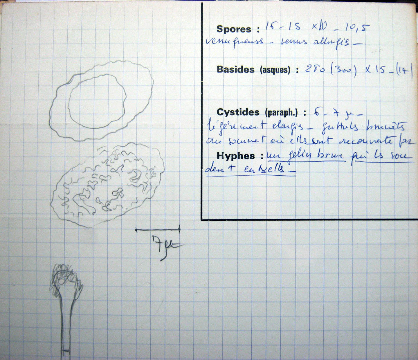 Sporen: Schläuche zylindrisch, oben abgestutzt, ca. 200 µm lang, 12 µm breit, achtsporig. Sporen elliptisch, stumpf, rauh, einzellig mit einem grossen öltropfen, farblos, 15 bis 18 µm lang, 8—9 µm breit, einreihig liegend. Paraphysen fädig, septiert, oben bis 6 µm breit und gelblich. Jod bläut die Schläuche stark.