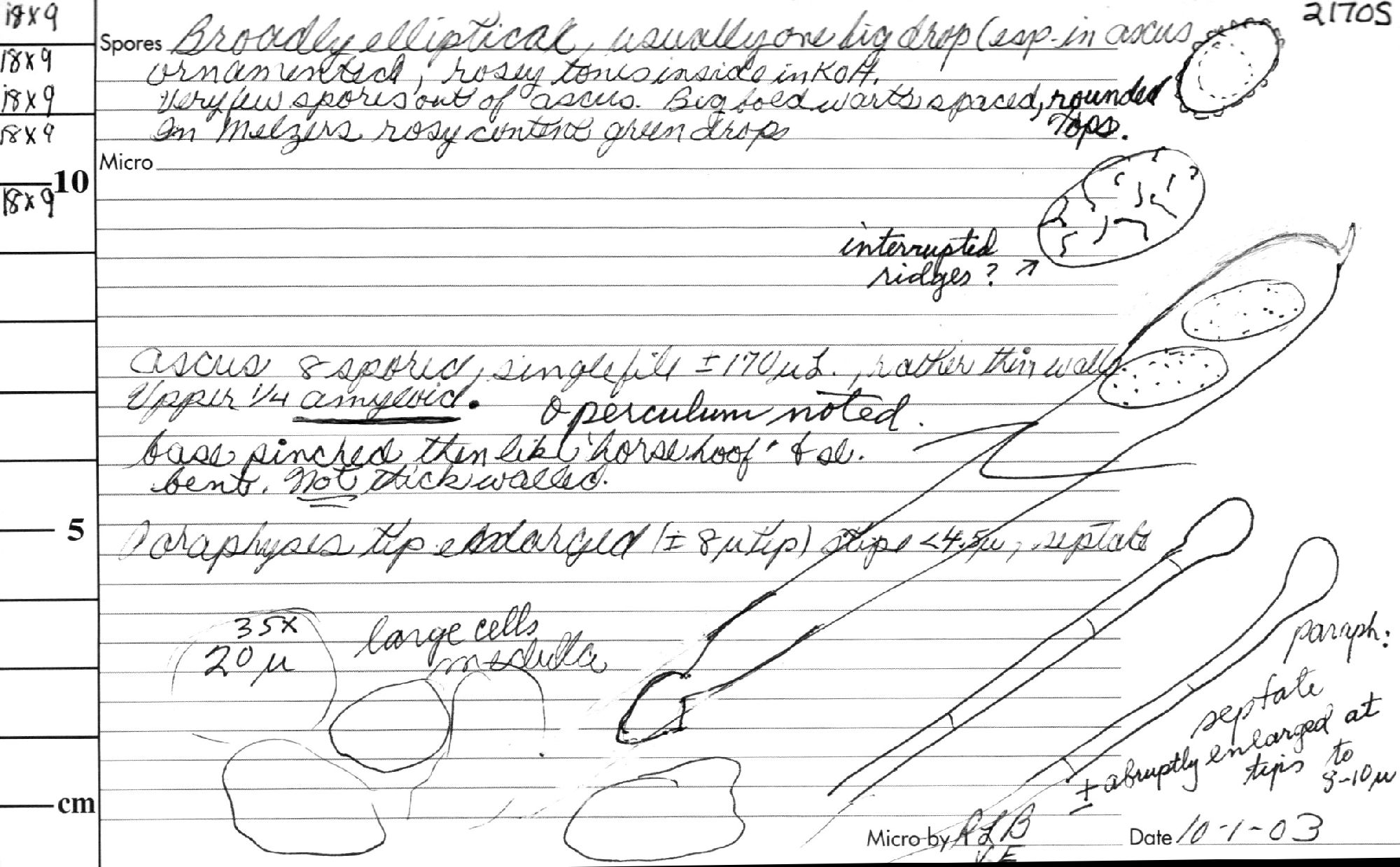 Sporen: Schläuche zylindrisch, oben abgestutzt, ca. 250 µm lang, 15 µm breit, achtsporig. Sporen elliptisch, warzig rauh, einzellig, mit ein bis zwei grossen Öltropfen, farblos, 17—20 µm lang, 9—10 µm breit, einreihig liegend. Paraphysen fädig, septiert, oben bis 6 µm breit und bräunlich. Jod bläut die Schlauchspitze.