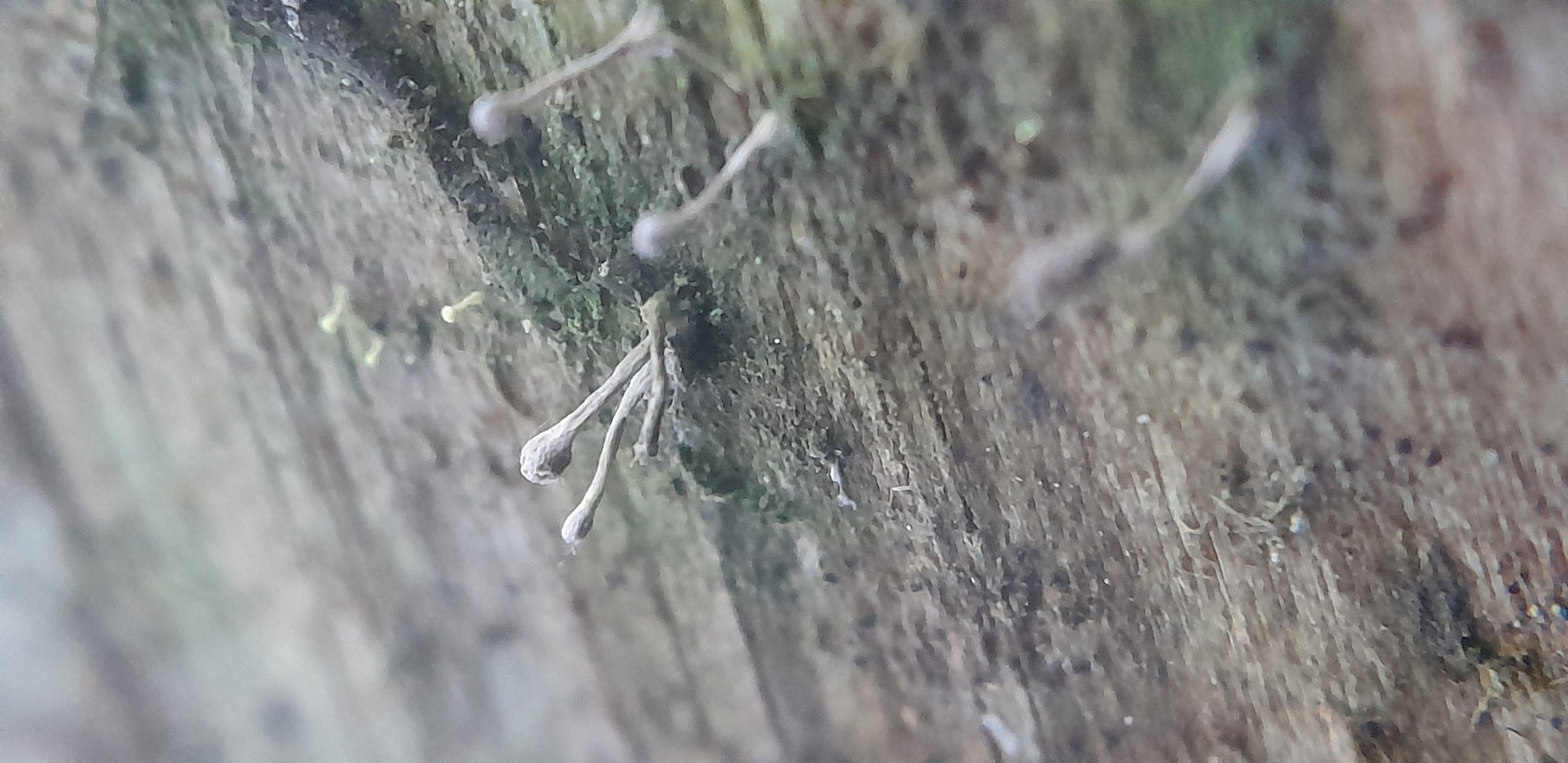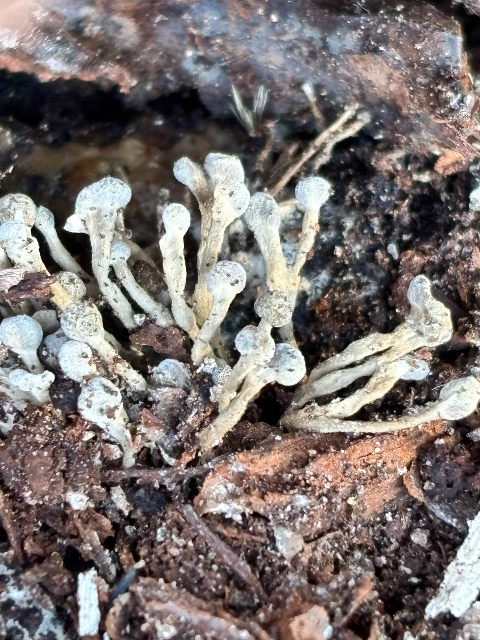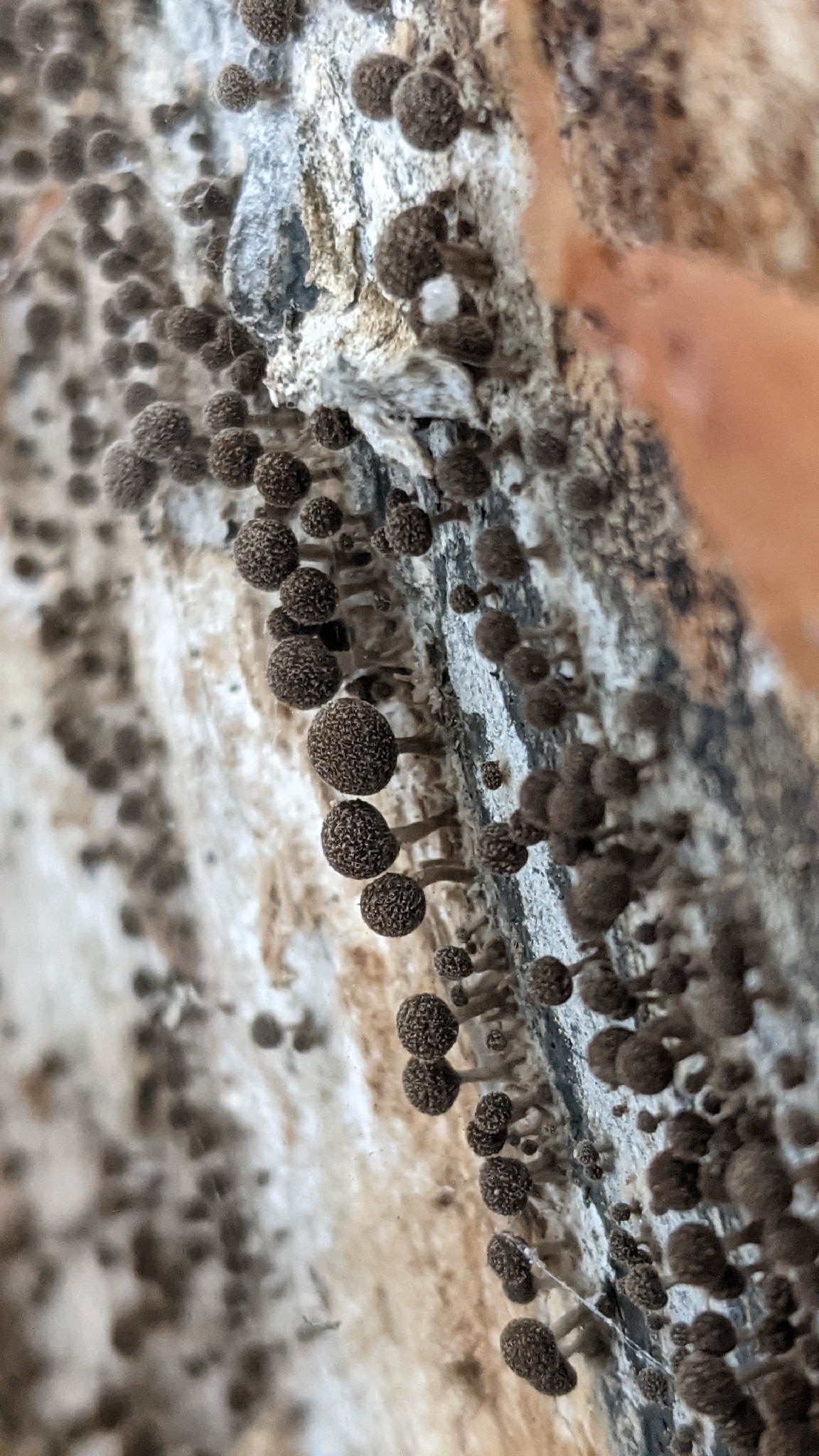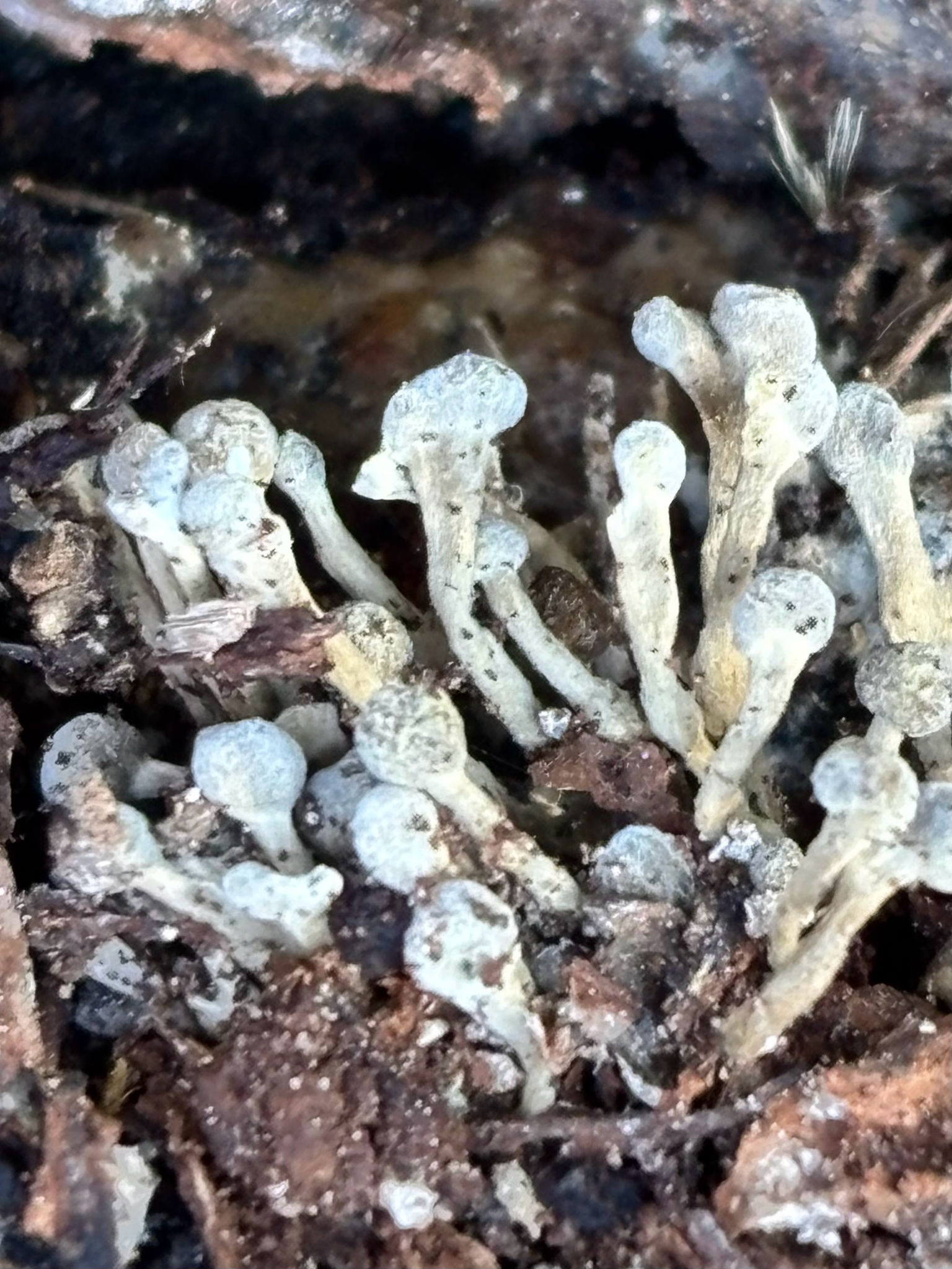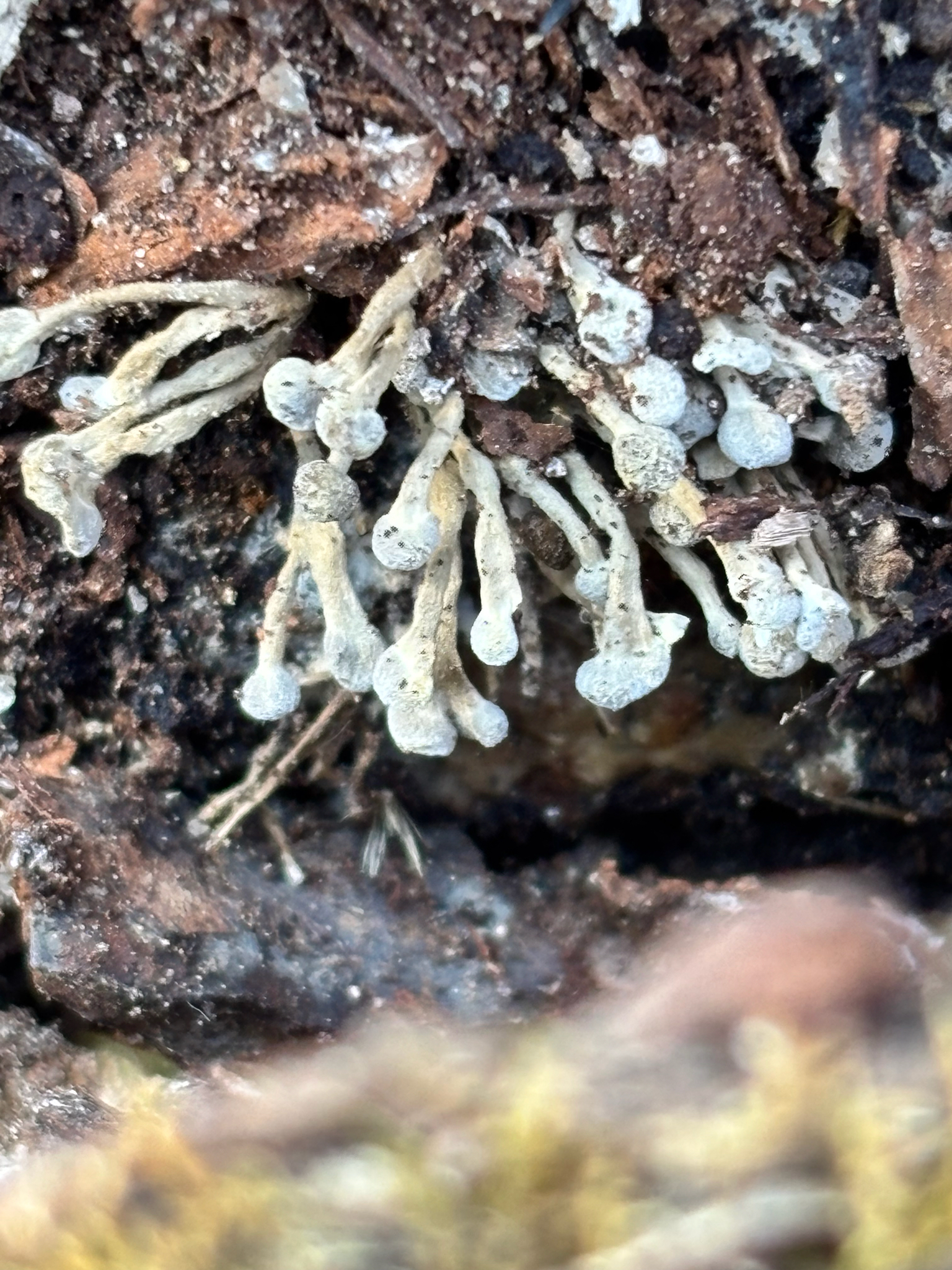 Fruchtkörper: gestielt, köpfchenförmig, jung weiss, später bräunlich, auf zierlichen, bis 1 cm langen dünnen Stielen, die aus parallel nebeneinander verlaufenden, sich oben im Köpfchen garbenförmig ausbreitetnden und die Basidien bildenden Hyphen bestehen.