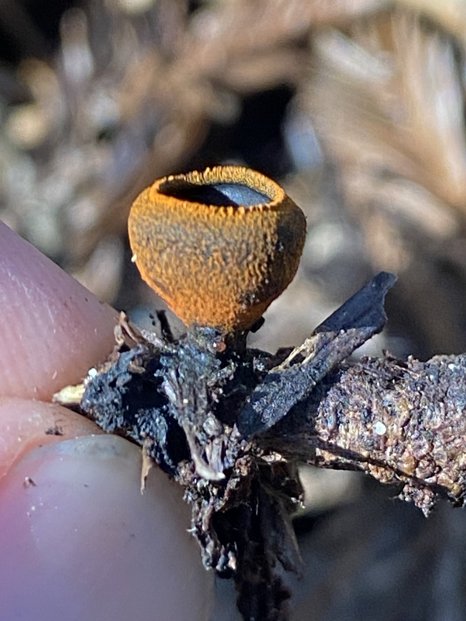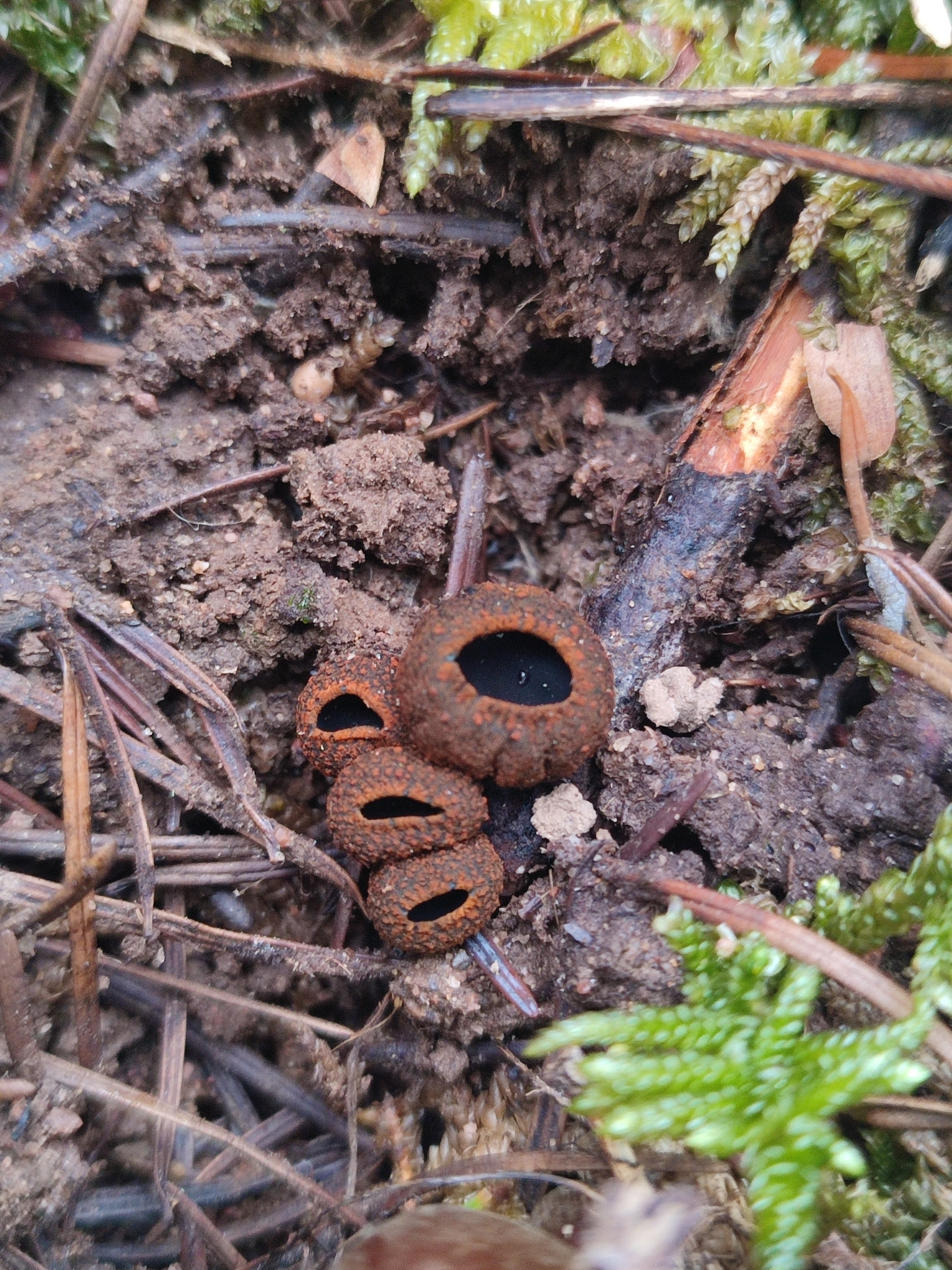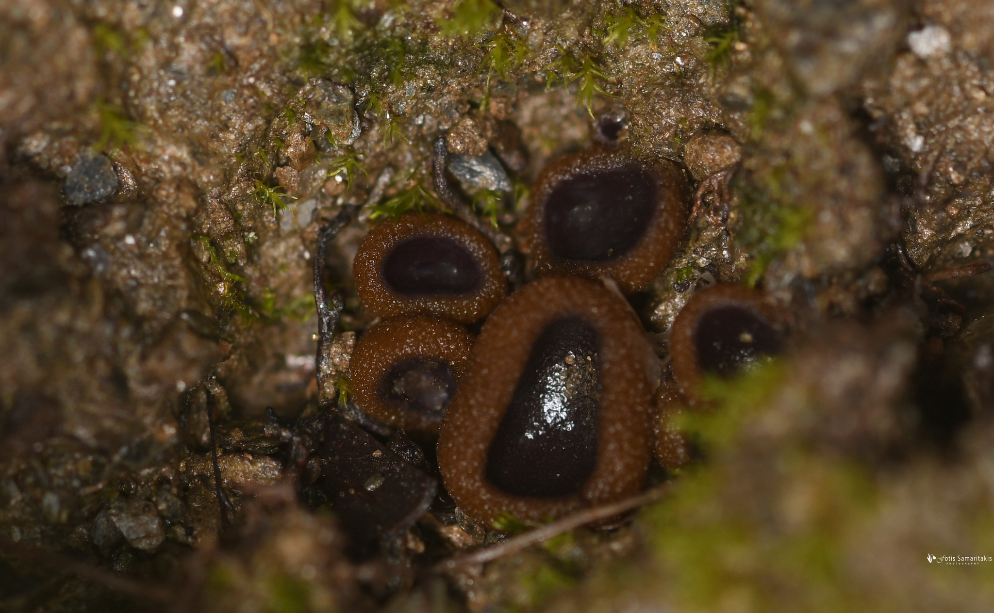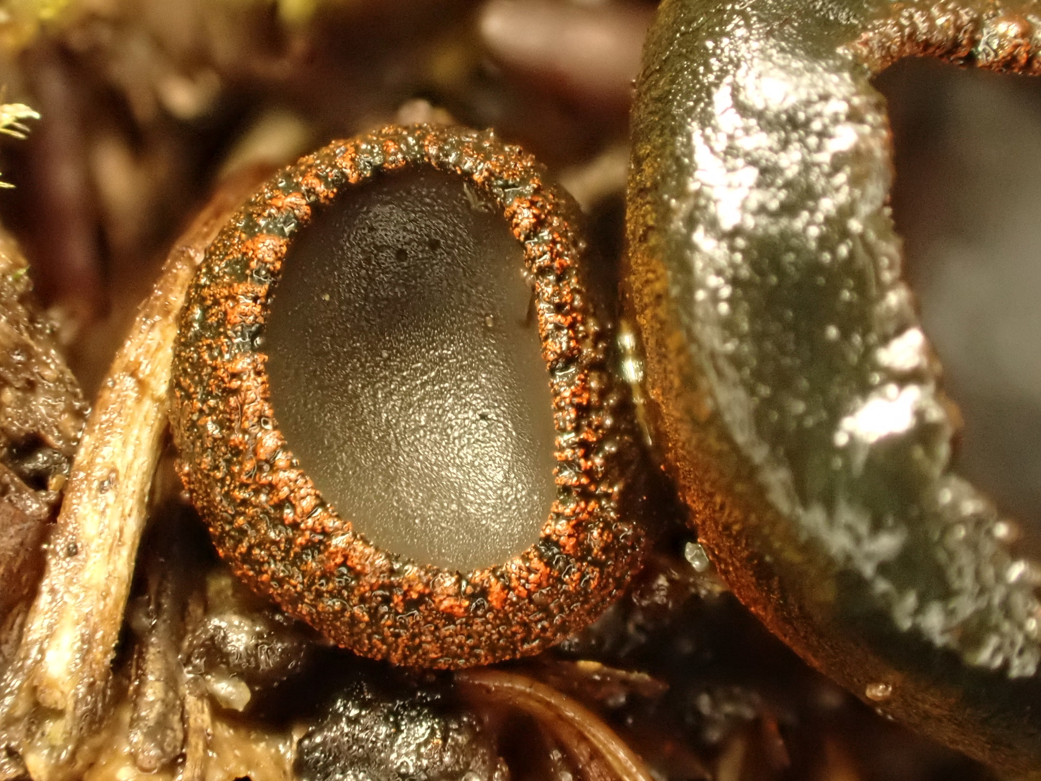 Fruchtkörper: Fruchtkörper einzeln oder in kleinen Büscheln, kurz gestielt, anfangs krugförmig, später schüsseiförmig ausgebreitet,^ 2—4 cm breit, aussen schwärzlich, anfangs runzelig, mit rostroten Schüppchen besetzt. Scheibe schwarz glänzend. Stiel bis 1 cm lang, am Grunde mit einem starken, wurzelartigen Schopf striegeliger, dicker, schwarzbrauner Haare.