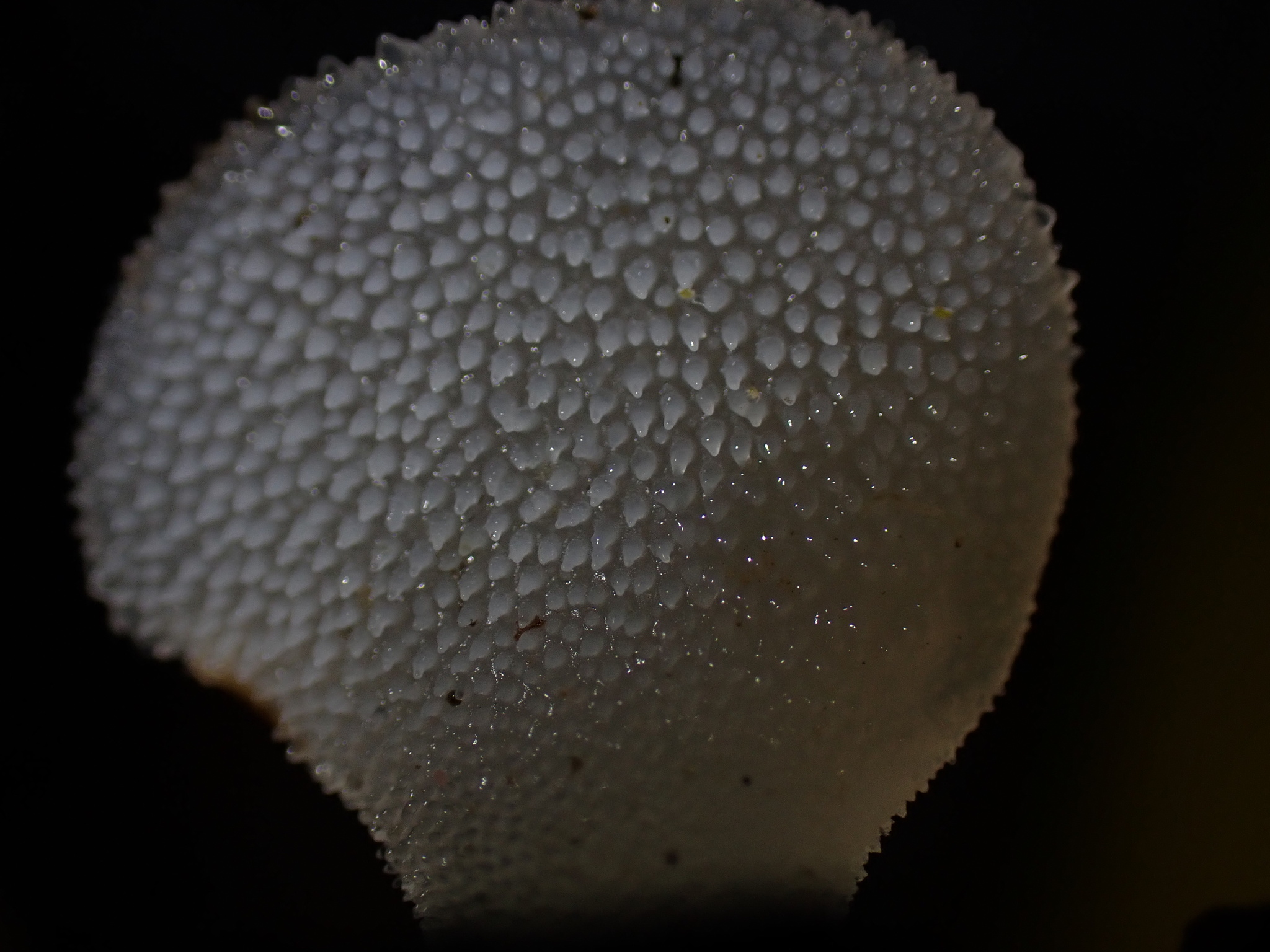 Lamellen: Unterseite dicht mit Stacheln besetzt, mit Hymenium überzogen, Stacheln pyramidenförmig, weich, bläulichgrau