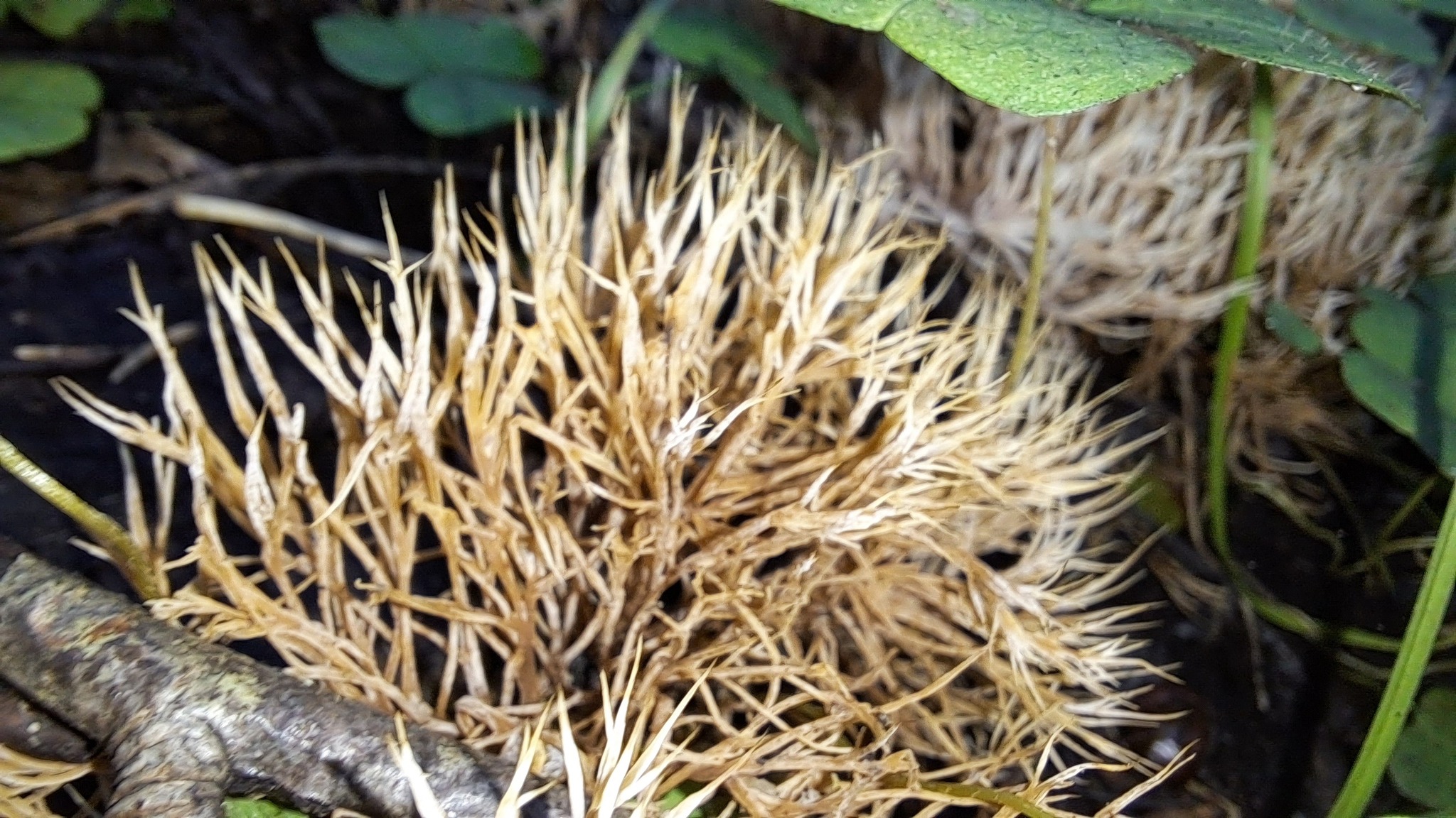 Fruchtkörper: zylindrisch fadenförmig, sparsam verzweigt, dicht gedrängt wachsend, zäh