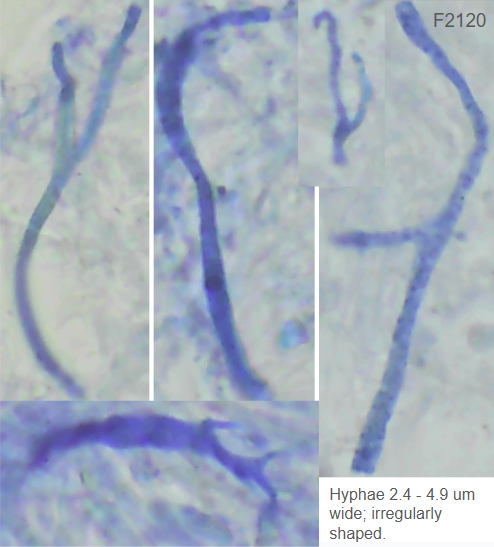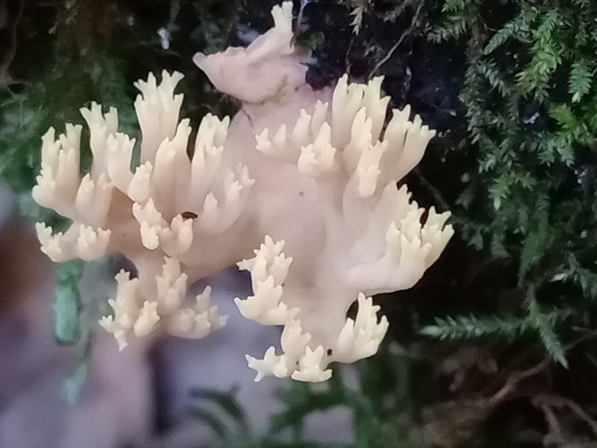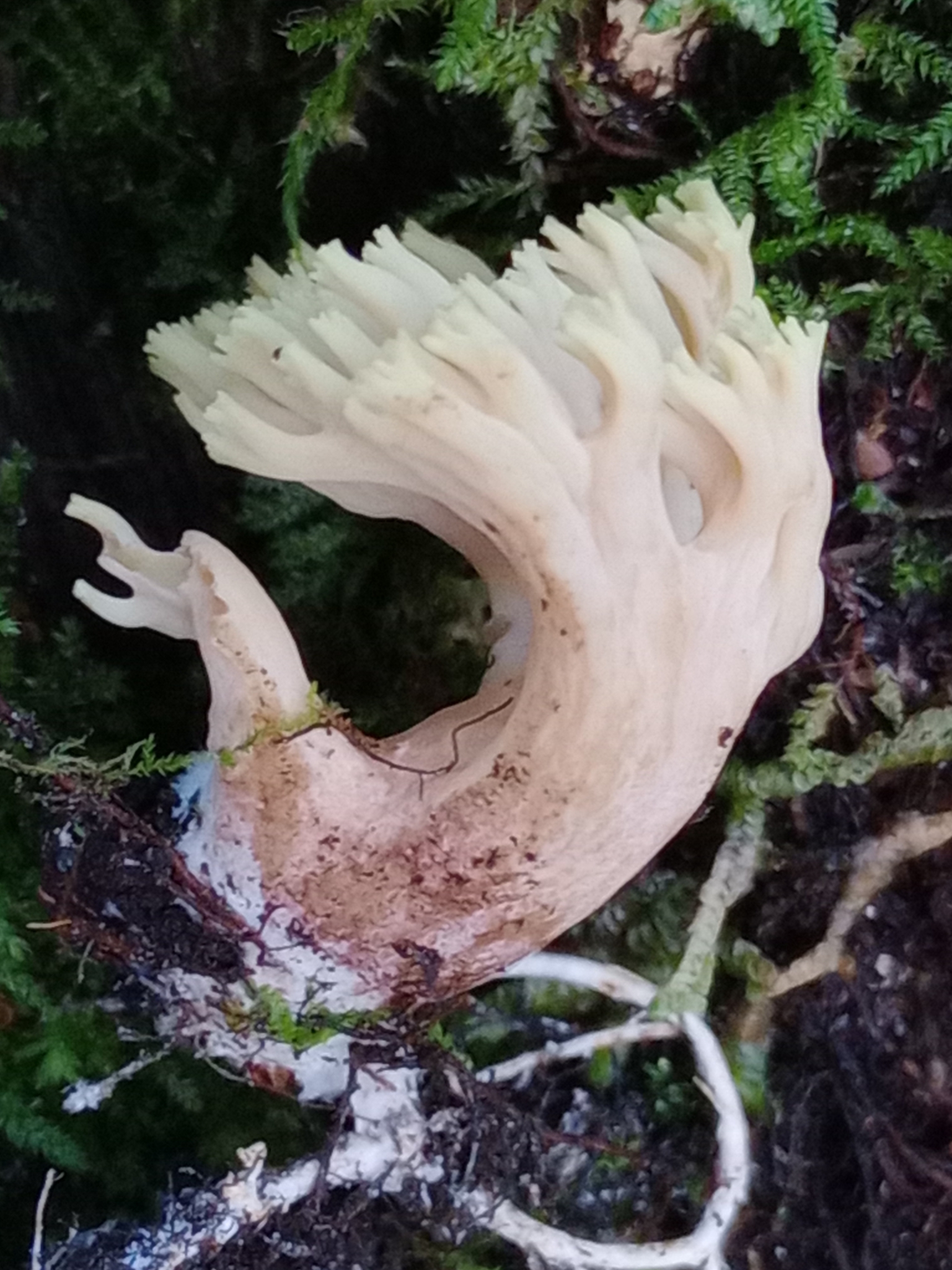 Fruchtkörper: Äste stehen steif aufrecht, fast parallel ausgerichtet und gedrängt, braunocker, bei Druch dunkel bräunend