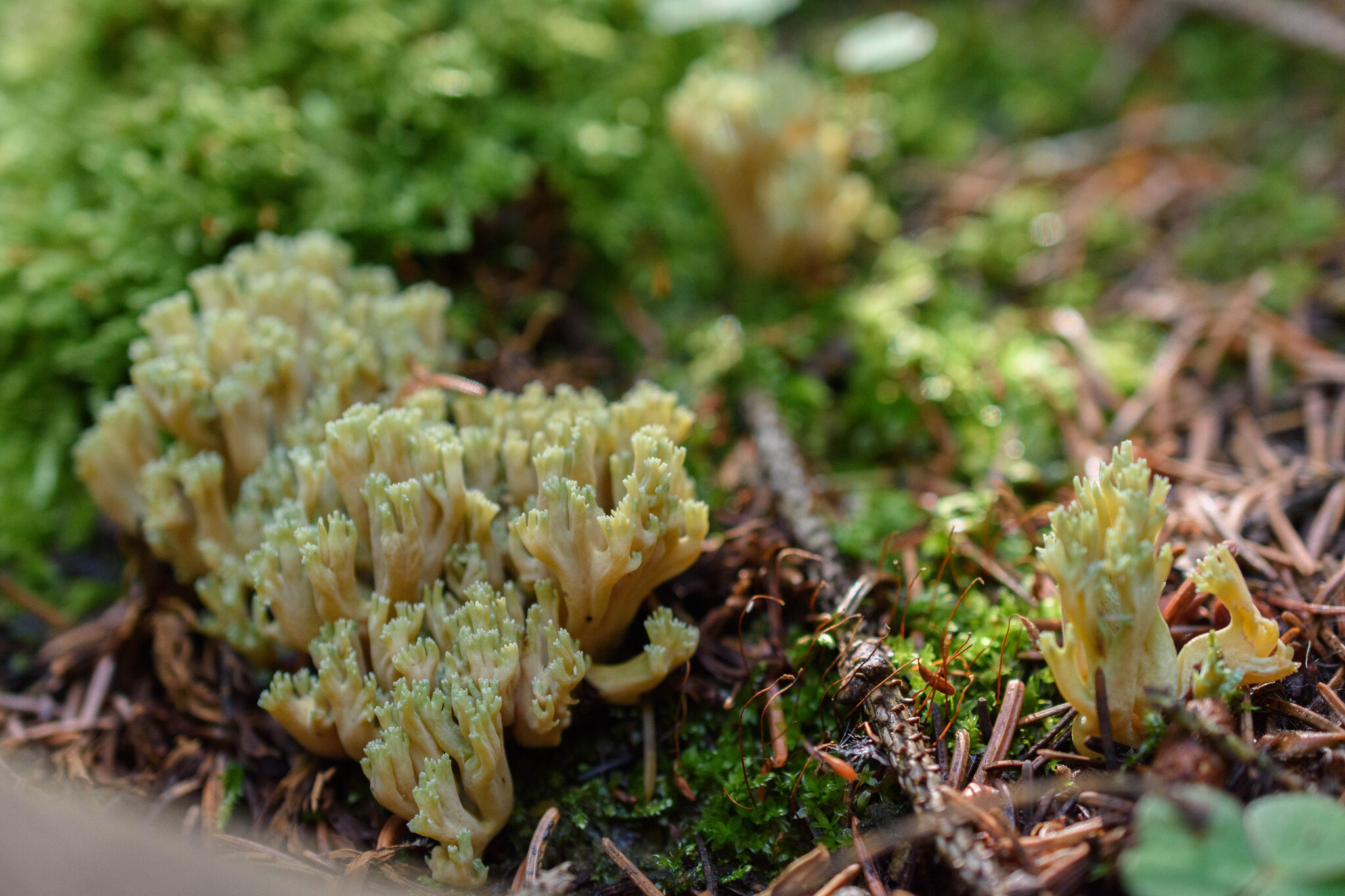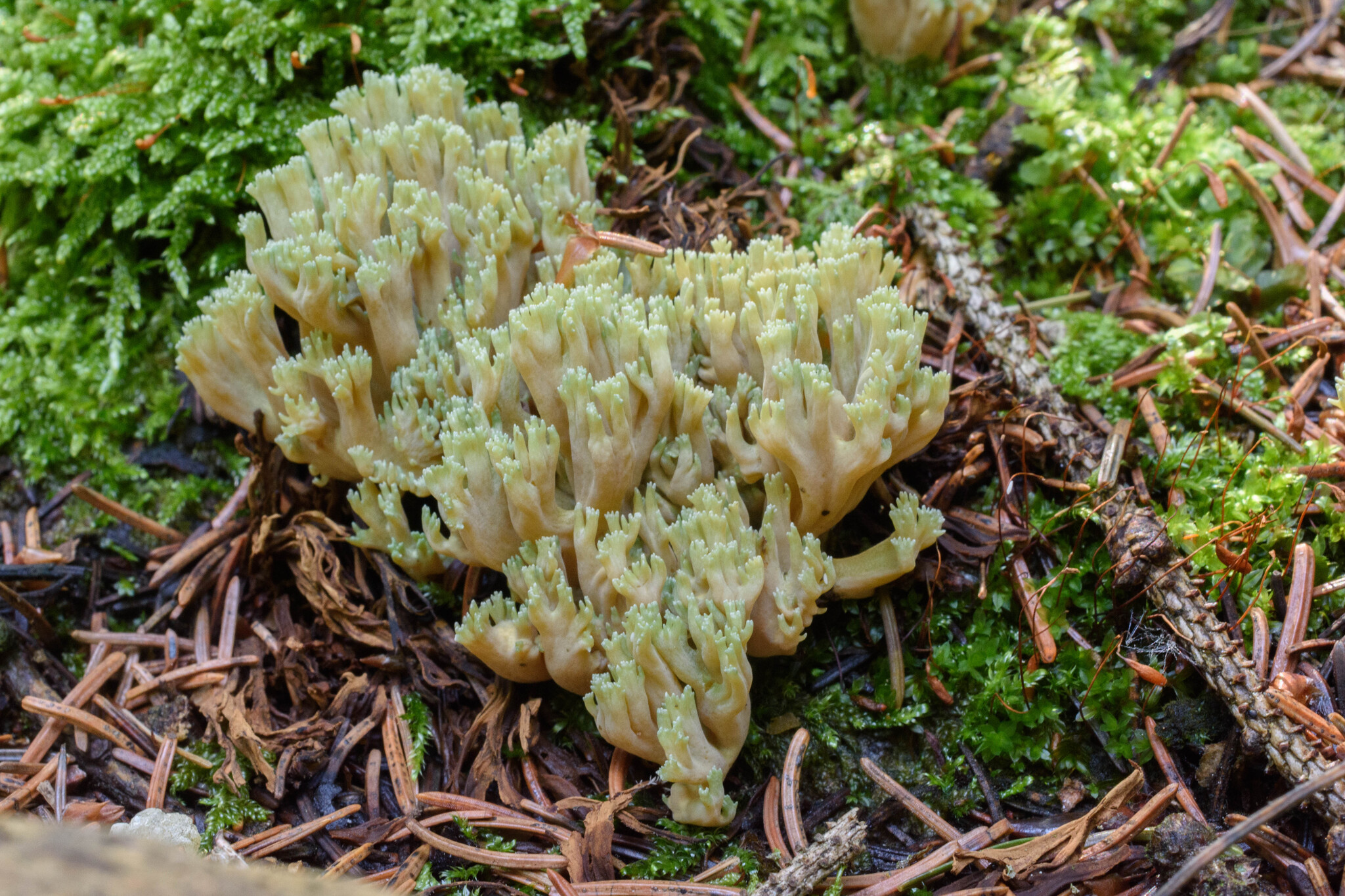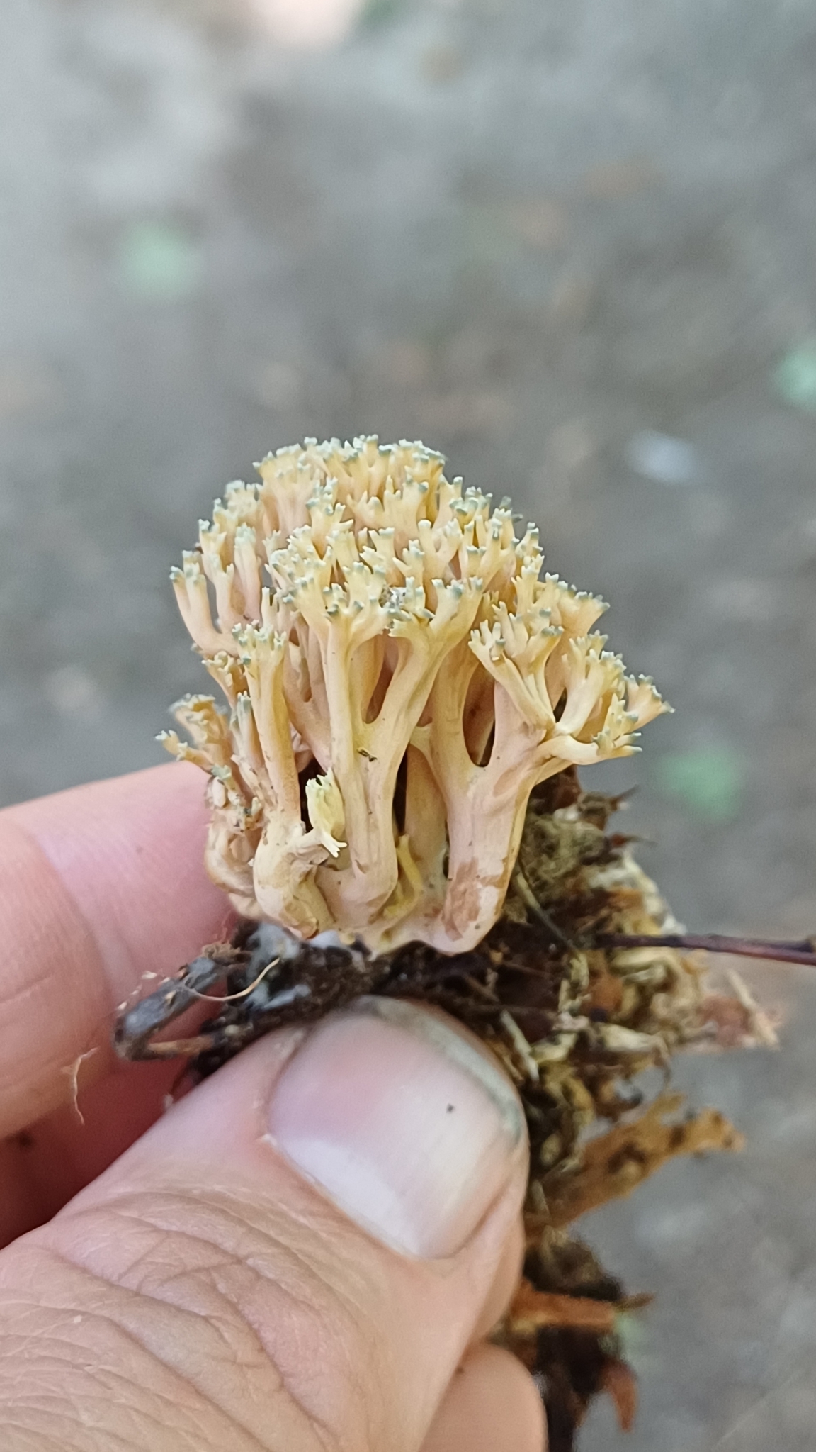Fruchtkörper: rötlich ockergelb mit dichtem Stamm und fast wirbeligen Ästen, 2 -3 fach wiederholt gegabelt, gedrängt, mit grünlichen und sehr spitzen steifen Ästchen